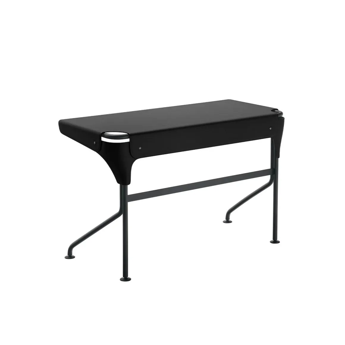 La structure en acier tubulaire noir mat dessine un profil continu et crée le support du plateau mince, constitué d’une seule pièce de cuir qui repose sur la structure, ne laissant que certaines parties découvertes. Un bureau fonctionnel et raffiné dans des matériaux durables et de qualité: un compagnon de travail idéal pour l’environnement domestique et pour l’hospitalité.