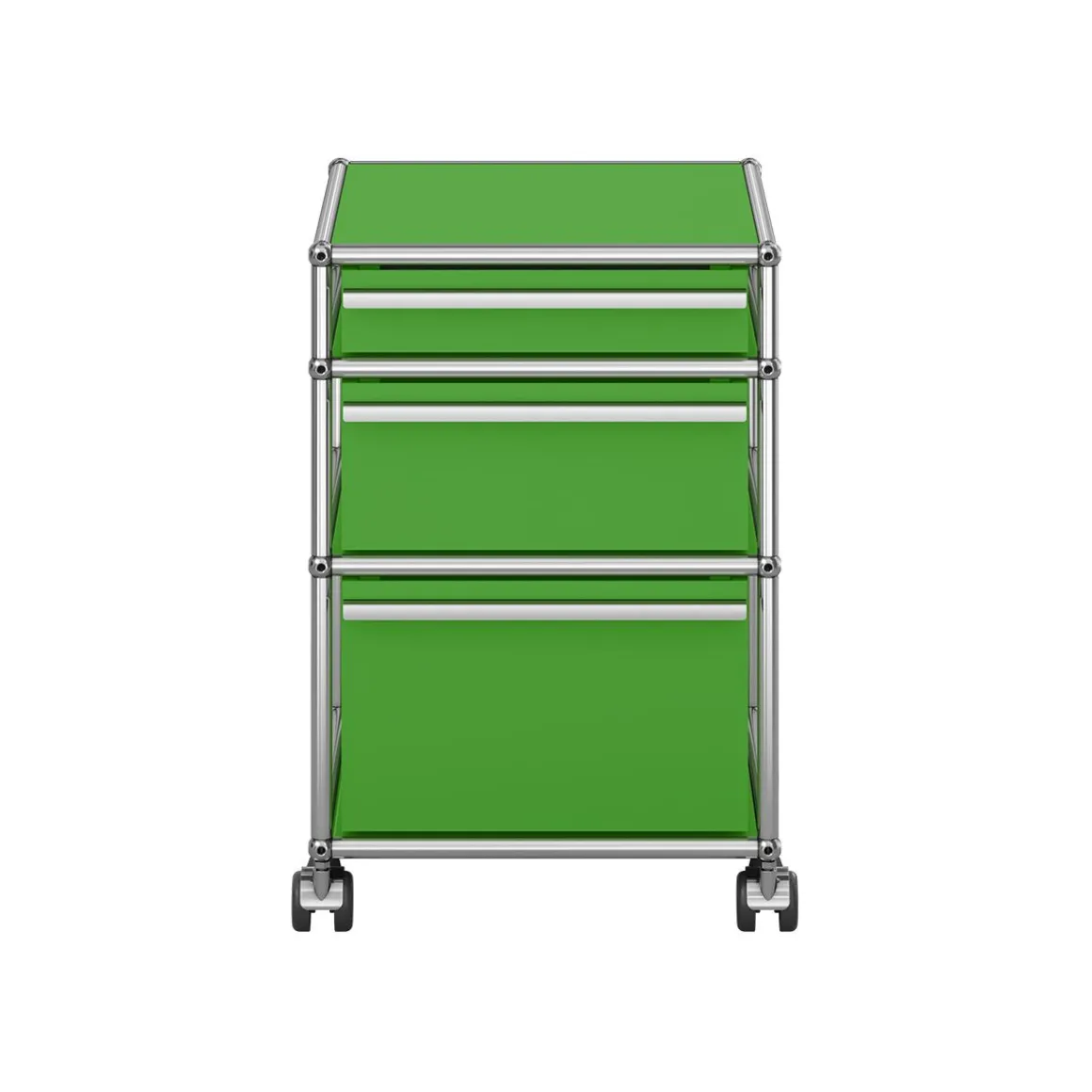 Matériaux : Structure en tubes d’acier chromé assemblés par des boules de connexion, habillée de panneaux d’acier thermolaqué et montée sur roulettes (pour sol dur).
