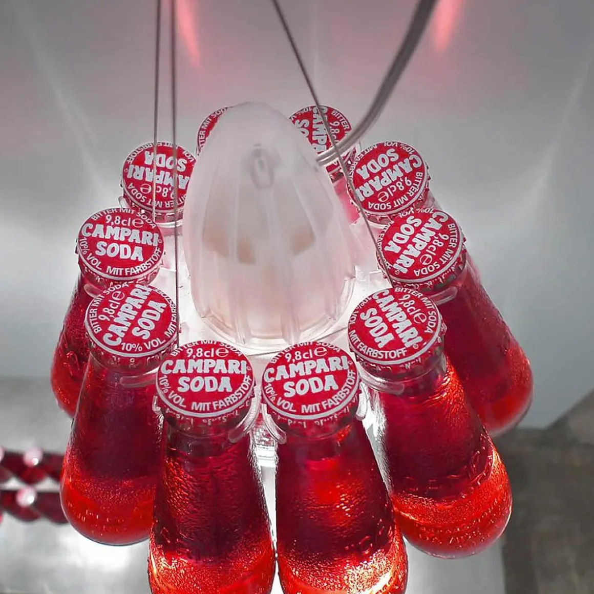 Campari light suspension de Ingo Maurer. Dix bouteilles originales de Campari Soda, détachables individuellement, matière plastique, métal. Réglable en hauteur sans granduation par une capsule Campari.