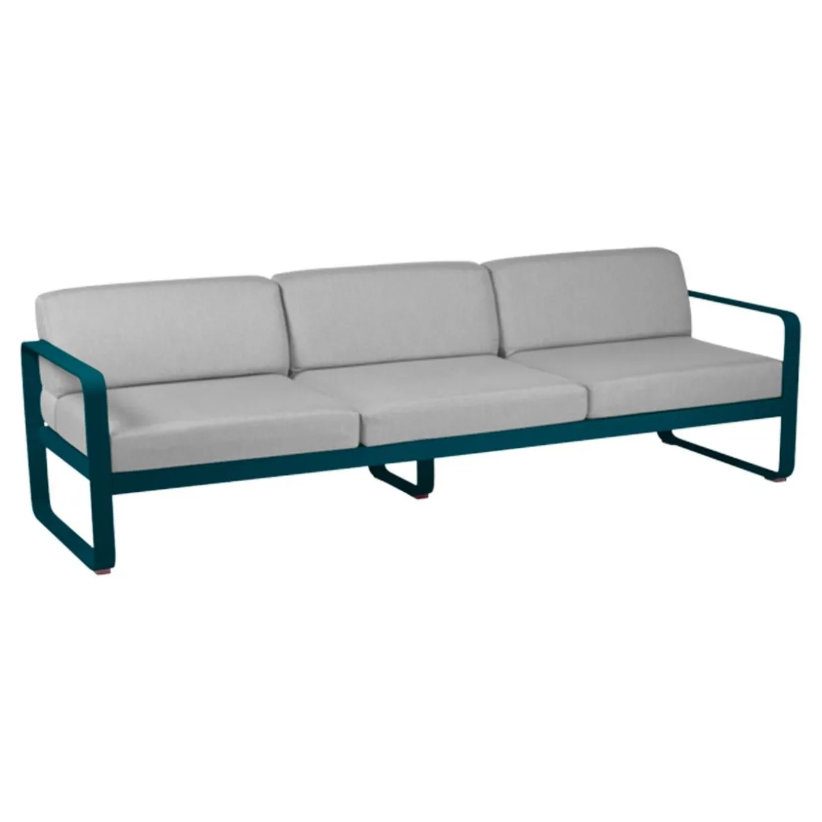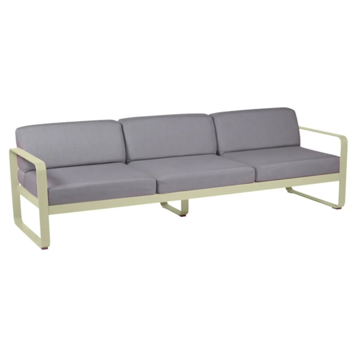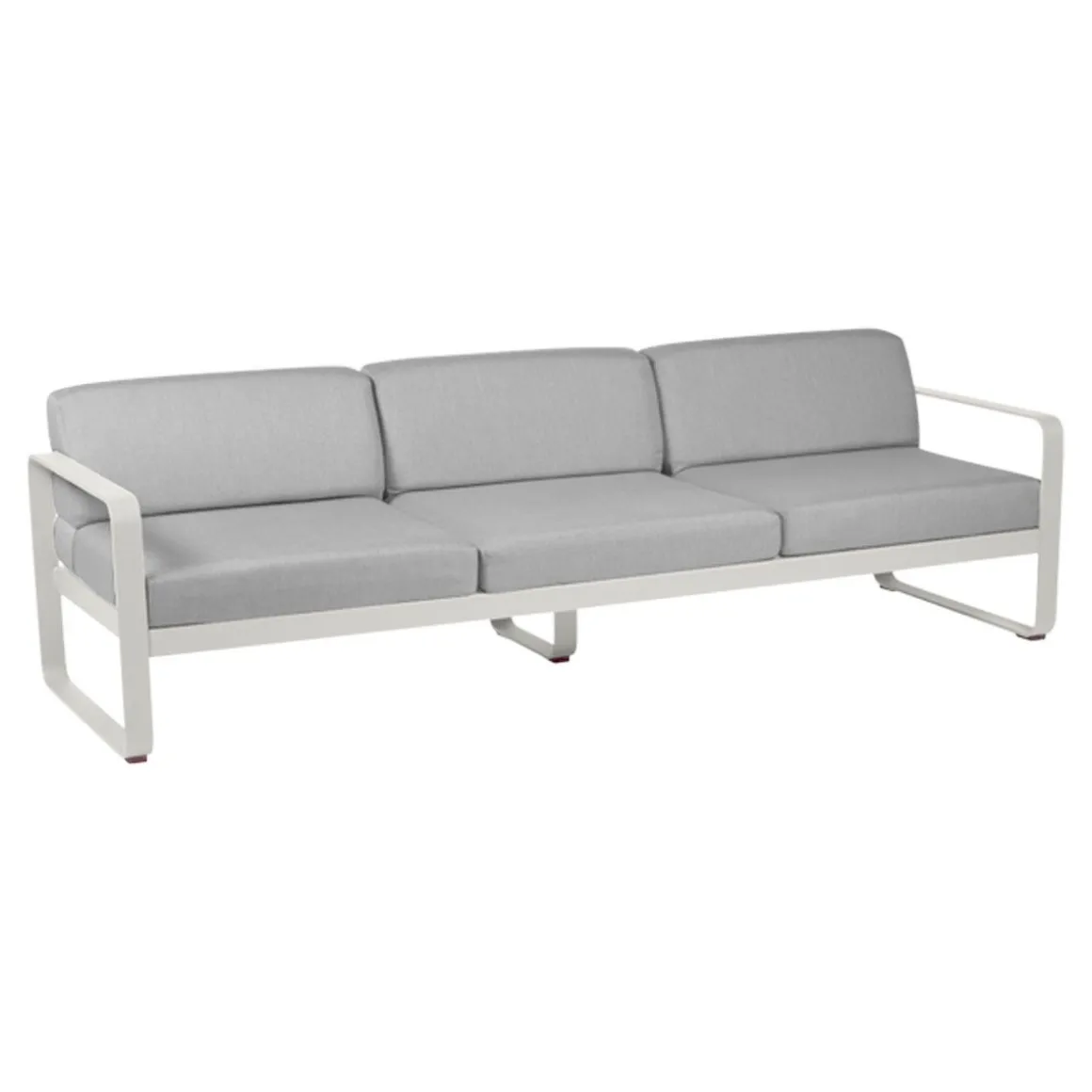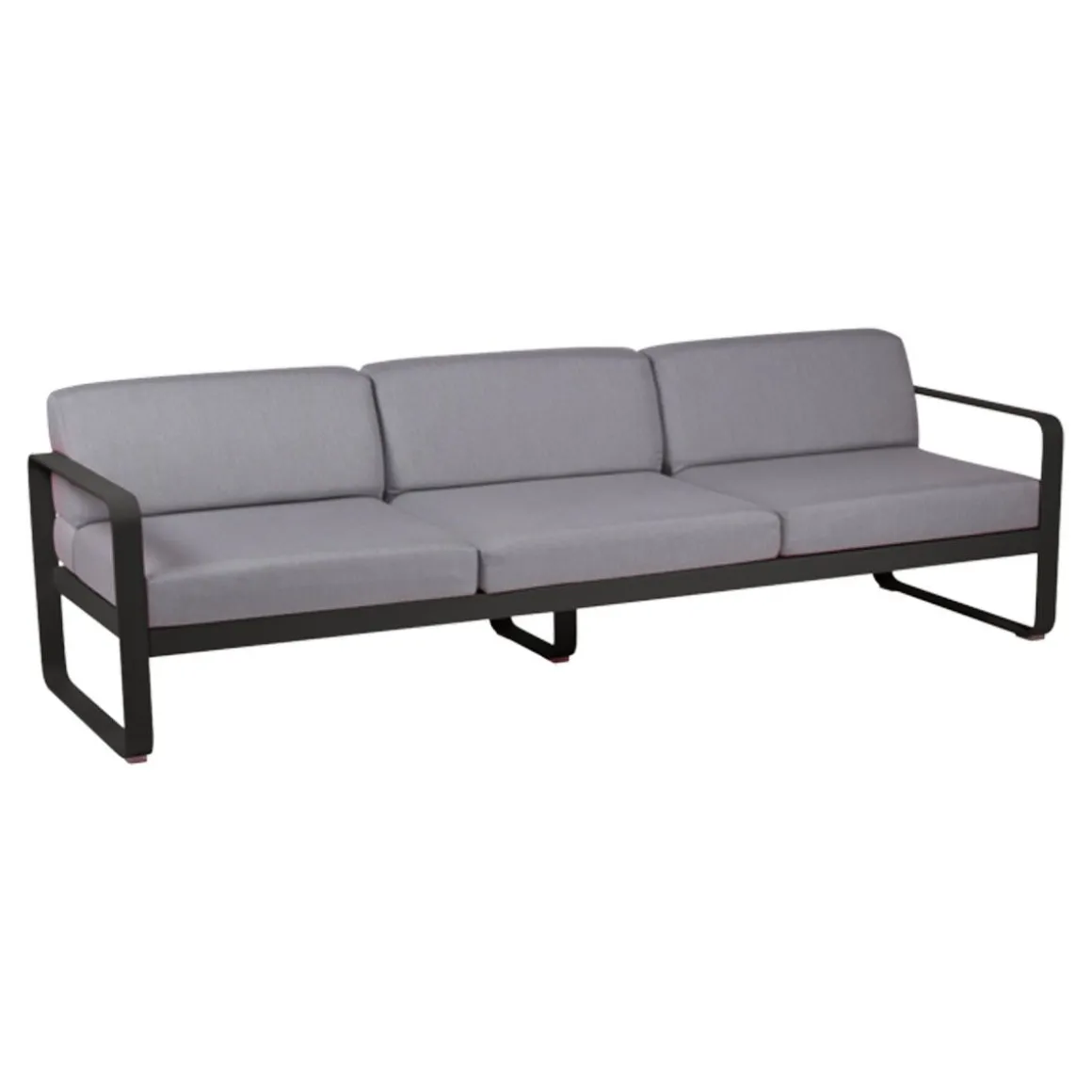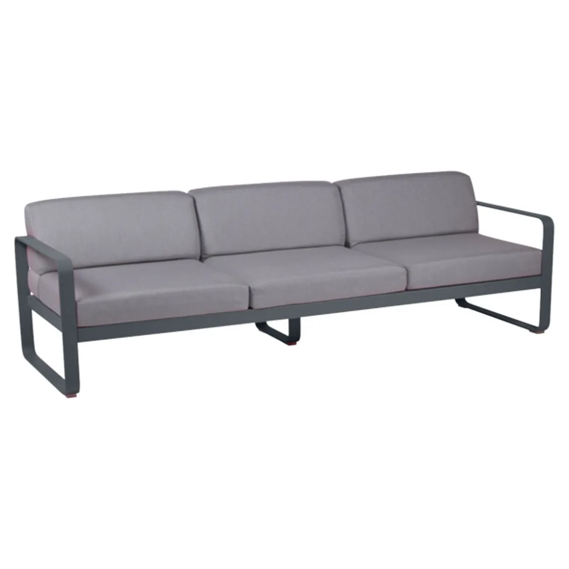 Canapé 3 places Bellevie – gris de Fermob. Le canapé Bellevie 3 places va vous faire craquer ! Son confort vous transporte loin, même si ce ne sont pas encore les vacances… Votre esprit s’évade sur votre playlist préférée… Détente et farniente sont au rendez-vous. Vous êtes bien, vous savourez ce moment ! Ce canapé d’extérieur en aluminium, aux dimensions généreuses, s’avère idéal pour tous les âges et tous les gabarits. Il vous accueille, vous + votre conjoint + vos 2 enfants, vous + vos meilleurs amis et votre chien… Complétez la liste des possibilités : la composition des combinaisons est infinie ! Trois personnes peuvent être confortablement installées côte à côte et… jusqu’à 6 personnes (un peu) plus serrées ! Le canapé Bellevie a la douceur et l’allure d’un canapé de salon grâce à la douceur et la qualité du tissu Sunbrella 100% outdoor développé en exclusivité pour Fermob par Dickson, leader mondial du textile d’extérieur. À ce toucher velouté s’ajoutent de véritables performances techniques : déperlance, résistance aux UV, aux taches, aux moisissures…