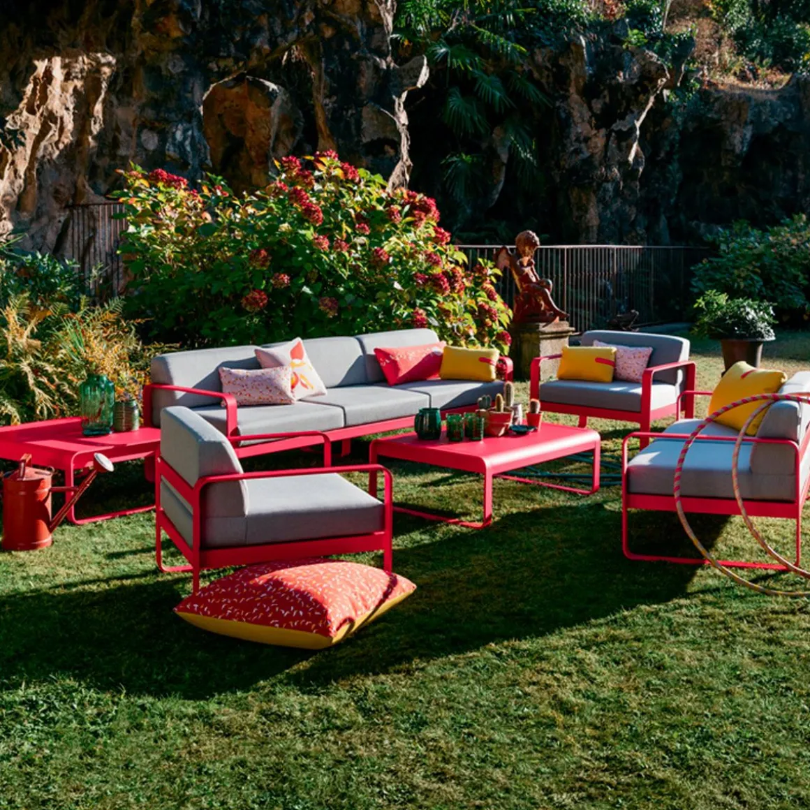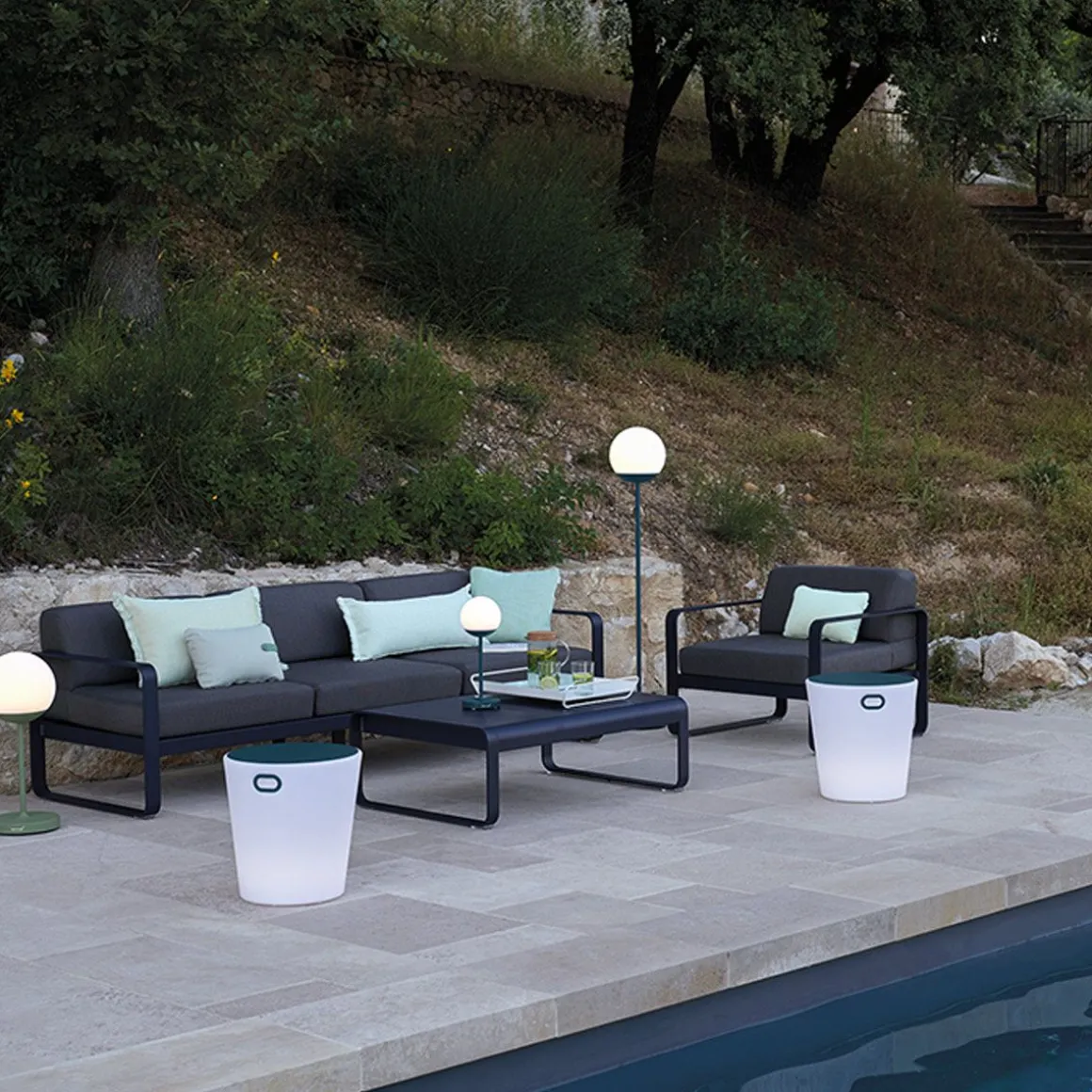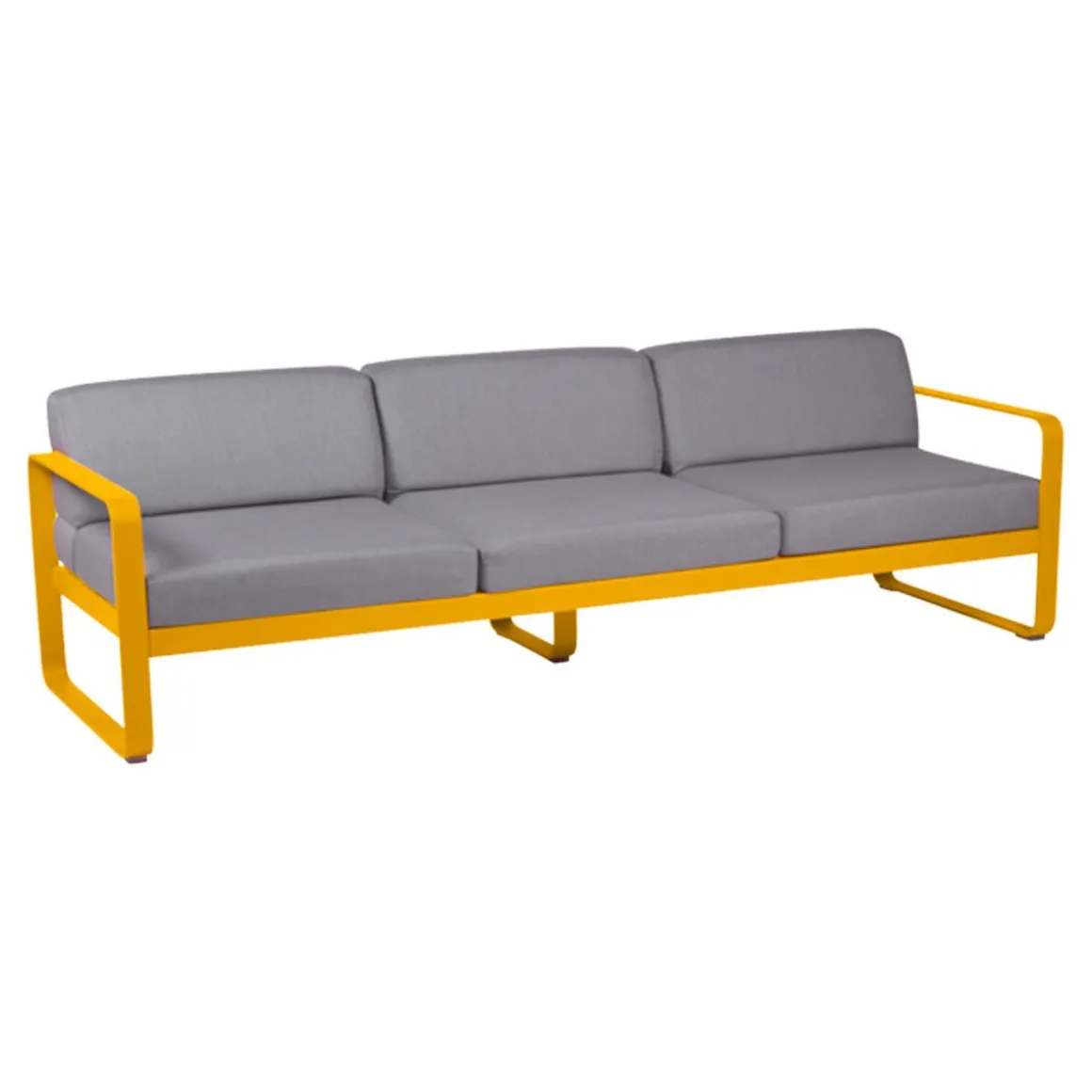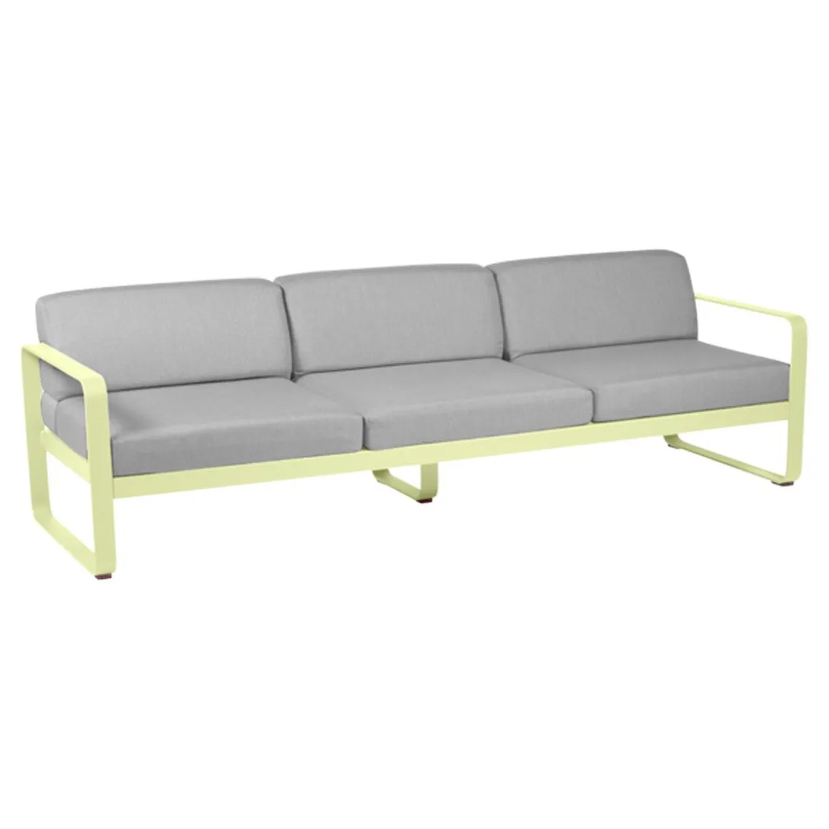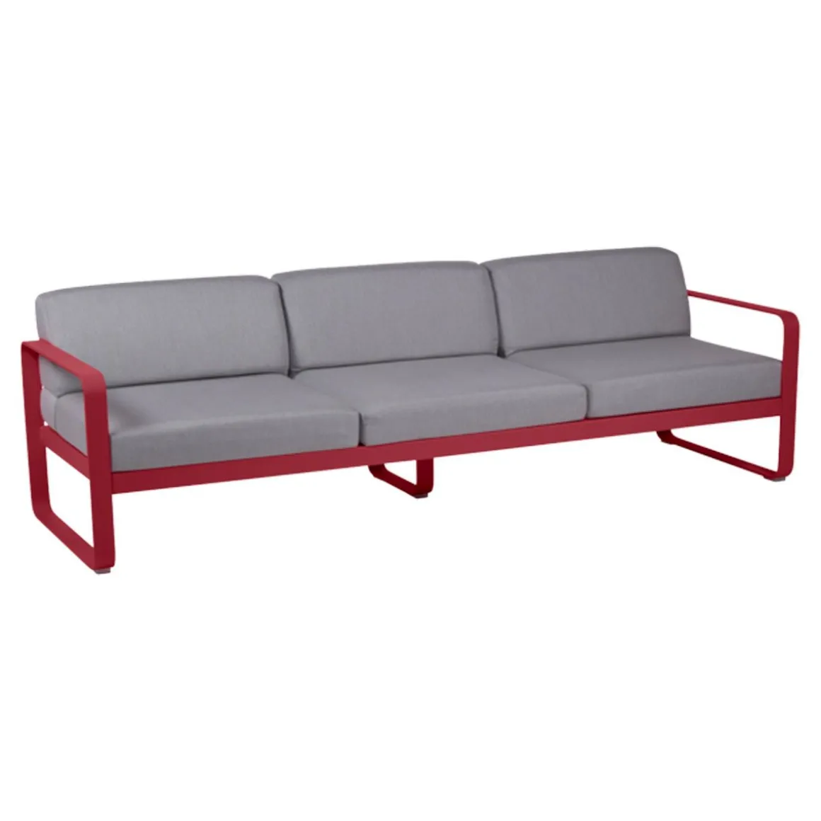 Canapé 3 places Bellevie – gris de Fermob. Le canapé Bellevie 3 places va vous faire craquer ! Son confort vous transporte loin, même si ce ne sont pas encore les vacances… Votre esprit s’évade sur votre playlist préférée… Détente et farniente sont au rendez-vous. Vous êtes bien, vous savourez ce moment ! Ce canapé d’extérieur en aluminium, aux dimensions généreuses, s’avère idéal pour tous les âges et tous les gabarits. Il vous accueille, vous + votre conjoint + vos 2 enfants, vous + vos meilleurs amis et votre chien… Complétez la liste des possibilités : la composition des combinaisons est infinie ! Trois personnes peuvent être confortablement installées côte à côte et… jusqu’à 6 personnes (un peu) plus serrées ! Le canapé Bellevie a la douceur et l’allure d’un canapé de salon grâce à la douceur et la qualité du tissu Sunbrella 100% outdoor développé en exclusivité pour Fermob par Dickson, leader mondial du textile d’extérieur. À ce toucher velouté s’ajoutent de véritables performances techniques : déperlance, résistance aux UV, aux taches, aux moisissures…
