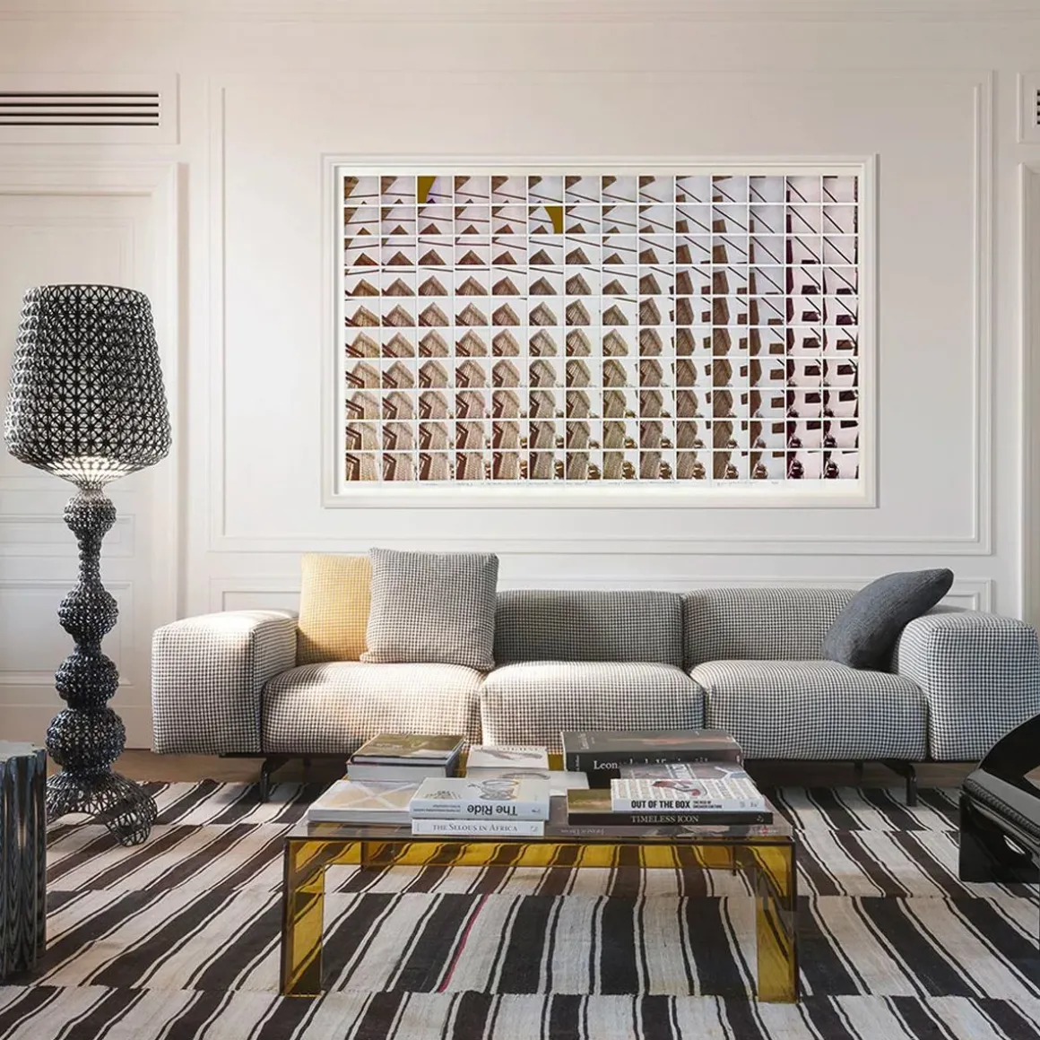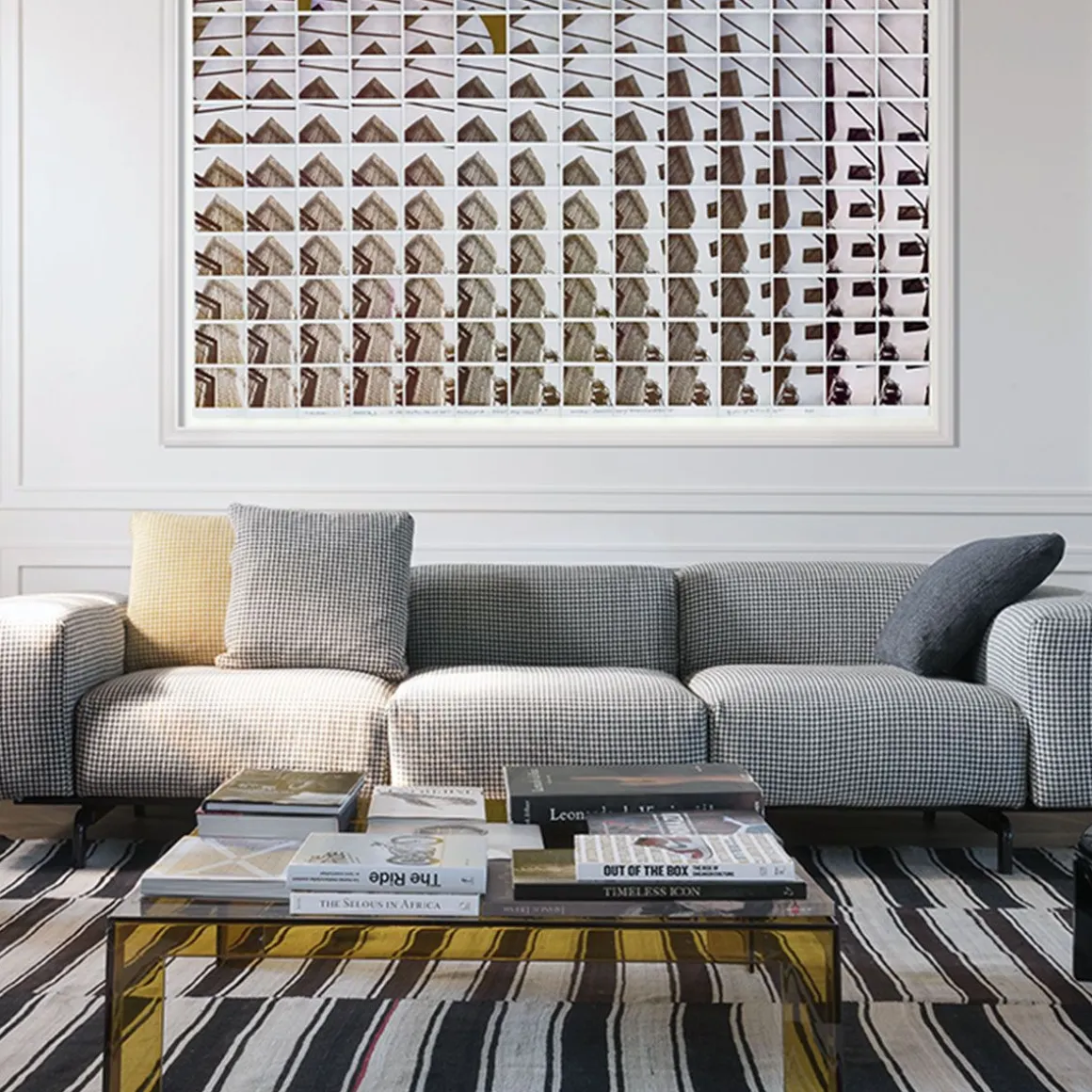 Le canapé 3 places Largo, signé par le célèbre designer italien Piero Lissoni a une esthétique très couture avec son revêtement orné d’un motif pied-de-poule noir & blanc. Ce tissu haut de game allie style et élégance des années 50. Inspiré de l’univers de la mode, il mixe avec originalité confort et raffinement. Tout comme les autres canapés de la collection Largo, il n’y a pas de structure entourant les coussins, ce sont eux-mêmes qui dessinent les lignes nettes du canapé. Ils sont réalisés avec une mousse de polyuréthane et fixés par en dessous à une fine plateforme en acier.
