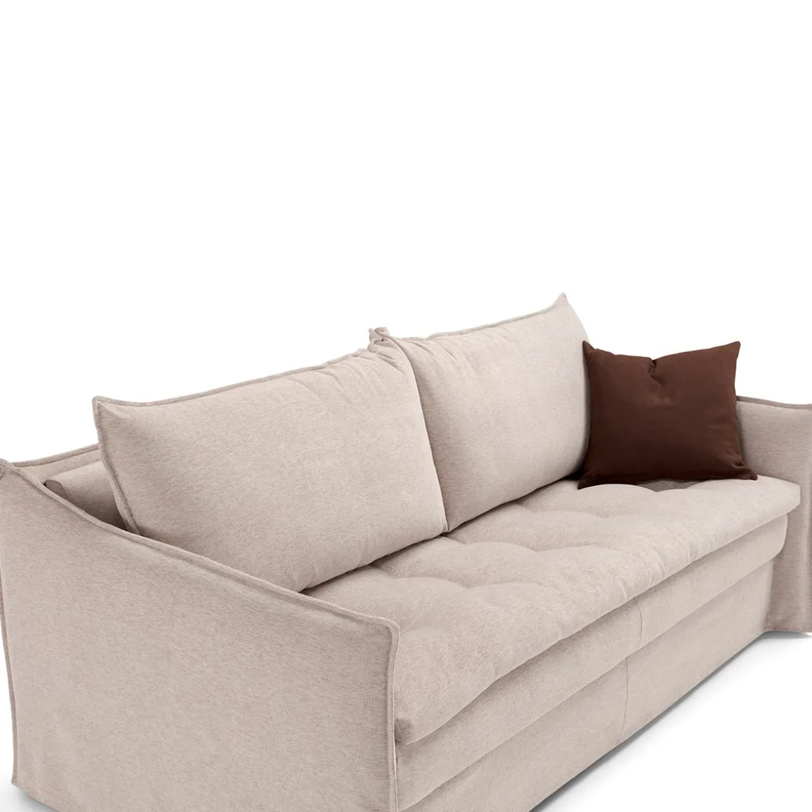 Canapé-lit convertible avec sommier électrosoudé, assise avec sangle élastiques, pieds de 8 cm de hauteur, matelas de 16 cm de hauteur, mécanisme avec range oreillers. L’ouverture se fait par un seul mouvement de rotation frontale du dossier et la transition de la position canapé à la position lit ne nécessite aucun retrait de pièce assemblée et/ou de revêtement du produit.
