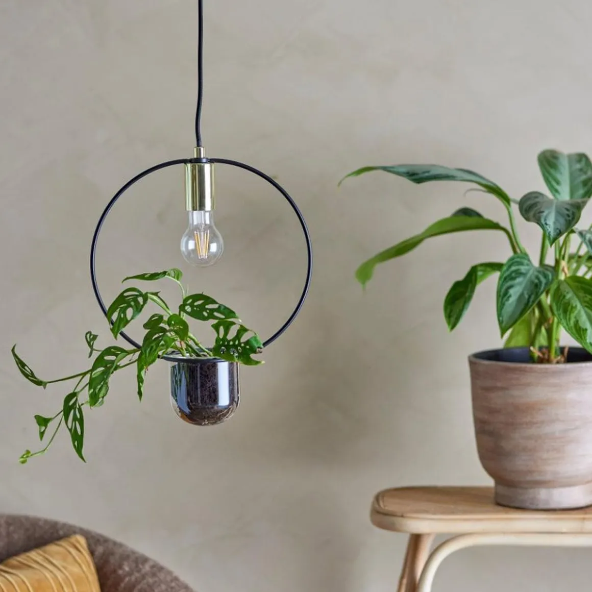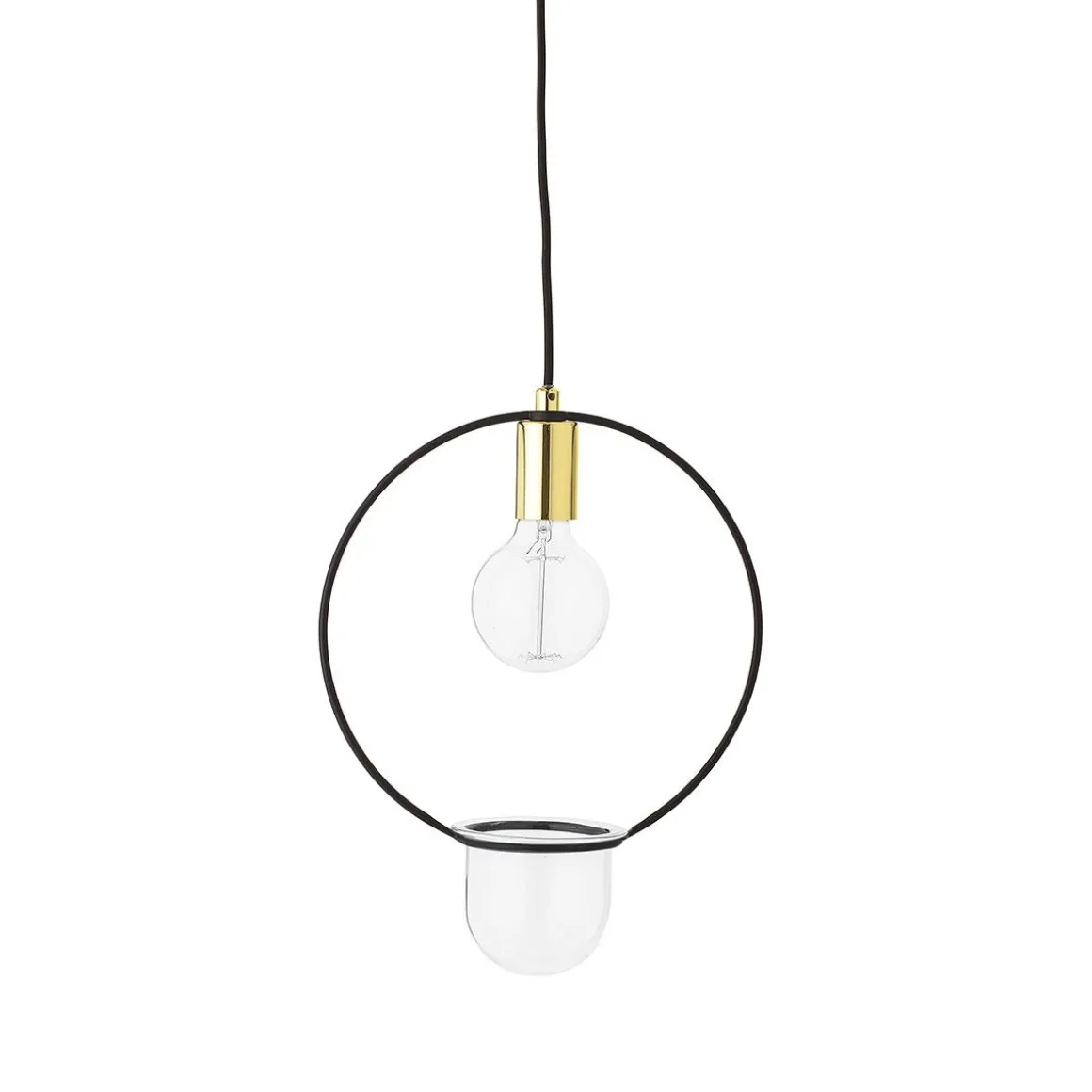 Créez une superbe scénographie végétale suspendue… Simple et d’une élégance extrême, cette suspension au charme rétro met en scène vos plantes de façon poétique. Elle accueillera en son centre un pot de fleurs en verre transparent. Les feuilles pourront retomber, créant une cascade de verdure au beau milieu de votre salon ! La fine structure en métal noir sert de cadre raffiné à l’ampoule et à la plante qui jouent les équilibristes. Une construction de la lumière sculpturale et sophistiquée. Le pot en verre est amovible pour faciliter l’entretien de la plante.