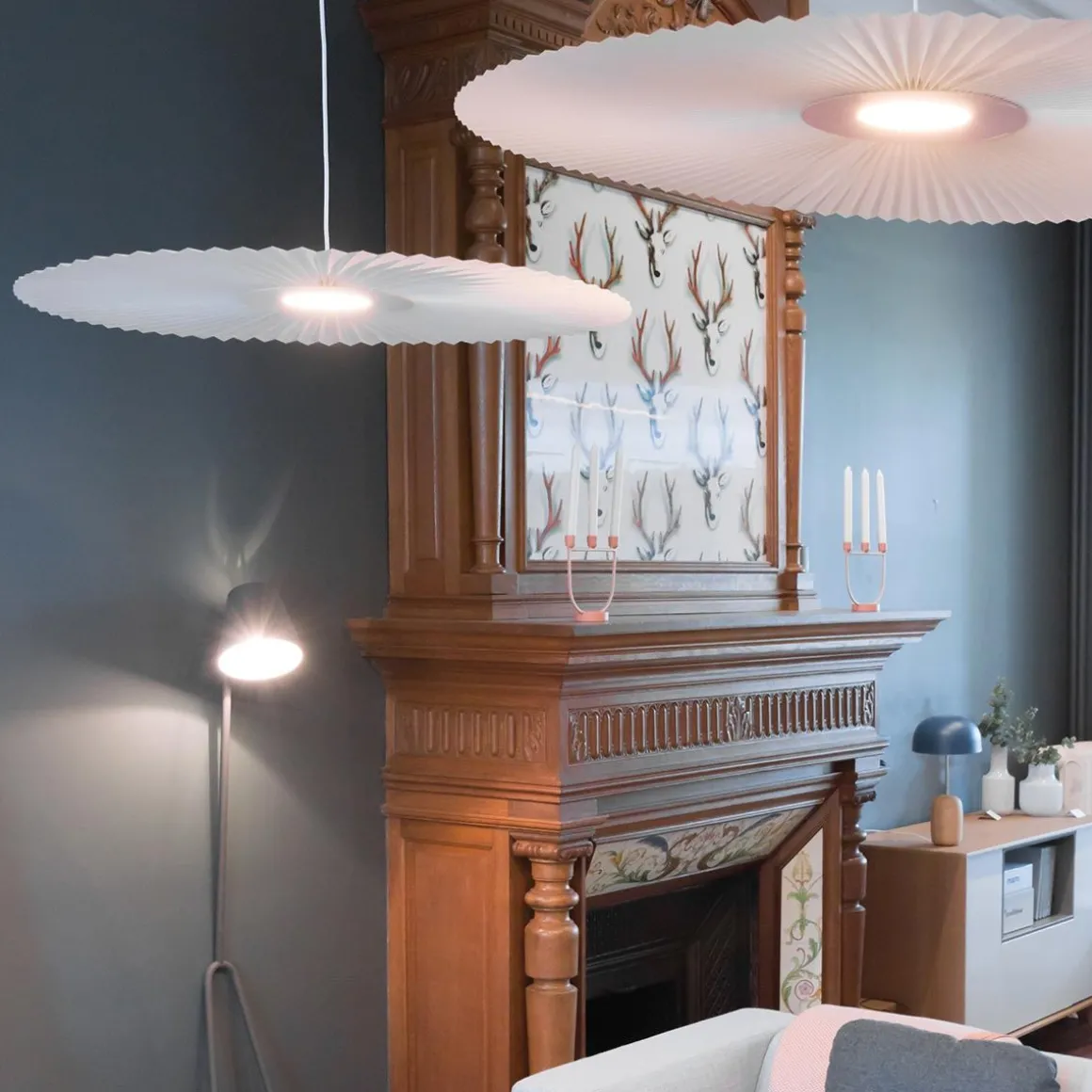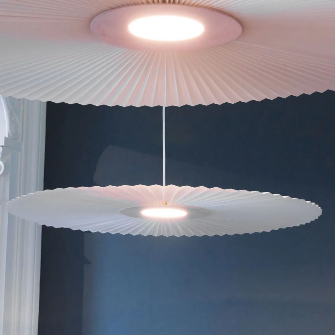 Le plissage et l’envergure de Carmen rendent son graphisme captivant. Le studio PaulinePlusLuis, a pensé pour HARTÔ cette suspension comme une danseuse. Les lignes de sa jupe se répètent et viennent rythmer l’espace dans laquelle elle se trouve. Quand Carmen entre en scène, elle ne passe pas inaperçue. Sublimée par son disque lumineux, elle a été conçue en partant d’expérimentations sur le textile. L’approche créative de ce jeune duo à l’origine de la suspension est intuitive. Elle se nourrit du quotidien. La polyvalence du traitement qu’ils accordent à la lumière rend leurs créations uniques. Le studio retrouve HARTÔ sur l’importance accordée aux motifs et lignes répétitives.