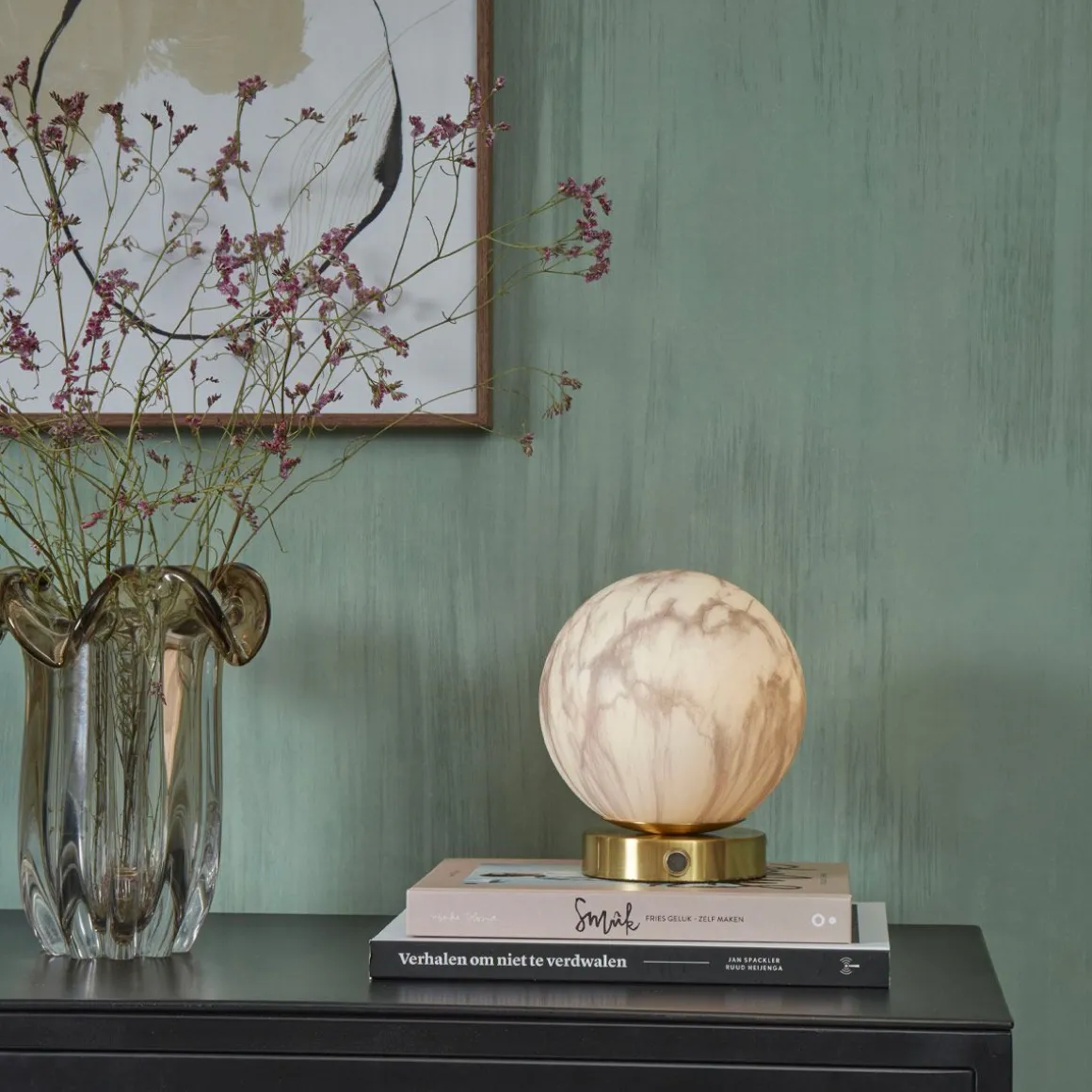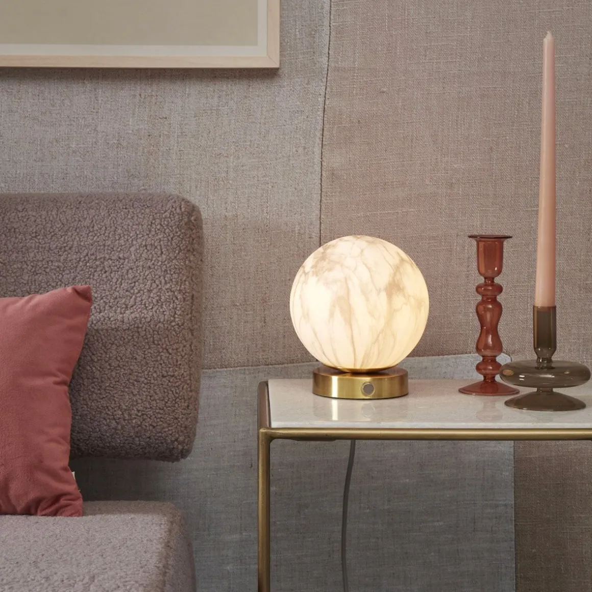 Carrara de It’s about Romi. Lampe de table avec une base doré pour faire ressortir le diffuseur en verre blanc opalin effet marbre très réaliste.