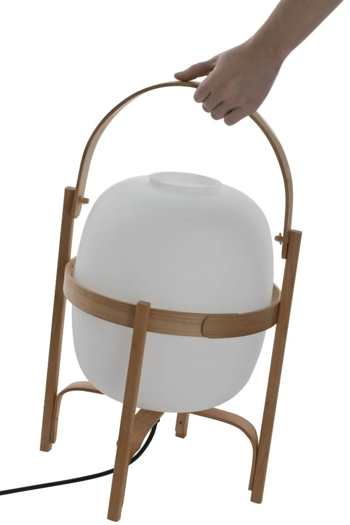Lanterne magique réalisée à la main et composée d’une structure en bois qui contient un globe lumineux. Son volume ovale et son anse en font une lampe-objet que l’on peut laisser indifféremment sur une table ou au sol.