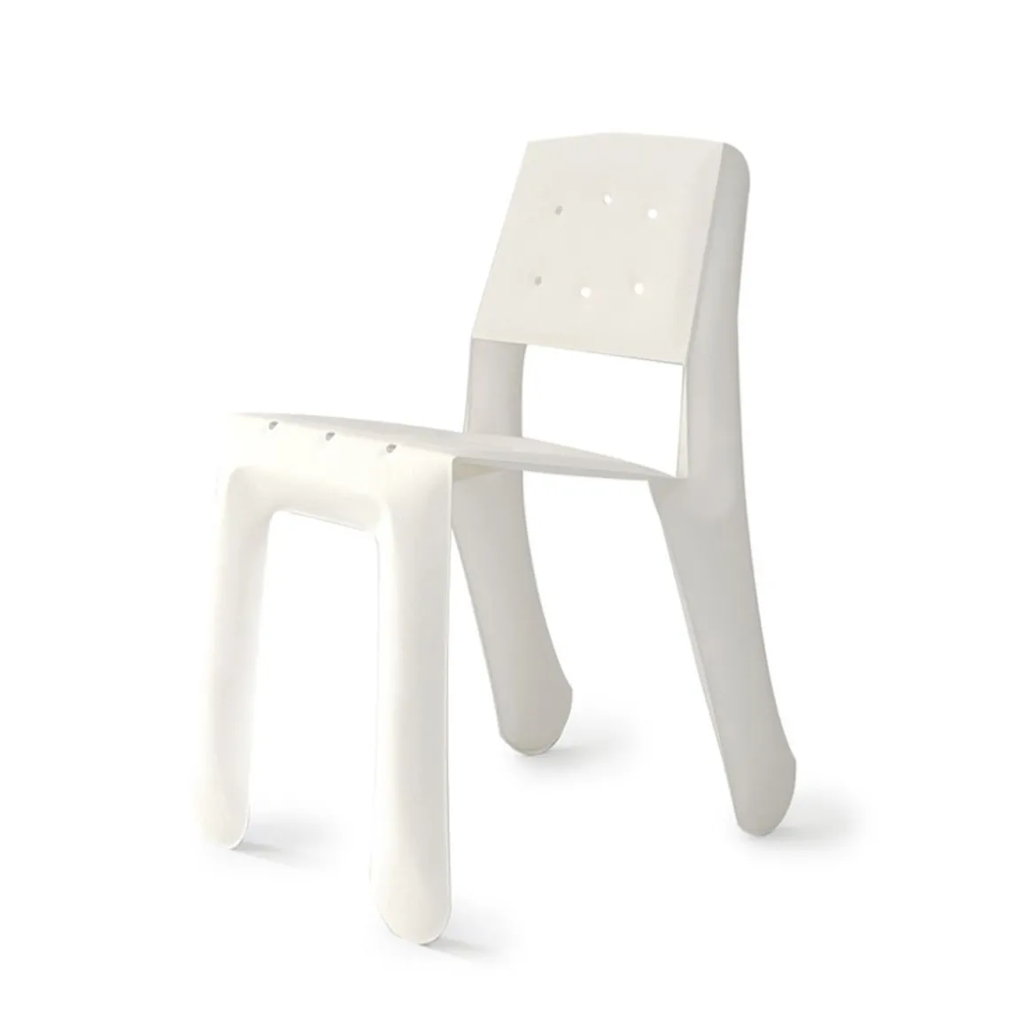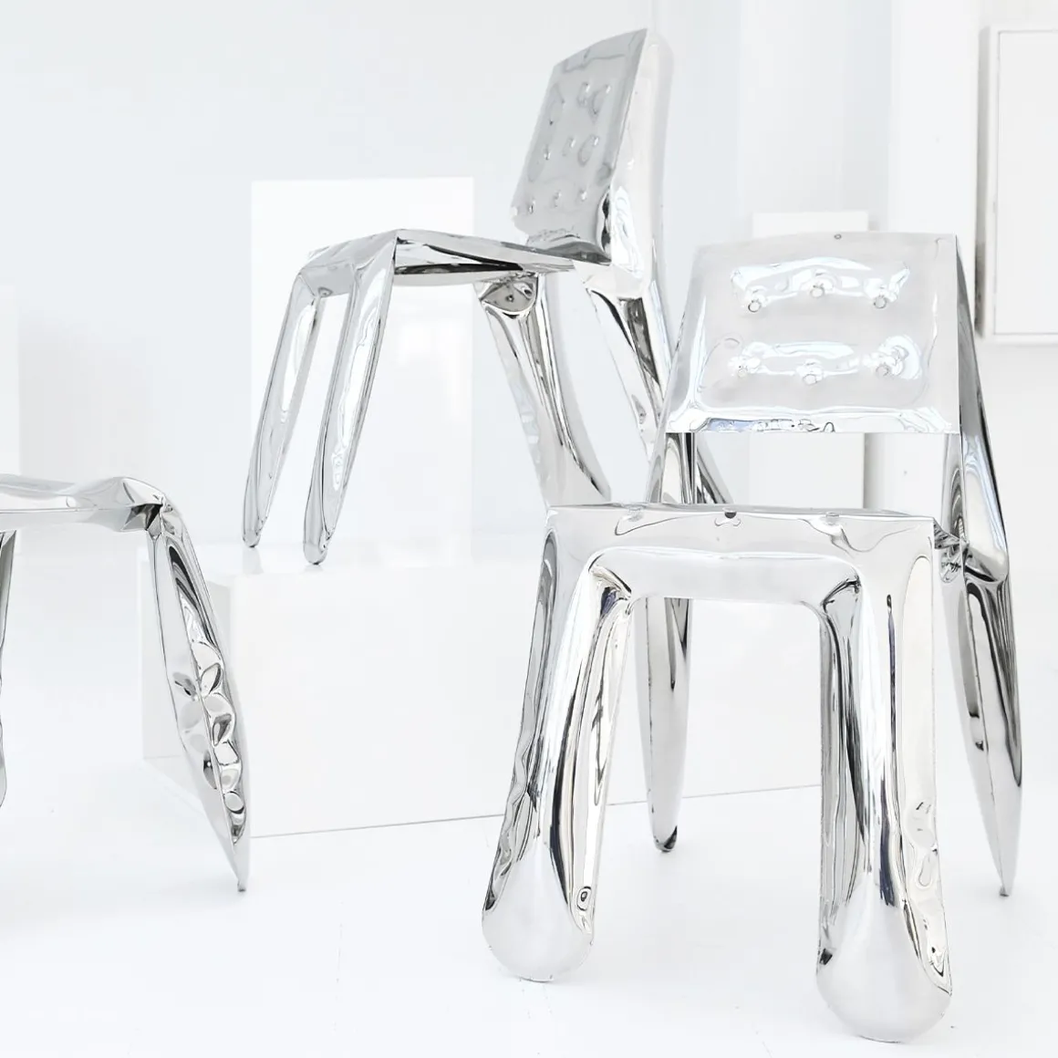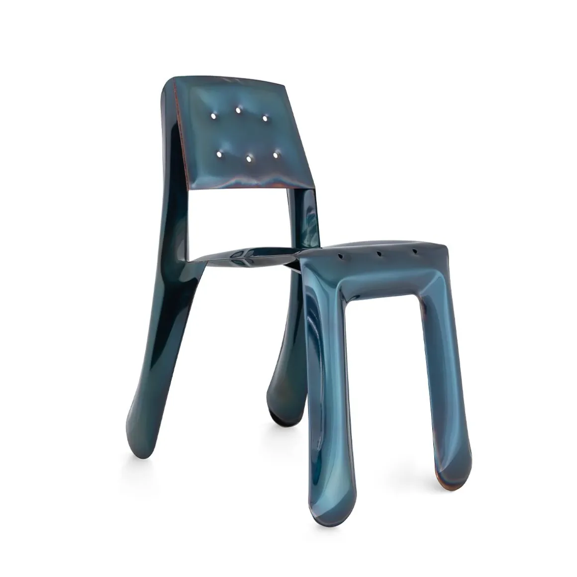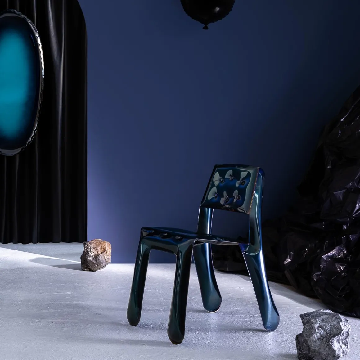 Chippensteel 0.5 est un bel exemple de mélange de processus FiDU et de savoir-faire. La forme 2D est découpée dans une tôle et passe par le soudage et le gonflage, devenant une chaise fonctionnelle en trois dimensions. La touche finale du designer et de l’artisan lui donne une beauté finale. La dernière forme optimale de Chippensteel 0.5 est issue de nombreuses expériences, prototypes et processus de conception.
