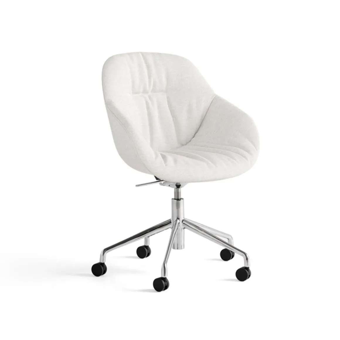 Chaise de bureau AAC 155 Soft de Hay. L’AAC 155 Soft contrebalance la haute fonctionnalité et l’expression moderne de la base à roulettes de la chaise de bureau avec la douceur et la chaleur de la coque matelassée. Conservant le même dossier haut et l’assise généreuse qui caractérisent la série, la base est conçue avec un mécanisme d’inclinaison et un vérin à gaz qui permet de régler la hauteur de l’assise.