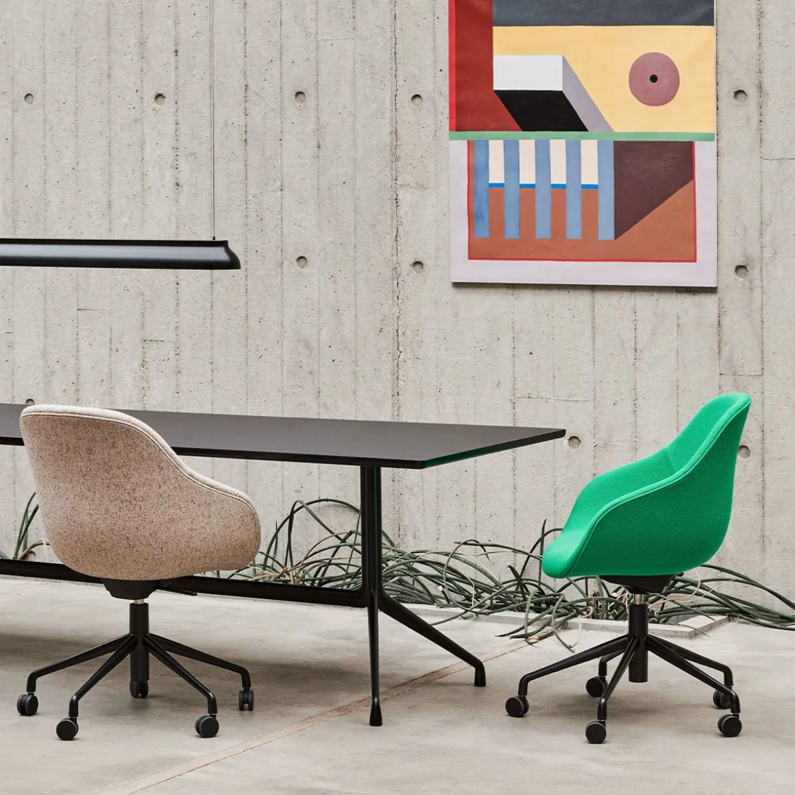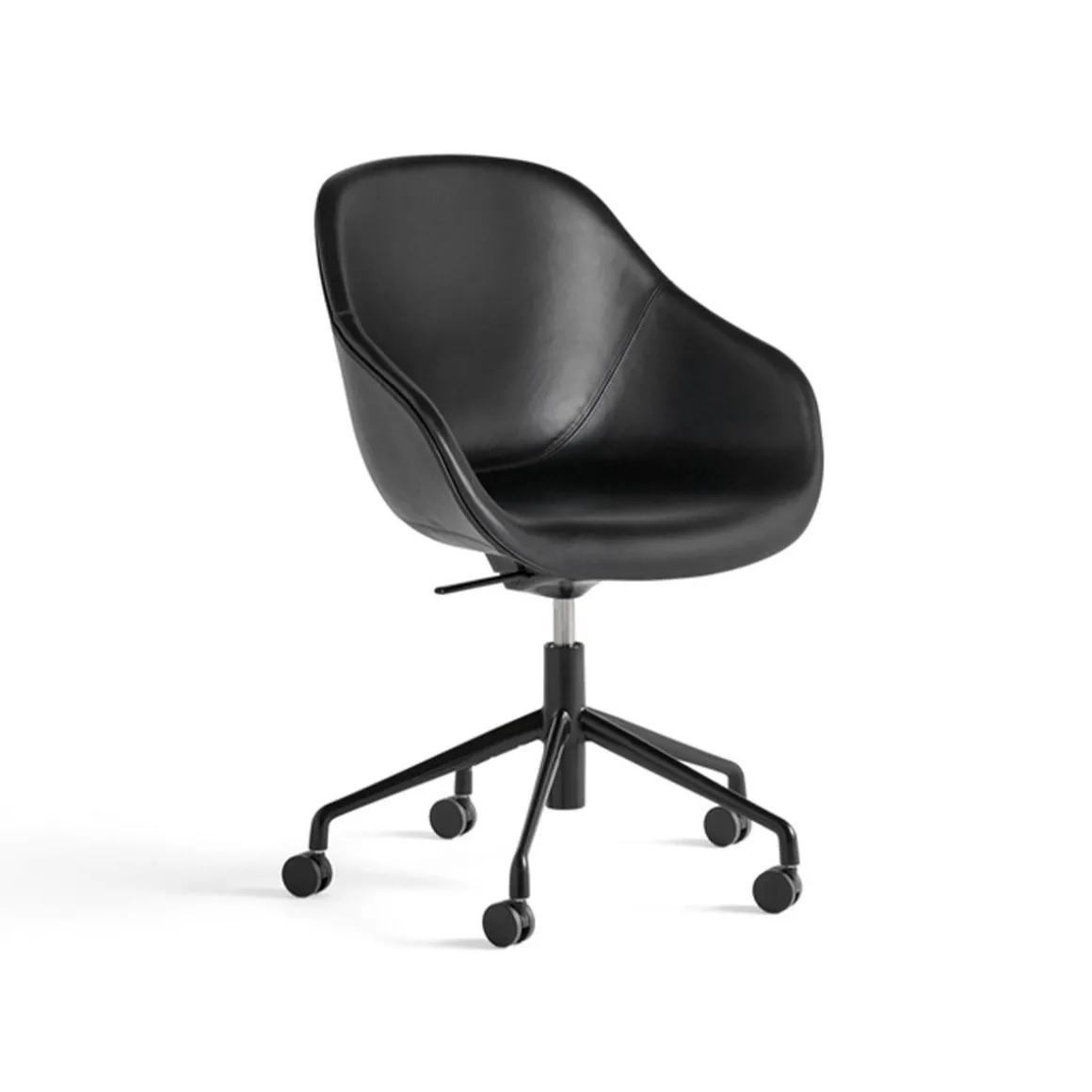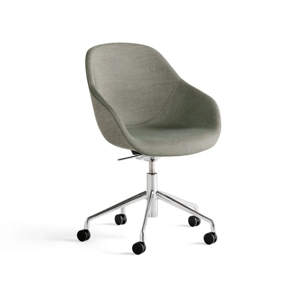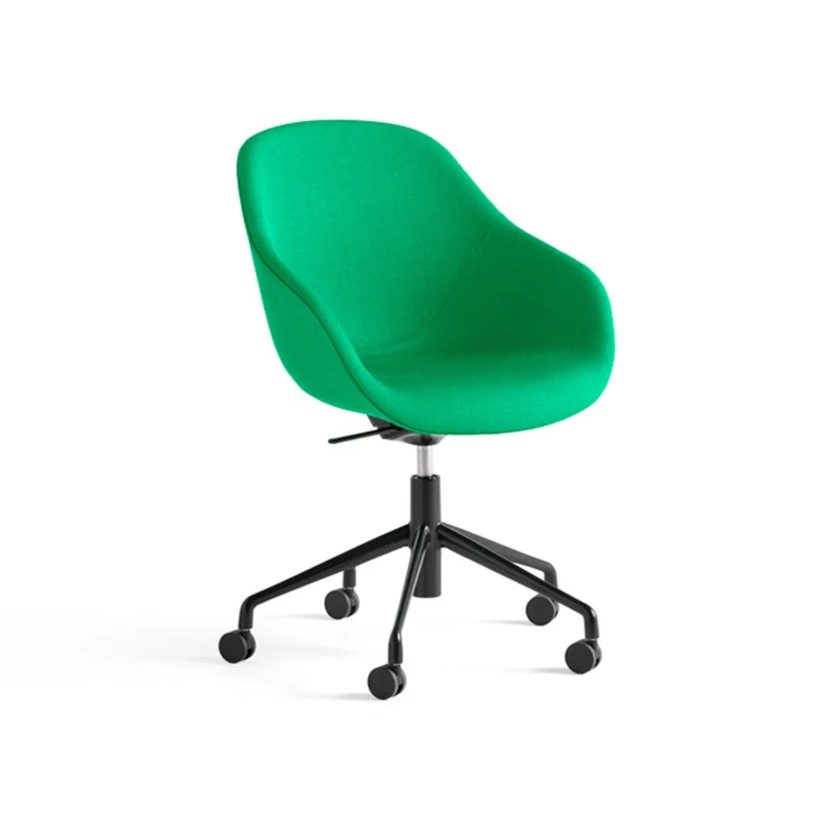 Chaise de bureau AAC 155 de Hay. Doté d’une base à roulettes à cinq pieds, l’AAC 155 combine la haute fonctionnalité d’une chaise de travail avec un confort optimal et une esthétique moderne. Conservant le même dossier haut et l’assise généreuse qui caractérisent la série, la base est conçue avec un mécanisme d’inclinaison et un vérin à gaz qui permet de régler la hauteur de l’assise.