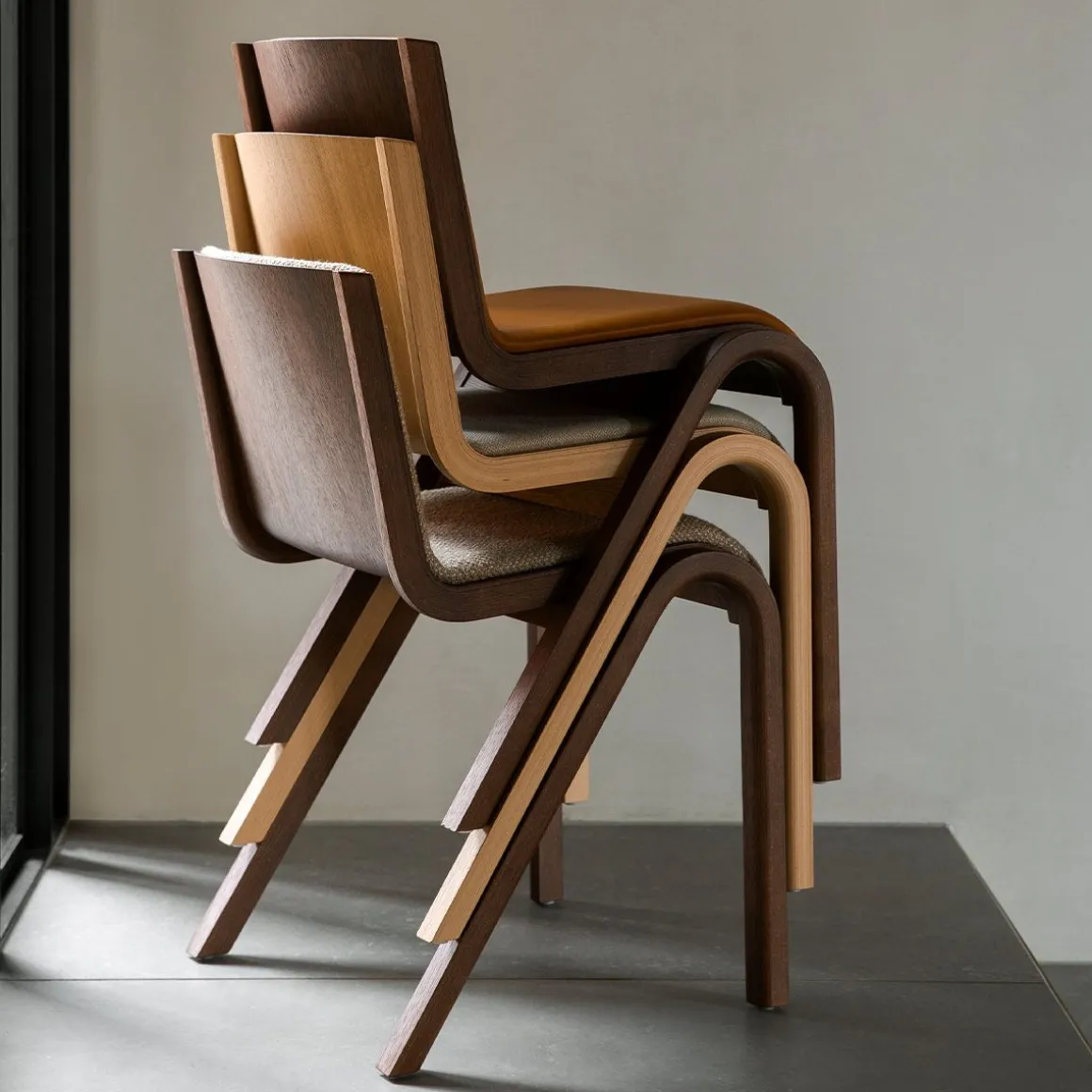 Fruit d’une étude des possibilités des techniques de pressage de forme, Ready Chair, créée pour Audo par Matias Møllenbach et Nick Rasmussen, s’inspire des modèles classiques de chaises à oscillation libre, son siège et son dossier en porte-à-faux semblant suspendus dans l’air. Disponible en placage chêne, il est livré avec une finition chêne naturel ou teinté rouge et avec l’option d’une assise et d’un dossier rembourrés. Parfaitement dimensionnée pour être utilisée comme chaise de salle à manger, sa conception empilable et sa fonction de connexion en rangée la rendent également adaptée à une multitude d’autres utilisations.