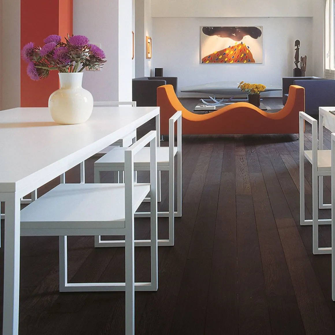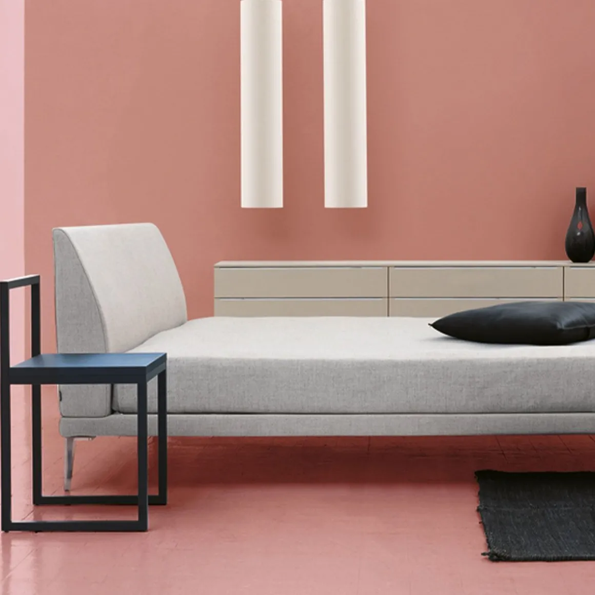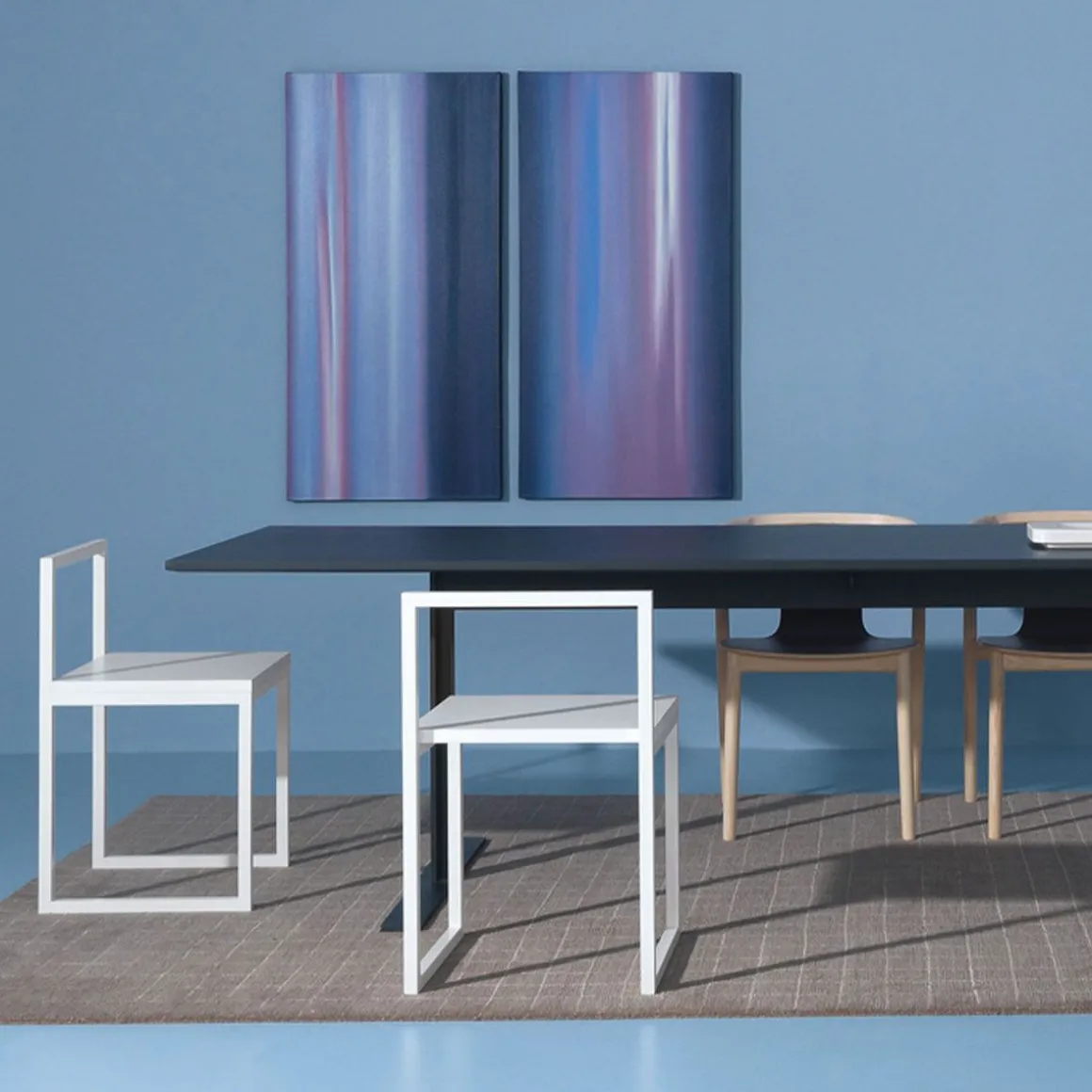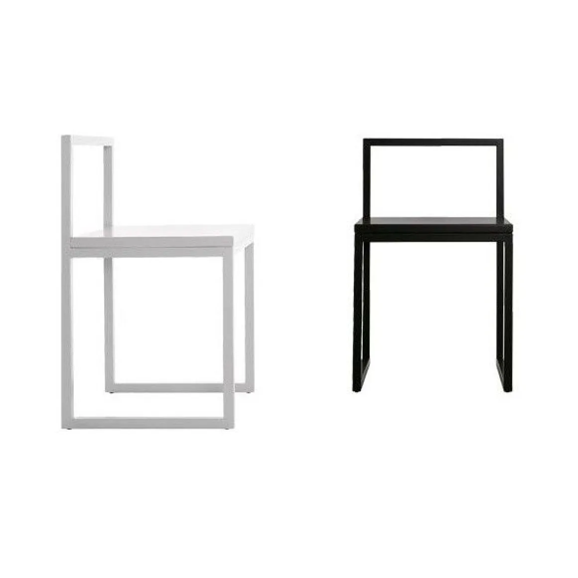 La géométrie a été la principale source d’inspiration pour la chaise polyvalente Fronzoni ’64 , conçue par le maître du minimalisme AG Fronzoni lors de sa quête pour éliminer tous les composants excessifs des objets de design. Ce siège est un élément d’ameublement conceptuel, composé d’une série de carrés et de lignes droites qui coupent proprement l’espace, comme s’ils étaient dessinés avec une règle. Les lignes essentielles sont précisément ce qui rend cette chaise si bien adaptée et adaptable à chaque environnement. La chaise Fronzoni ’64 a une base en métal tubulaire carré, avec une assise en bois laqué mat blanc ou anthracite.