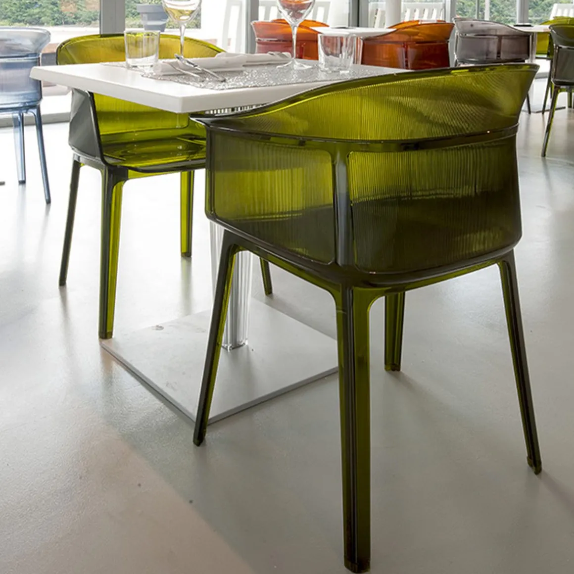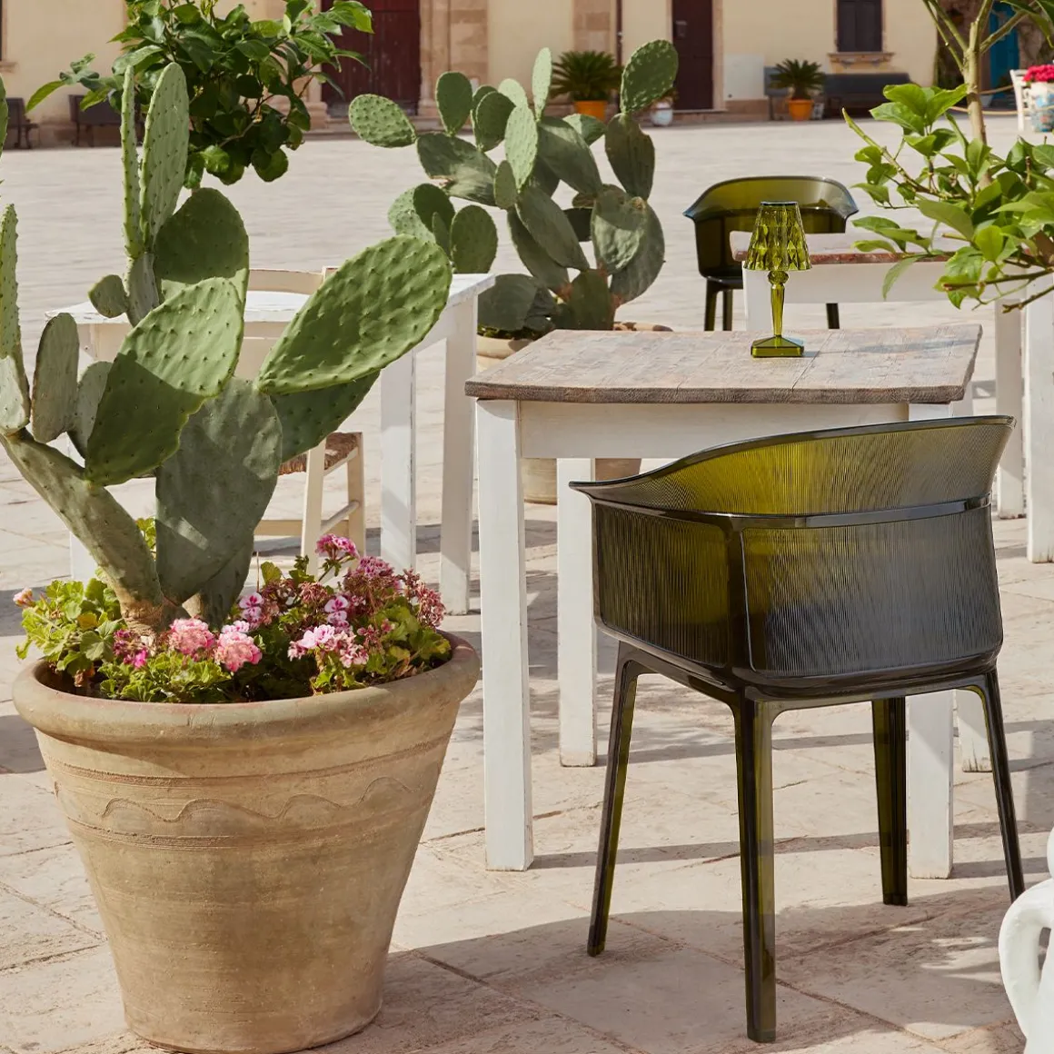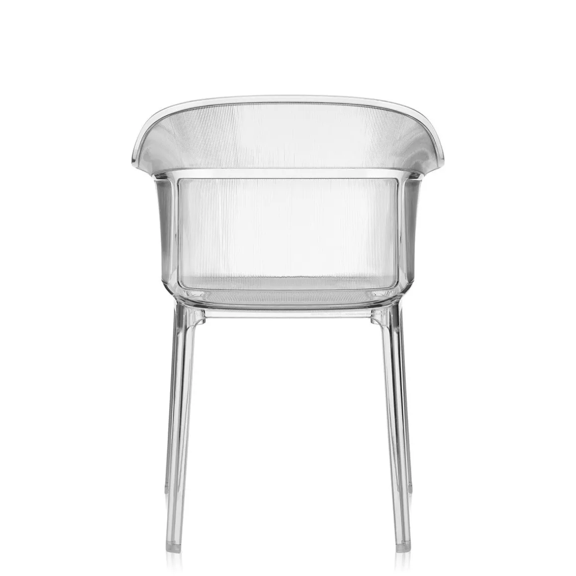 Papyrus reprend les lignes traditionnelles des anciens fauteuils en rotin : des produits qui se distinguaient par la force et la linéarité de leurs formes. Le fauteuil associe à la structure portante translucide un moletage vertical – particulièrement fin et aux formes douces et fluides – qui parcourt toute la surface externe du dossier arrondi.