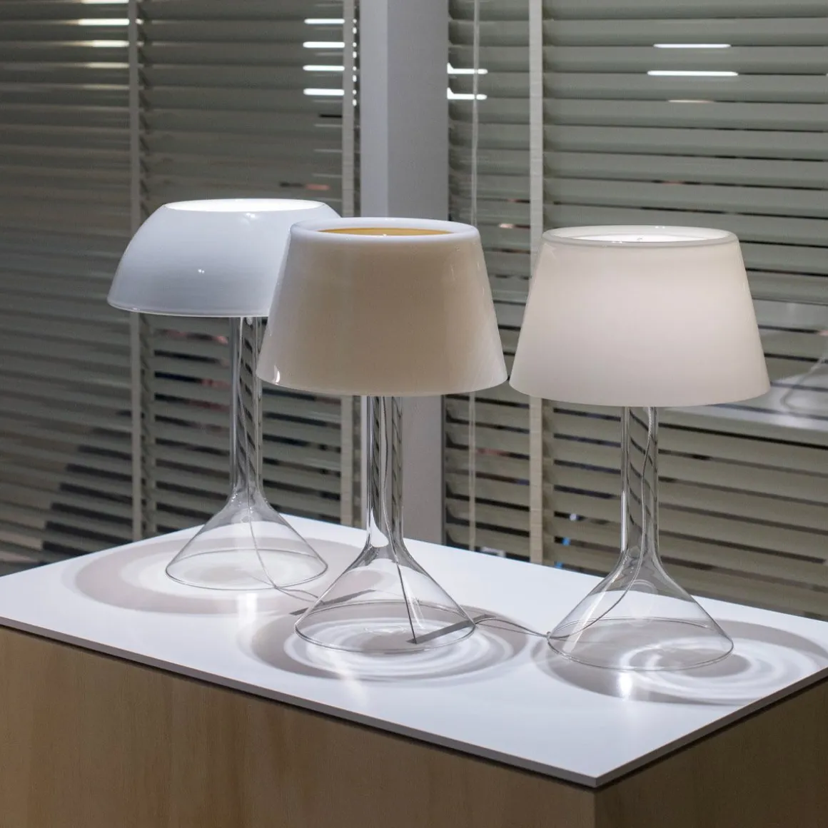 Matériaux : Verre borosilicate (pied), Verre soufflé (abat-jour)