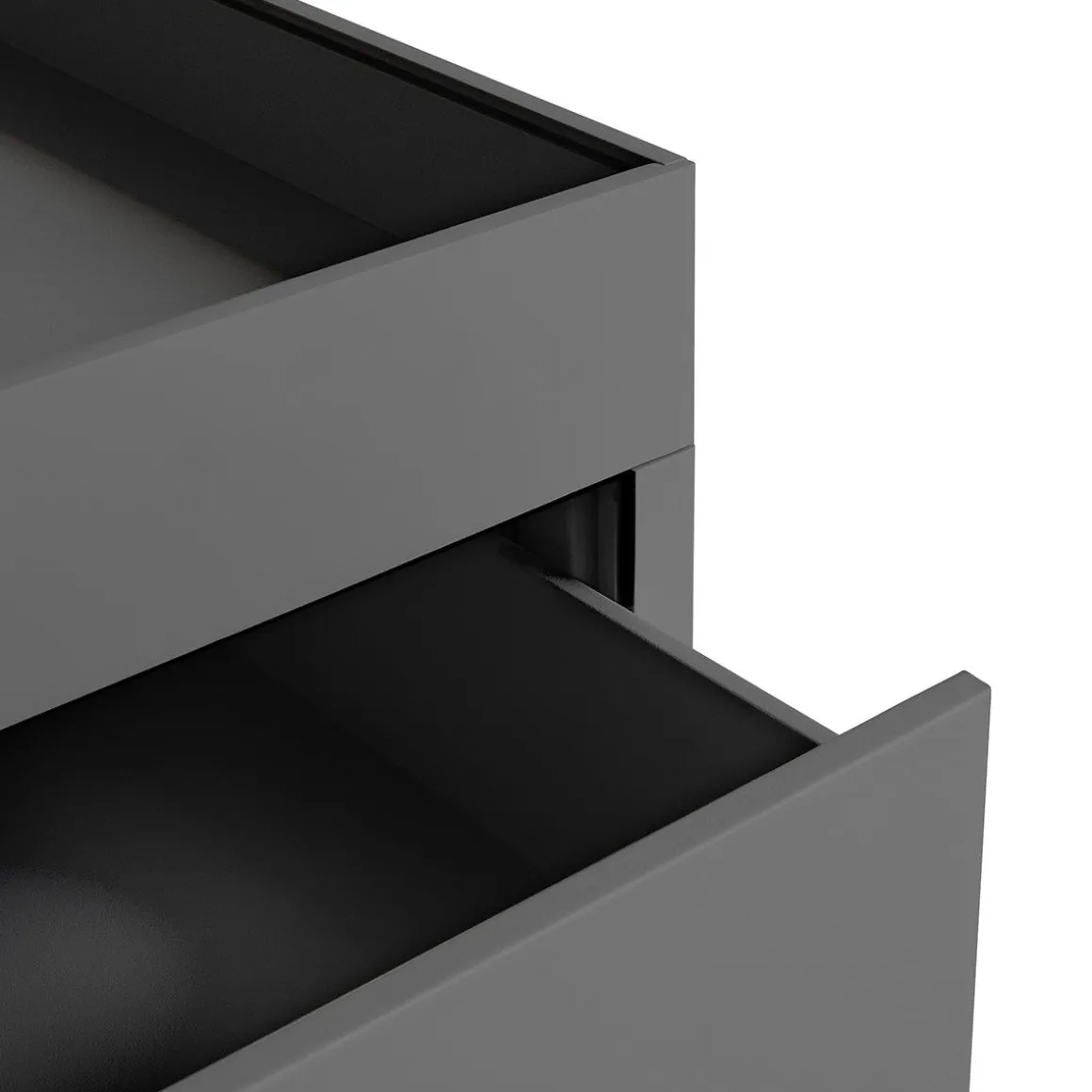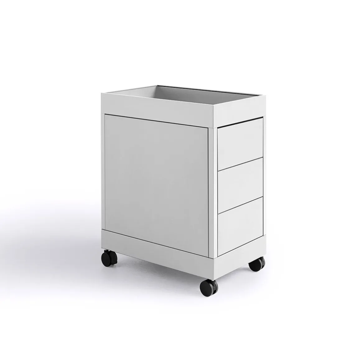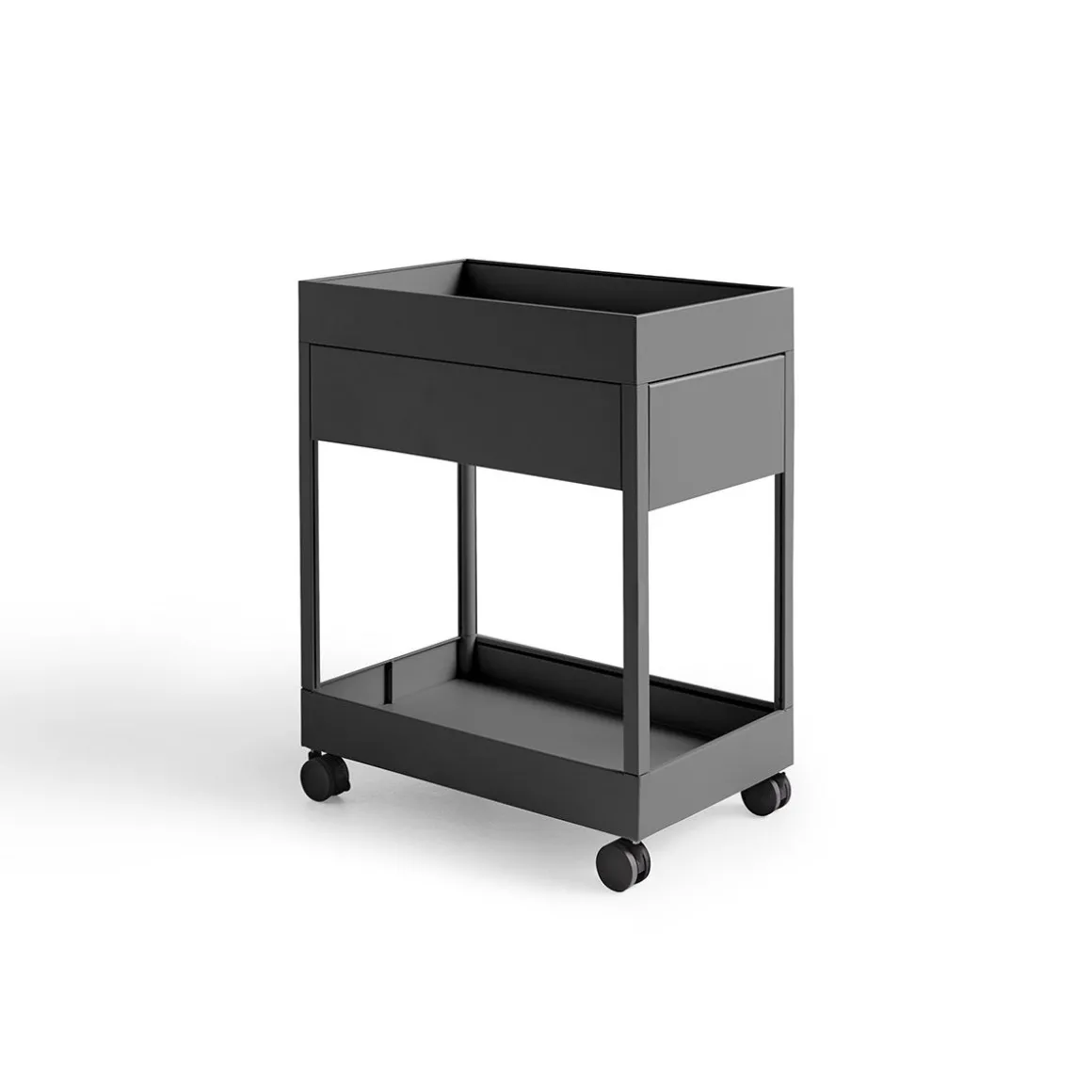 CHARIOT New Order de Hay. Les chariots mobiles New Order sont dotés d’un plateau supérieur et sont livrés avec un seul tiroir et une étagère ouverte en dessous, ainsi qu’une unité fermée avec trois tiroirs. Les deux modèles sont compatibles avec les accessoires de plateau New Order et sont équipés d’un système de verrouillage.