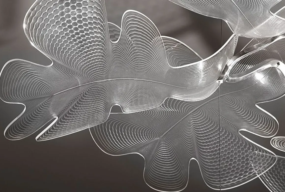 Chlorophilia est une nouvelle création de Ross Lovegrove qui, encore une fois, interprète la compétence d’Artemide dans le light engine du corps lumineux, avec sa griffe qui lui est si propre : ses inspirations bucoliques, ses formes organiques et fluides. C’est une suspension fortement scénographique mais légère. Ses trois éléments disposés en éventails qui se superposent se révèlent une fois allumés, lorsque la suspension dévoile ses jeux d’ombres délicates qui interagissent avec l’espace. Elle se compose d’un corps qui contient une LED COB faisant office de dissipateur et d’élément phytomorphique. Le corps central suspendu émet une lumière indirecte, filtrée et réfractée par les surfaces transparentes qui, par leur forme rappellent des éléments naturels ; des feuilles par exemple, confirmant que la nature est une véritable source d’inspiration pour ce designer. Il signe là un luminaire à fort potentiel scénographique ainsi qu’un bon rendement lumineux pour la pièce qu’il occupe.Les éléments composants Chlorophilia peuvent se répéter en les multipliant pour créer des luminaires qui habillent l’espace sur plusieurs niveaux ou s’étendant en ampleur.