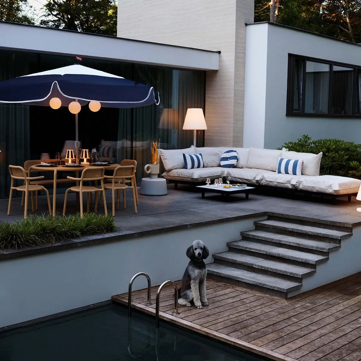 Ces coussins d’extérieur ronds sont résistants aux UV, à l’eau et aux taches, et peuvent donc se prélasser dehors sur ton Paletti. Le jardin est complet.