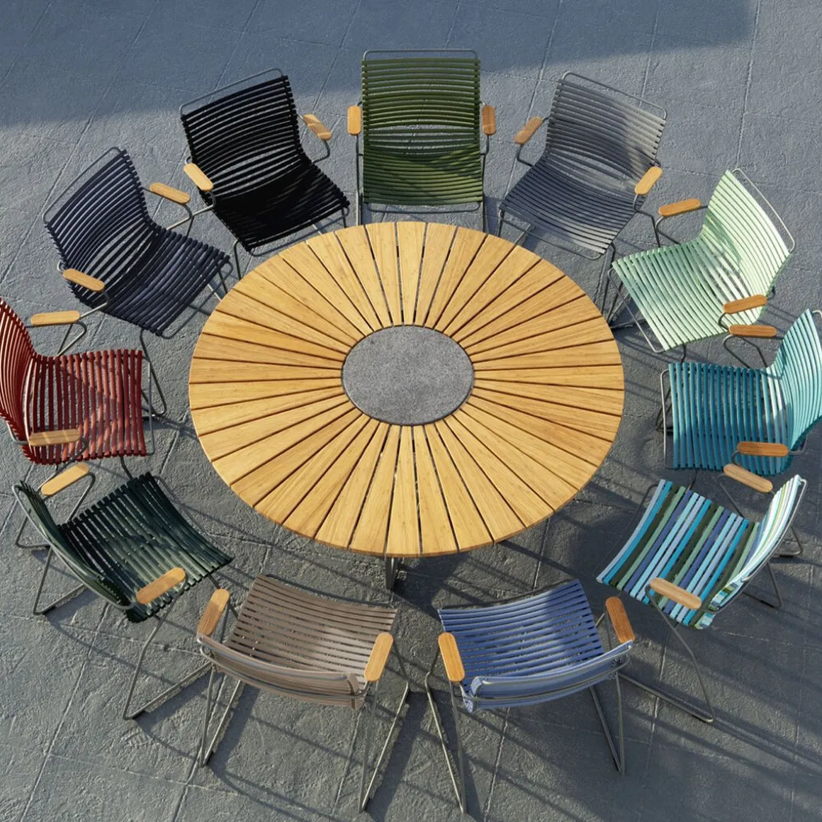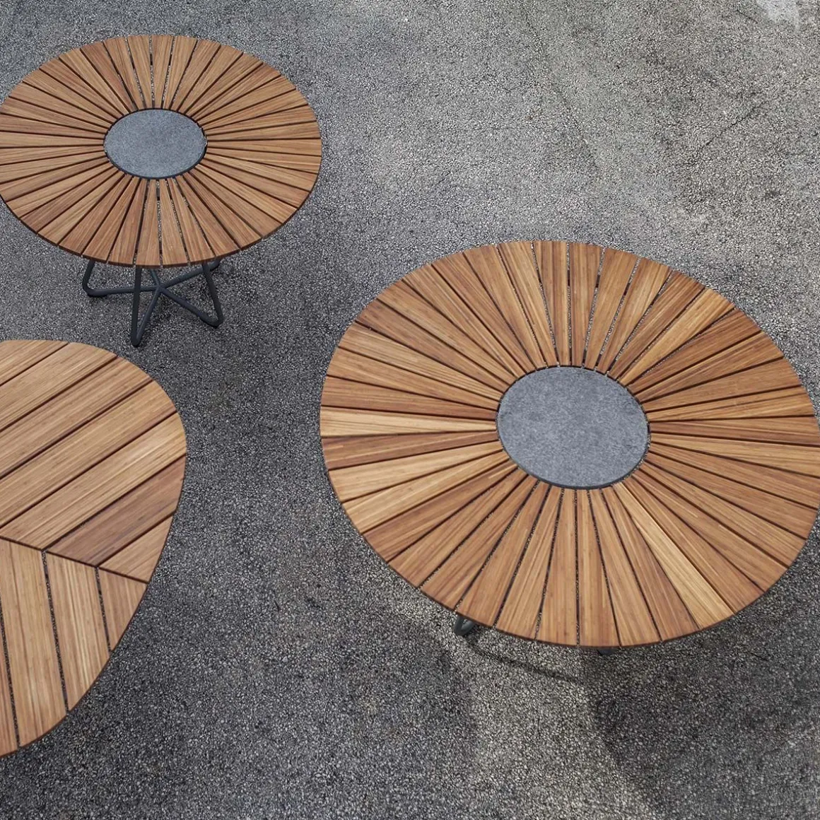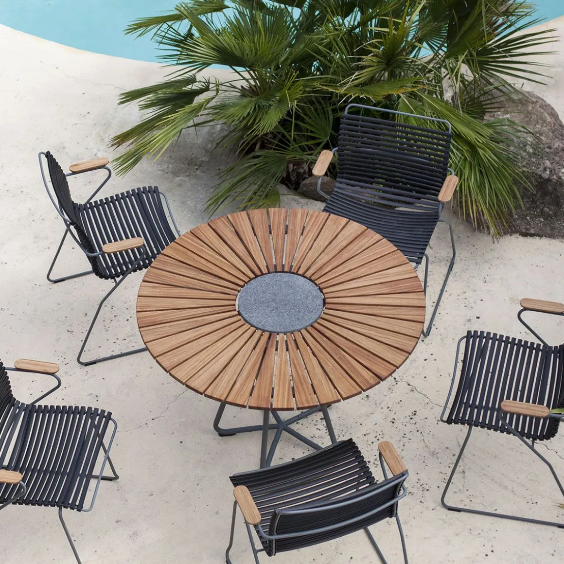 La table Circle pour l’extérieur est faite d’un plateau de lamelles en bambou et d’une base en acier laqué gris foncé. Une belle table bien proportionnée pour votre jardin qui permet de s’assoire librement car le design des pieds est fait pour fournir un confort parfait pour les jambes. La table Circle peut facilement accueillir entre 6 et 10 personnes suivant le modèle. Une pierre décorative en granite se trouve dans le centre de table pour accueuillir les plats chauds. Le dessus de table en bambou est pré-huilé.