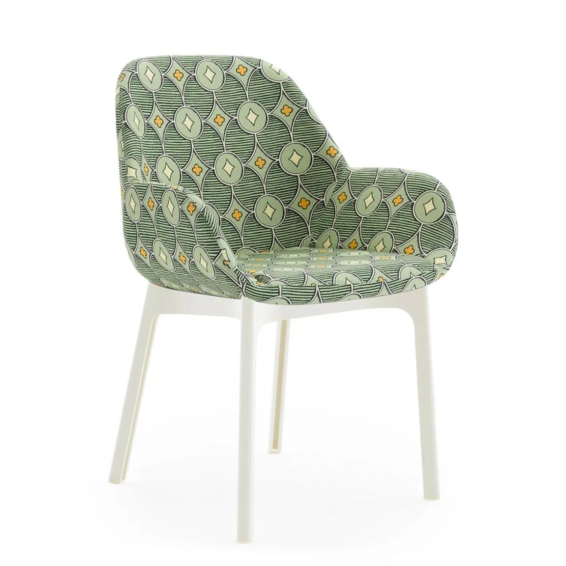 Des imprimés de caractère, capables de donner une nouvelle vie à un produit pour de nouvelles solutions d’ameublement, amplifiant la possibilité de personnaliser les espaces. Les tissus Rubelli Quatrefoil® dessinés par Luke Edward Hall donnent de nouvelles finitions inattendues aux chaises CLAP grâce à des motifs originaux aux empreintes géométriques imbriquées, inspirés des dessins de tapis.