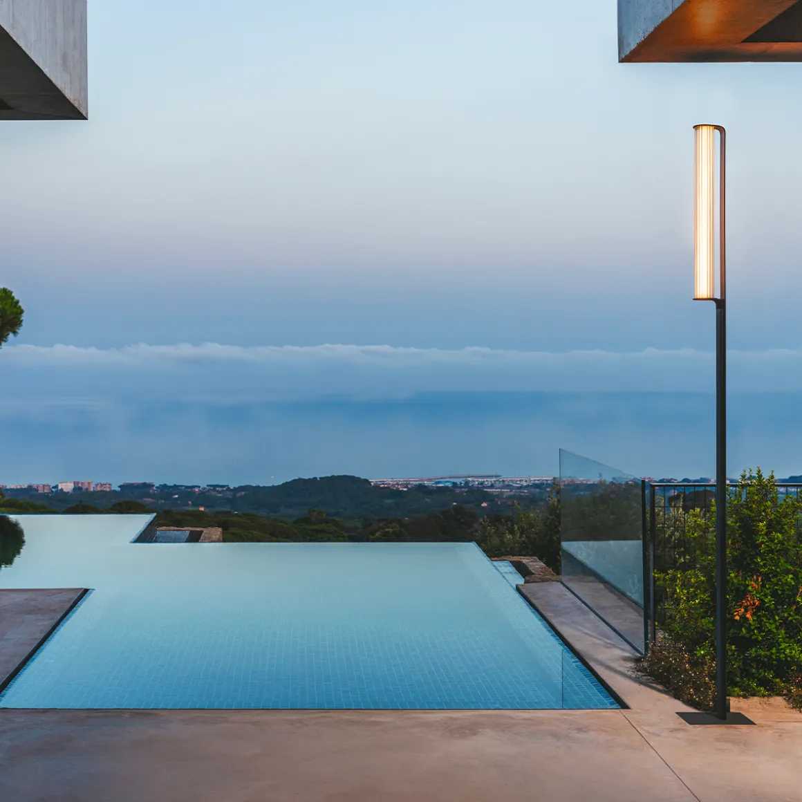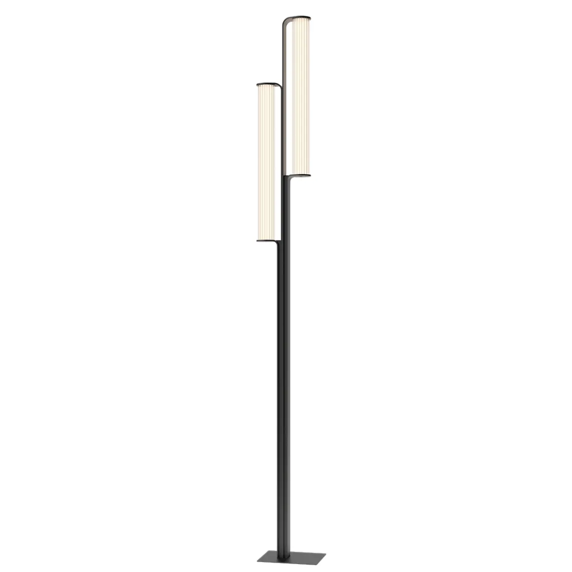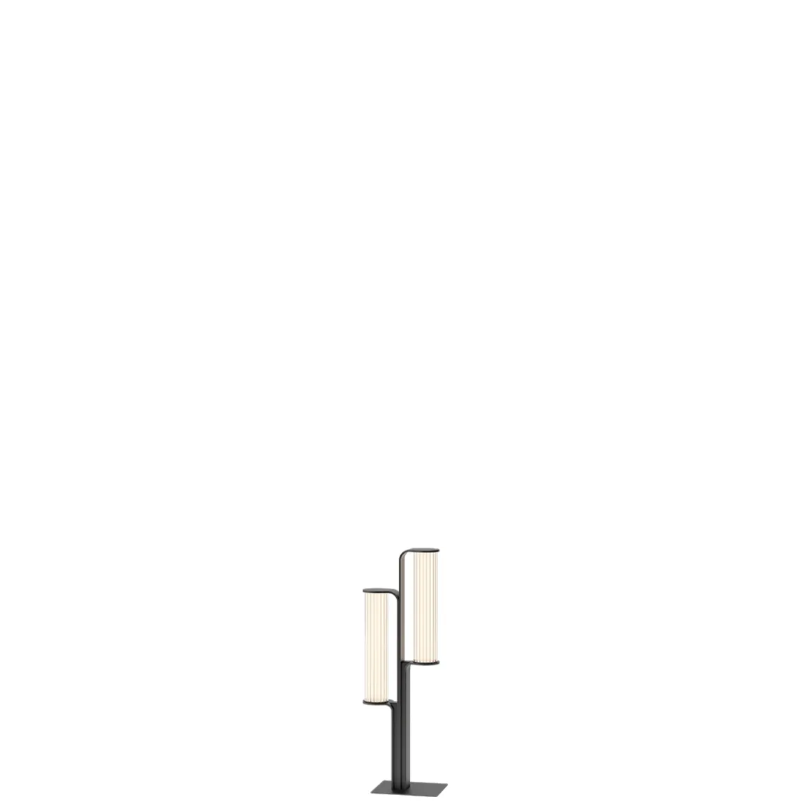 Class de Vibia par Sebastian Herkner. Inspiré du design du début du XXème siècle, le lampadaire Class apporte une note de raffinement et d’intimité à tout espace extérieur, tout en remplissant ses fonctions de borne lumineuse fonctionnelle et performante. Plutôt que de jouer sur l’intégration discrète au sein du jardin, la lampe d’extérieur Class se dresse fièrement avec élégance, son diffuseur cylindrique en verre émettant une douce lumière diffuse. Chaque tube est équipé d’un ruban LED avec réglage d’intensité.