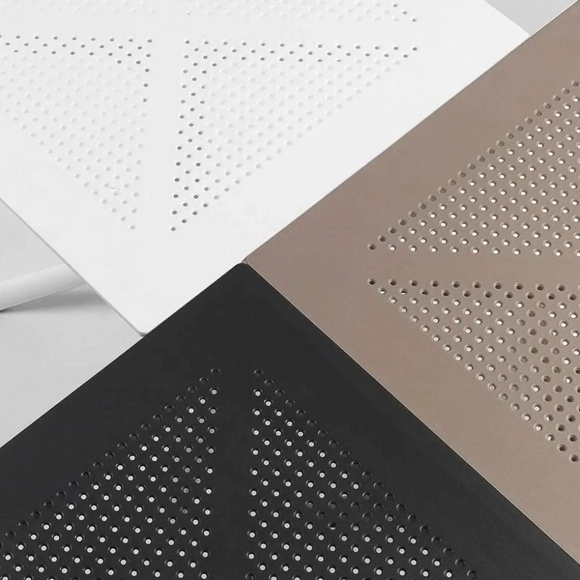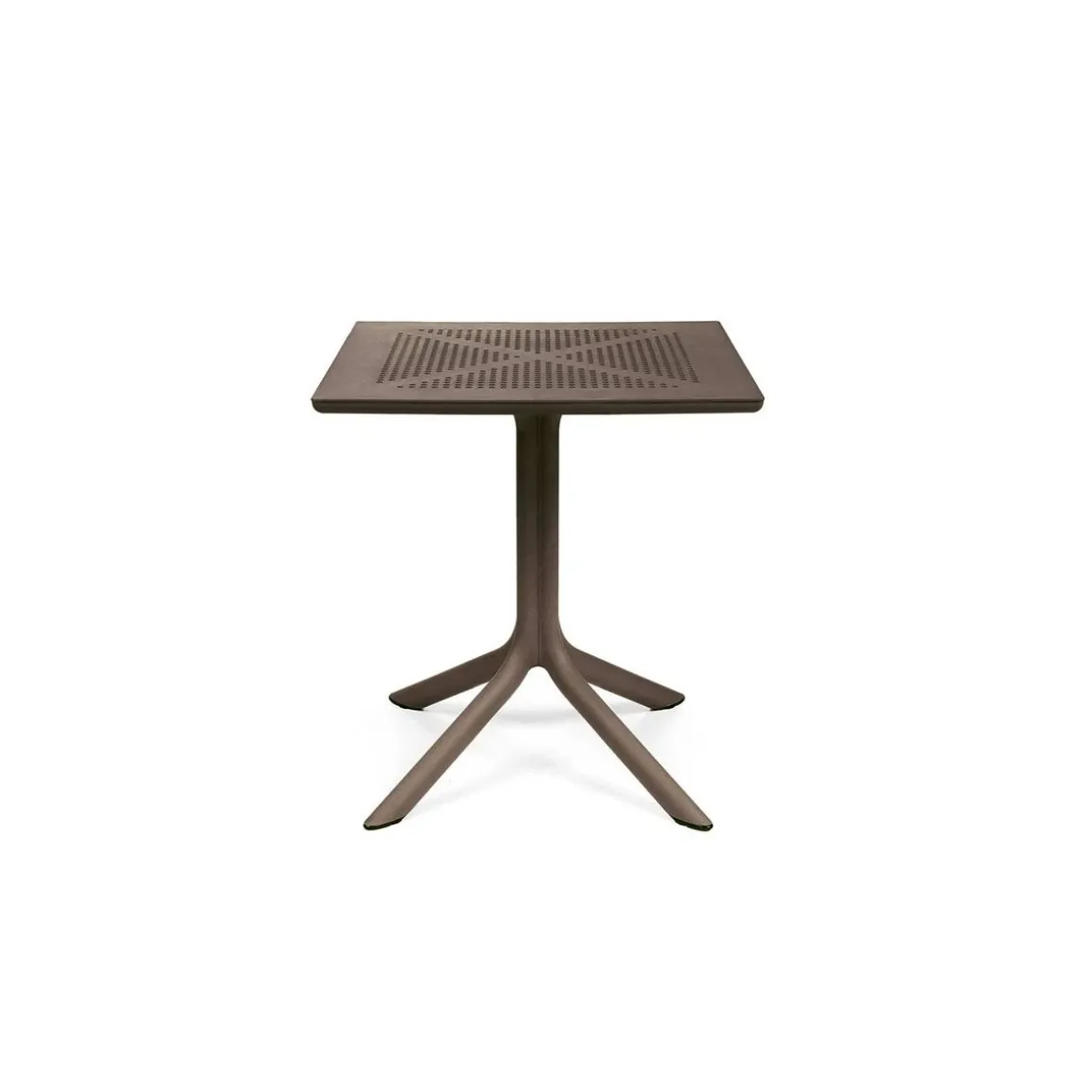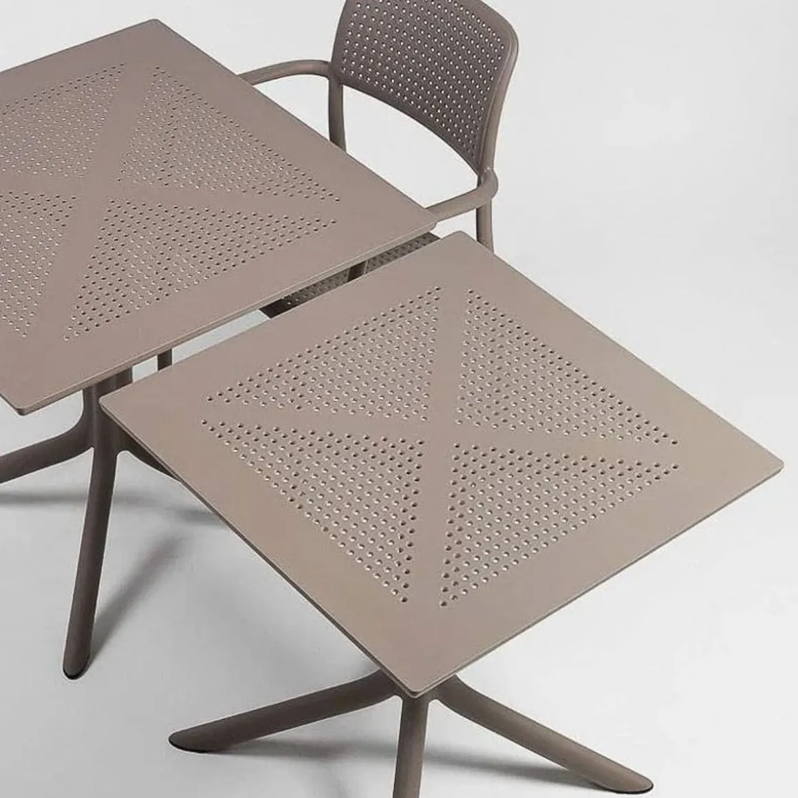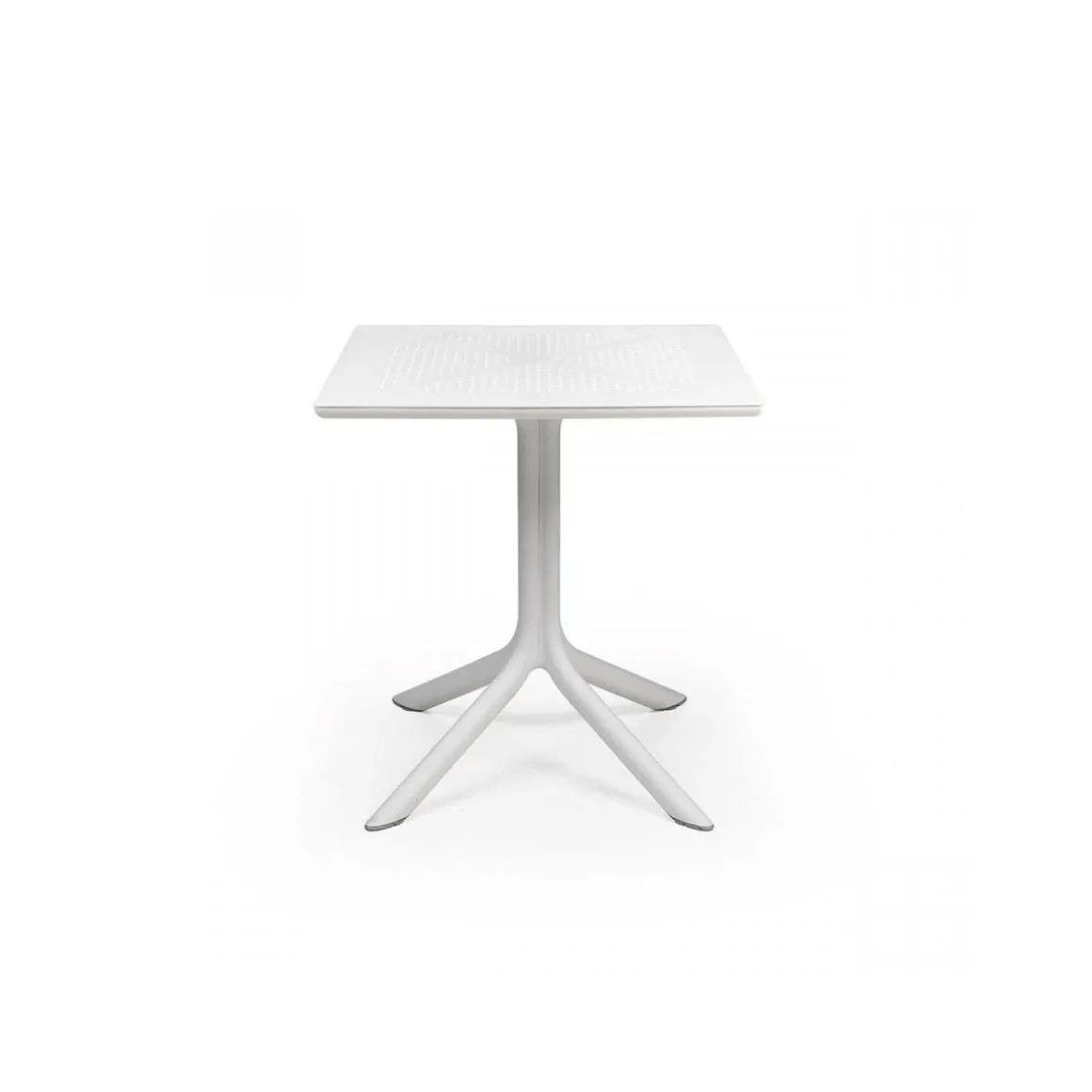 Clip 70 de Nardi par Raffaello Galiotto. Conçue tout spécialement pour occuper peu d’espace, Clip est une table carrée professionnelle en résine fibre de verre, à pied central à quatre branches, dotée d’un plateau DurelTop comportant un motif à cercles ajouré photogravé.