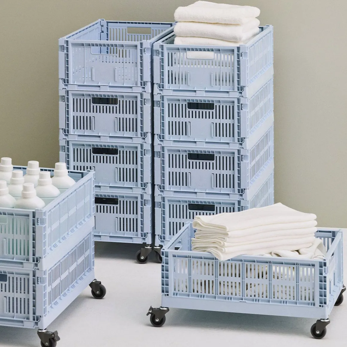 Colour Crate de Hay. Conçues pour être utilisées avec les caisses Colour Crate, les roulettes rehaussent le conteneur, facilitant son déplacement et offrant des fonctionnalités et des possibilités de rangement supplémentaires. Dotées d’un système d’enfichage simple et de deux roulettes d’arrêt, les roulettes Colour Crate sont faciles à monter et efficaces à utiliser. La gamme Colour Crate de HAY est une gamme de boîtes de rangement pratiques et adaptables, au design perforé. Fabriquées à partir de plastique post-consommation 100% recyclé. Elles s’emboîtent les unes dans les autres selon de multiples configurations, ce qui les rend idéales pour le rangement, l’exposition et même pour des meubles innovants.