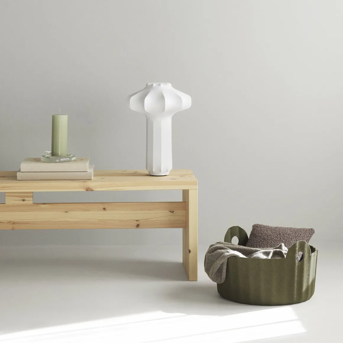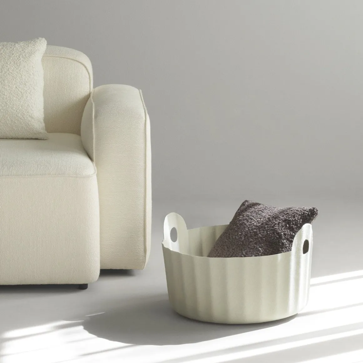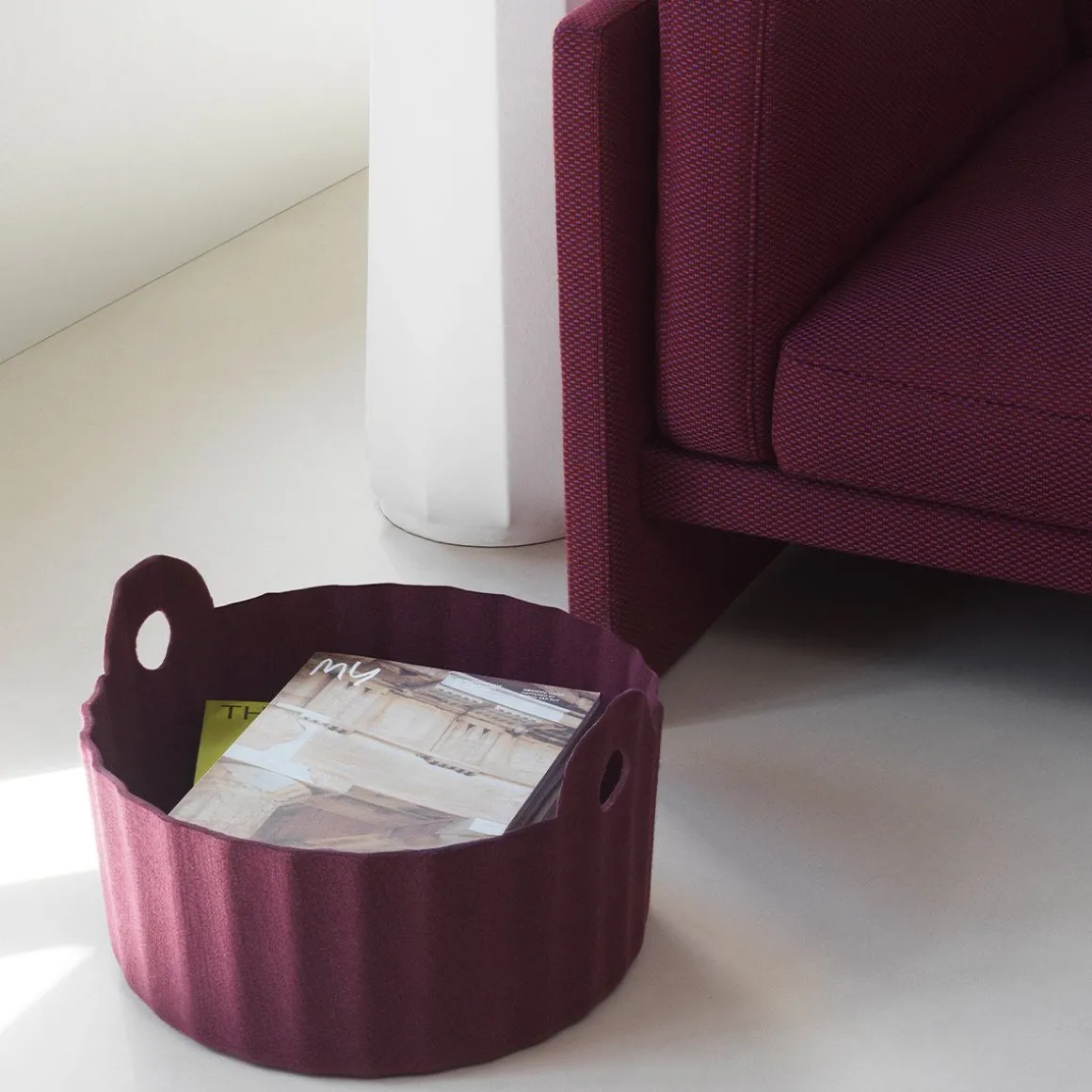 Colu de Normann Copenhagen par Baptiste Vandaele. Le panier Colu, imaginé par le designer belge Baptiste Vandaele, réinvente le rangement en alliant praticité et raffinement. Fabriqué en feutre PET recyclé, un matériau à la fois résistant et doux, issu de bouteilles en plastique usagées, ce panier léger est doté de poignées parfaitement intégrées, idéales pour ranger magazines, jouets ou objets de la maison.