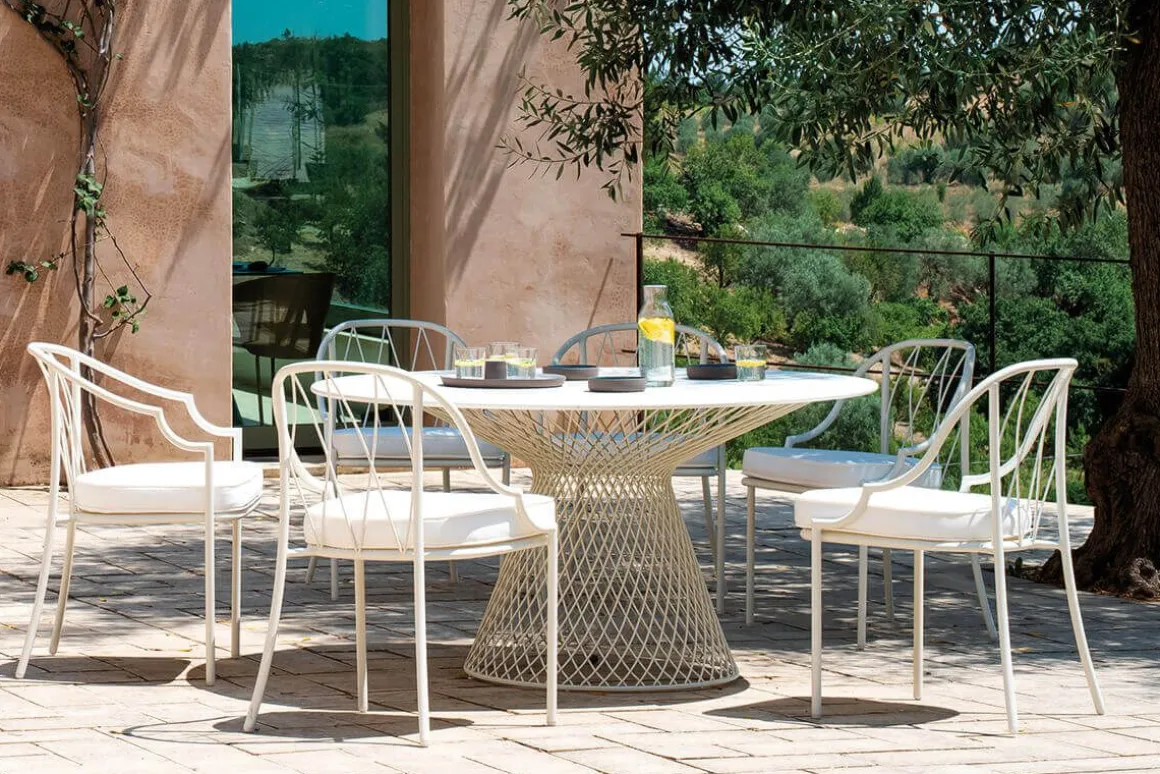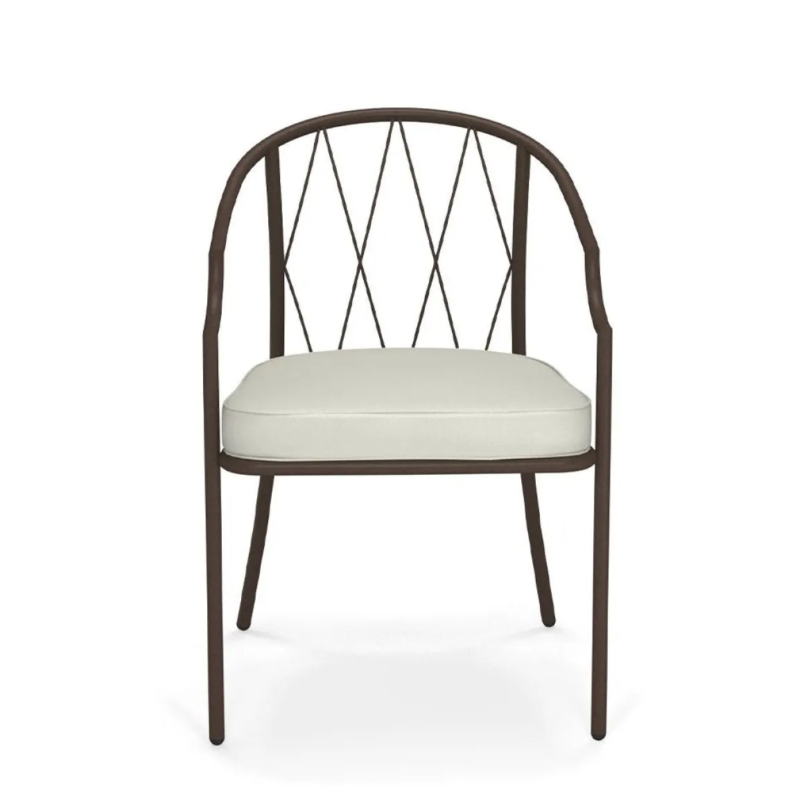 Como est une collection complète de sièges et tables comprenant : chaise et petit fauteuil dining, petit fauteuil dining à dossier haut, fauteuil, canapé, table ronde et table basse. La structure des sièges est en tube d’acier Ø 22, de 2 mm d’épaisseur, pour de hautes prestations en extérieur. Des ronds d’acier, qui constituent le motif décoratif du dossier, sont rattachés à la structure : ces ronds sont soudés par projection, selon une technologie qui permet une fusion des ronds techniquement plus propre, avec un effet esthétique mieux fini et, partant, un risque de rouille moins élevé. La tôle étirée de l’assise est galvanisée à chaud, en vue d’une résistance élevée en extérieur, et est elle aussi soudée à la structure par projection. Comme pour tous les produits EMU en acier, il est prévu un pré-traitement de cataphorèse, puis l’application d’une peinture poudre thermodurcissable ; le produit est ainsi recouvert d’une couche de peinture d’une épaisseur homogène, présentant un degré élevé d’adhérence et de résistance. La présence d’embouts en nylon à l’extrémité des pieds permet de protéger et de mieux déplacer le produit.