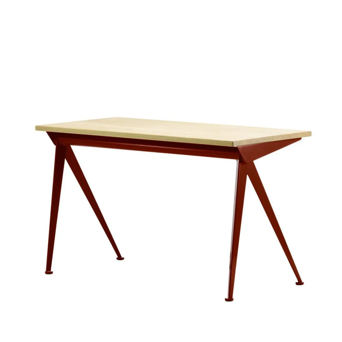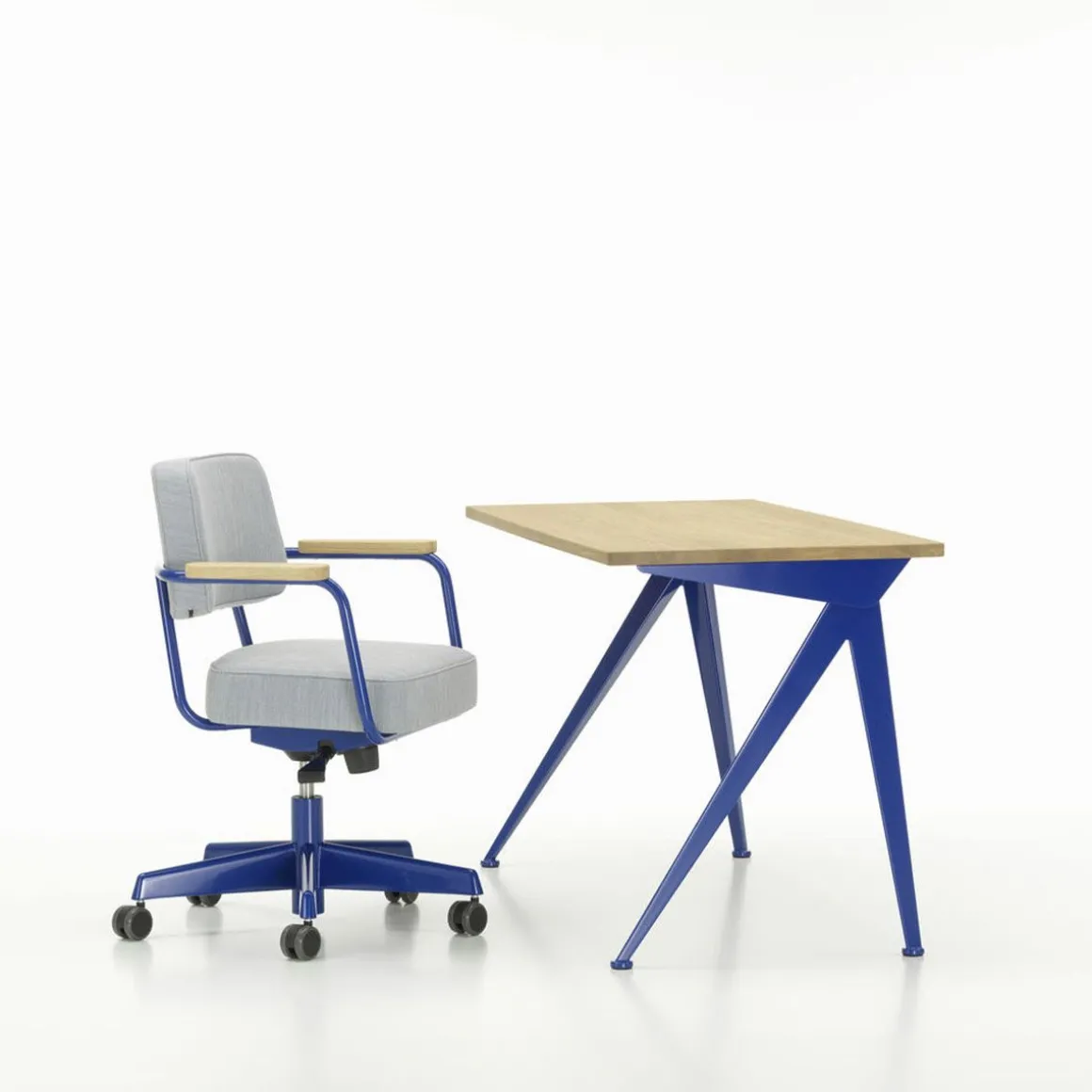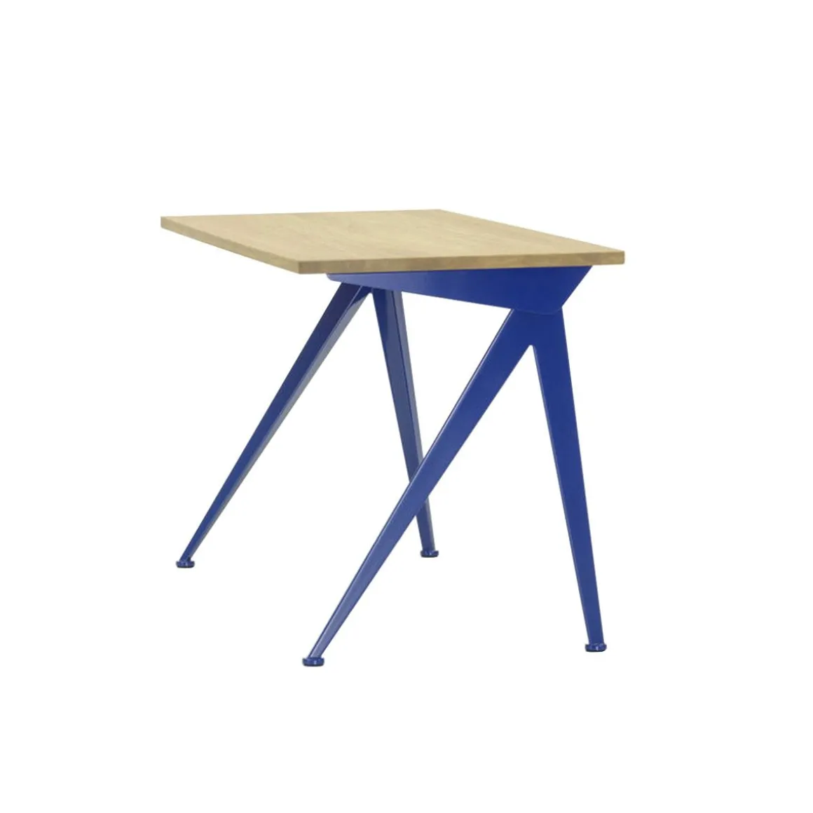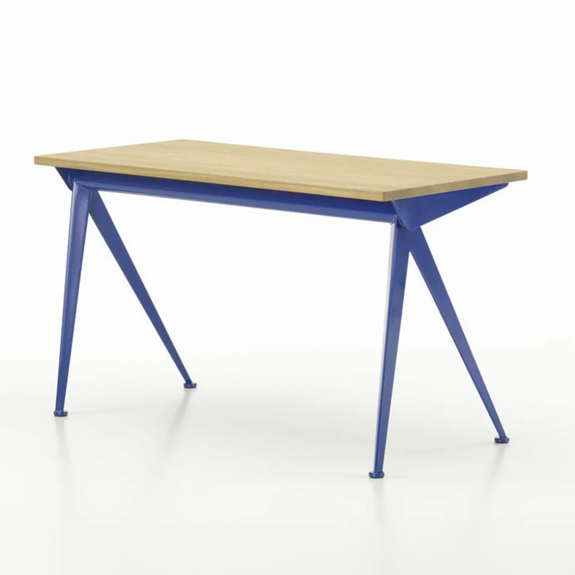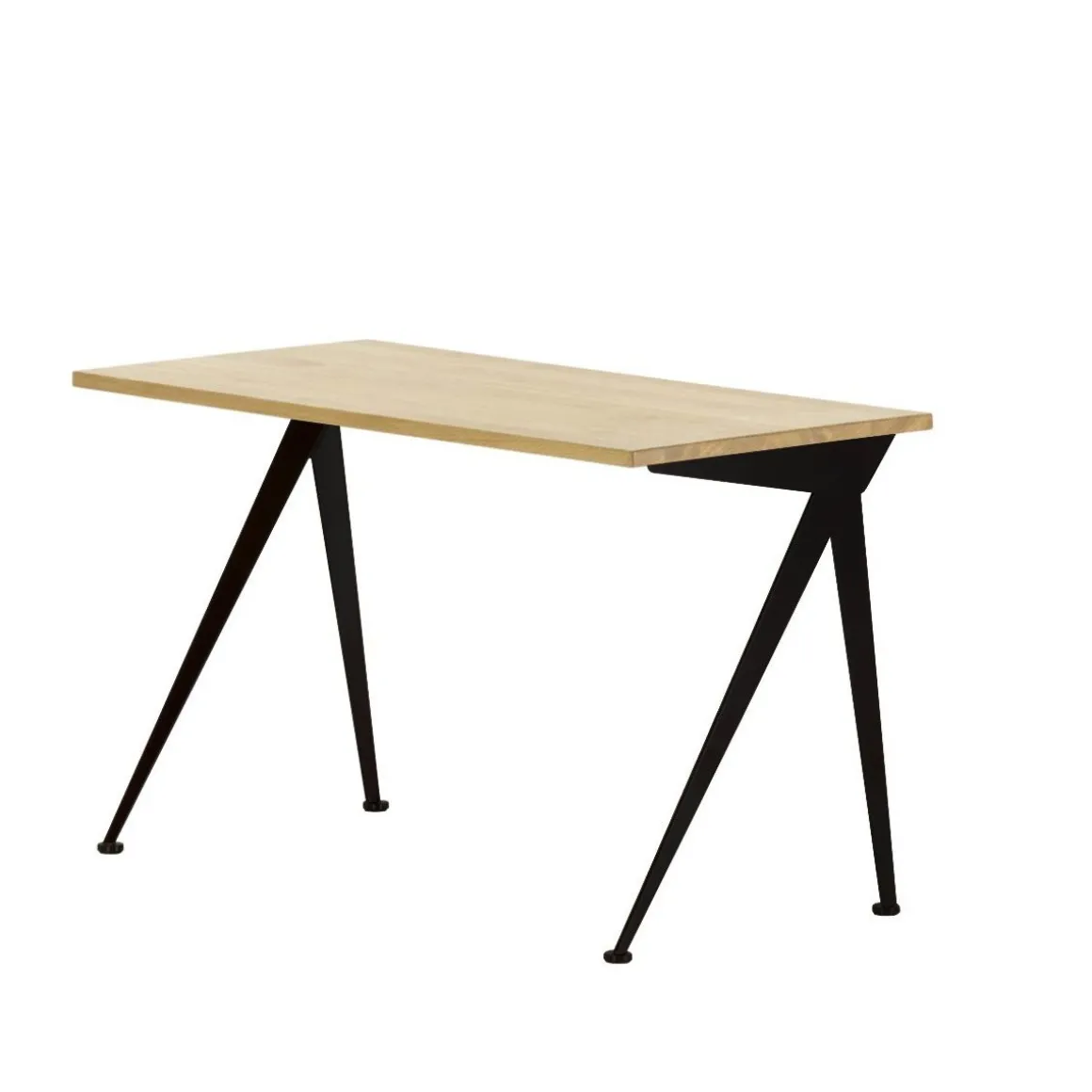 Vers 1950, Jean Prouvé crée la table Compas dans différentes versions qui sont basées sur les principes constructeurs de sa personnalité. Leur point commun sont les pieds métalliques fins, ouverts en diagonale, qui rappellent l’ouverture des branches d’un compas. Le plateau en bois massif confère à Compas Direction un charme individuel. Avec ses dimensions compactes, cette table parfaire pour un bureau à domicile nécessitant peu de papier.