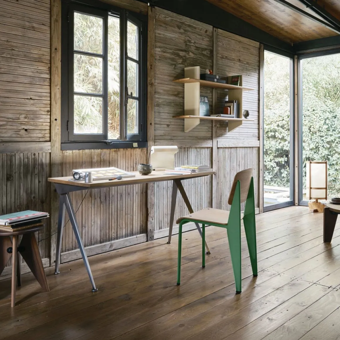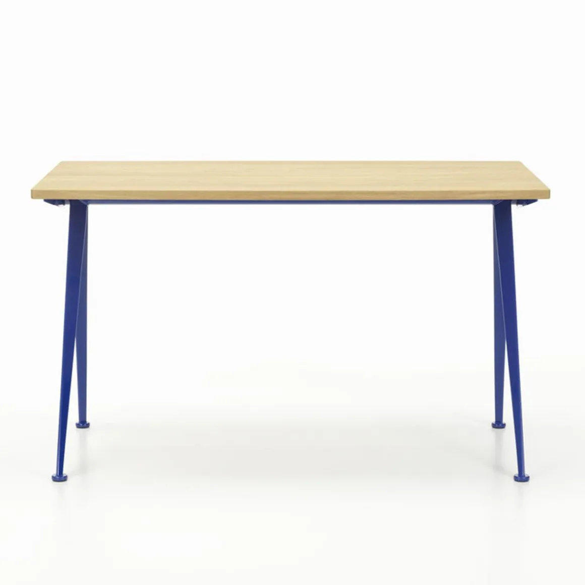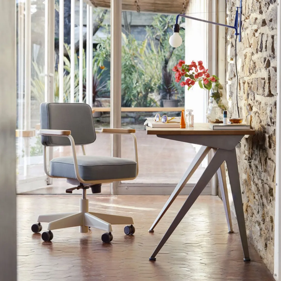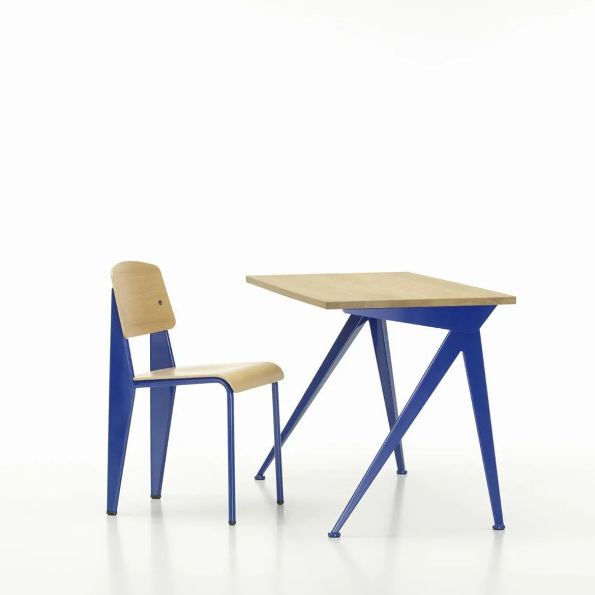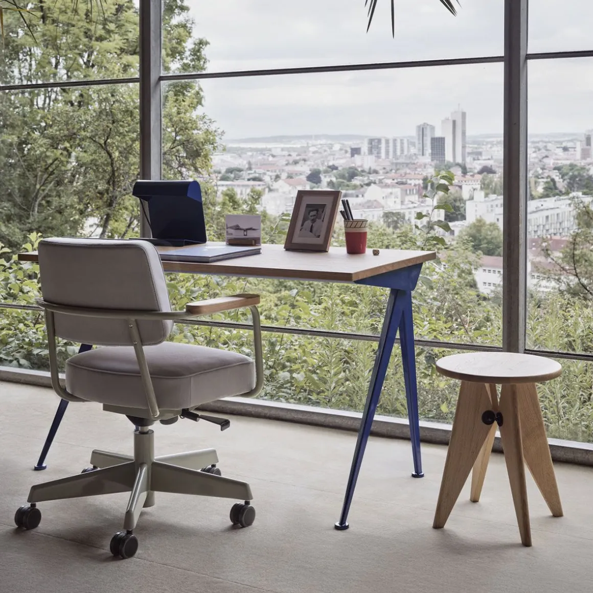 Vers 1950, Jean Prouvé crée la table Compas dans différentes versions qui sont basées sur les principes constructeurs de sa personnalité. Leur point commun sont les pieds métalliques fins, ouverts en diagonale, qui rappellent l’ouverture des branches d’un compas. Le plateau en bois massif confère à Compas Direction un charme individuel. Avec ses dimensions compactes, cette table parfaire pour un bureau à domicile nécessitant peu de papier.
