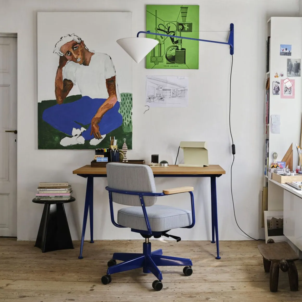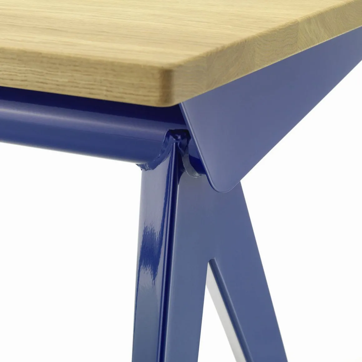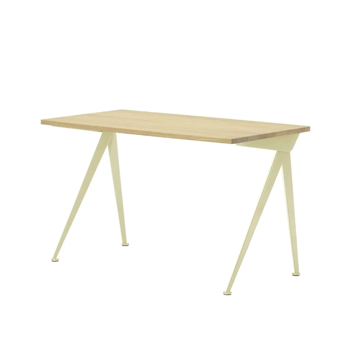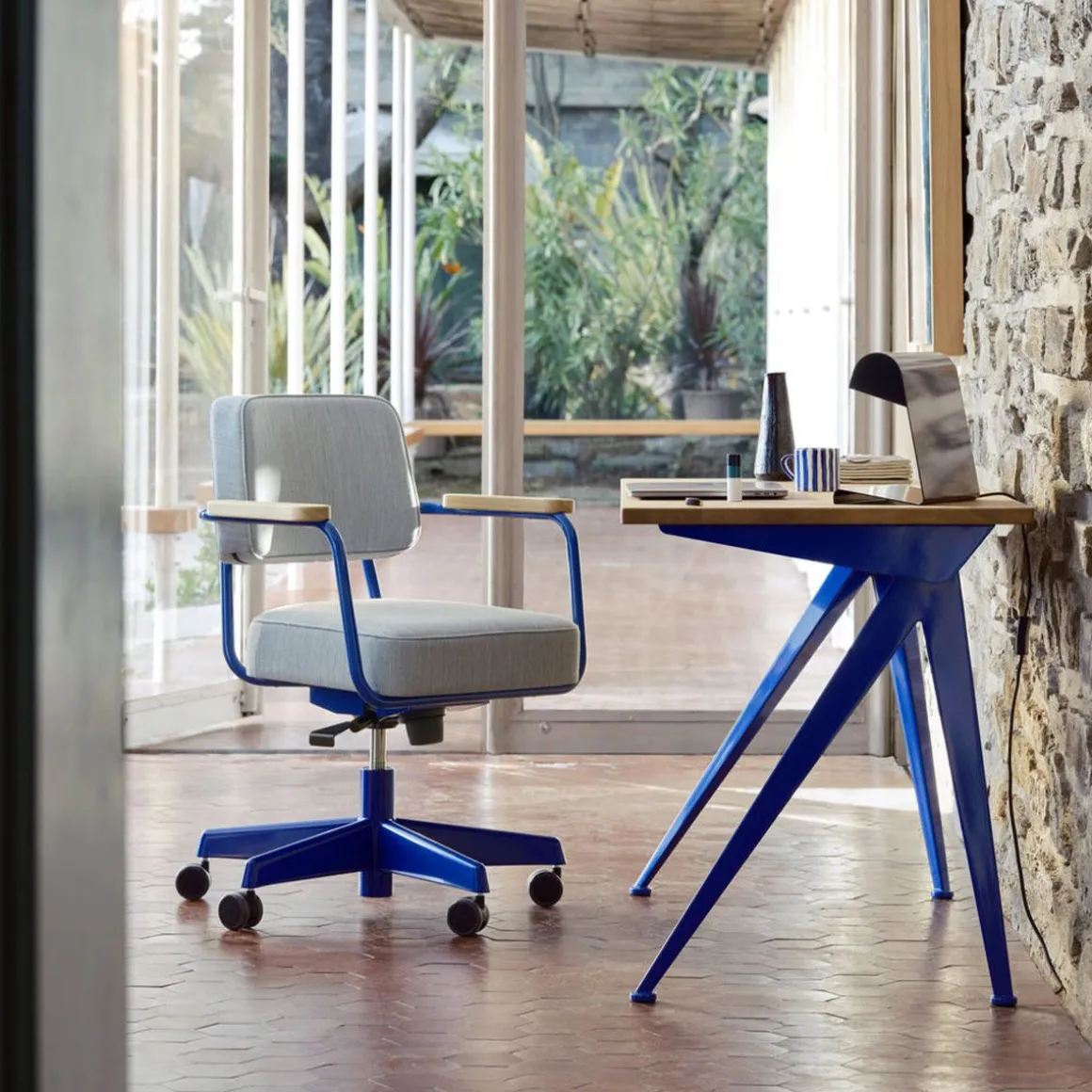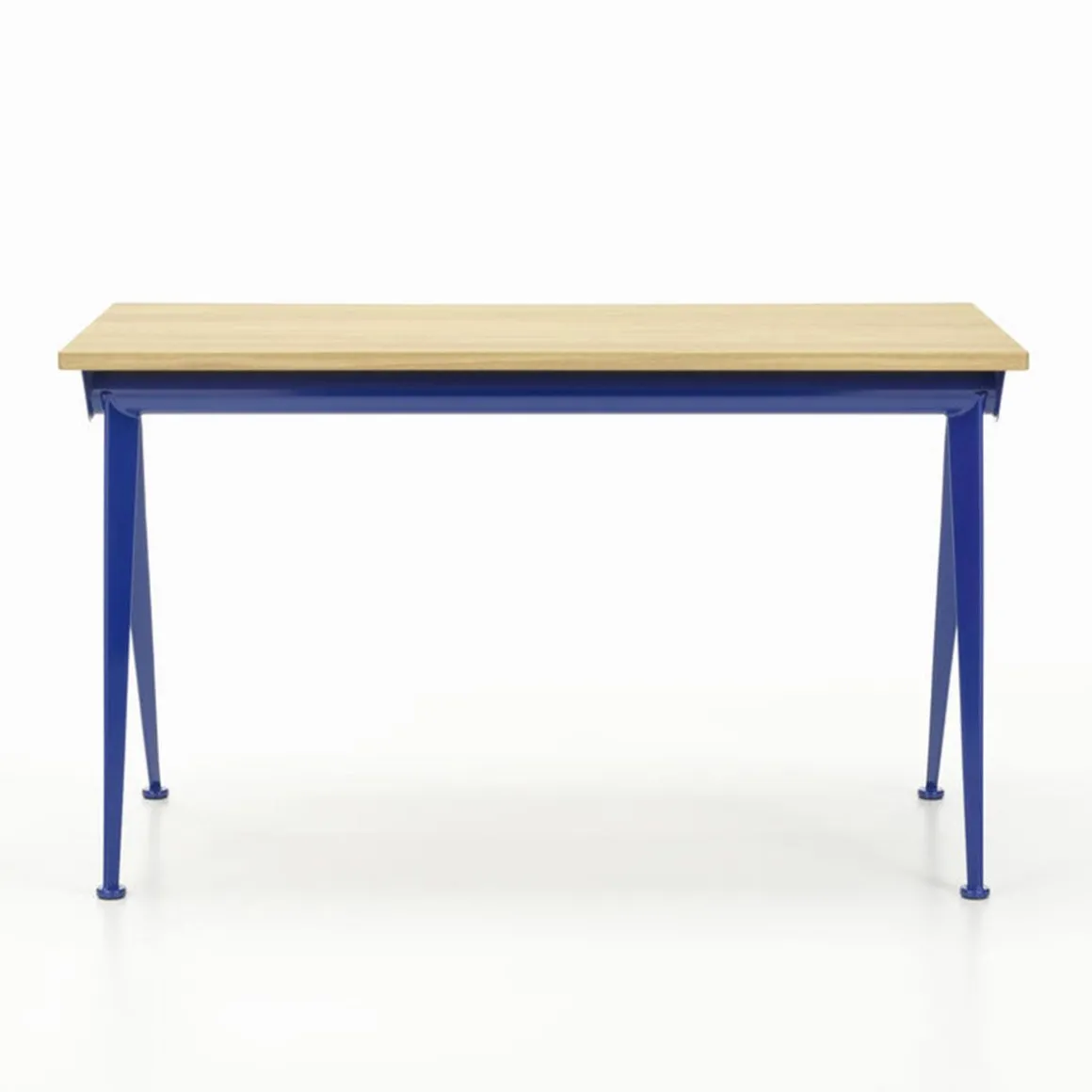 Vers 1950, Jean Prouvé crée la table Compas dans différentes versions qui sont basées sur les principes constructeurs de sa personnalité. Leur point commun sont les pieds métalliques fins, ouverts en diagonale, qui rappellent l’ouverture des branches d’un compas. Le plateau en bois massif confère à Compas Direction un charme individuel. Avec ses dimensions compactes, cette table parfaire pour un bureau à domicile nécessitant peu de papier.