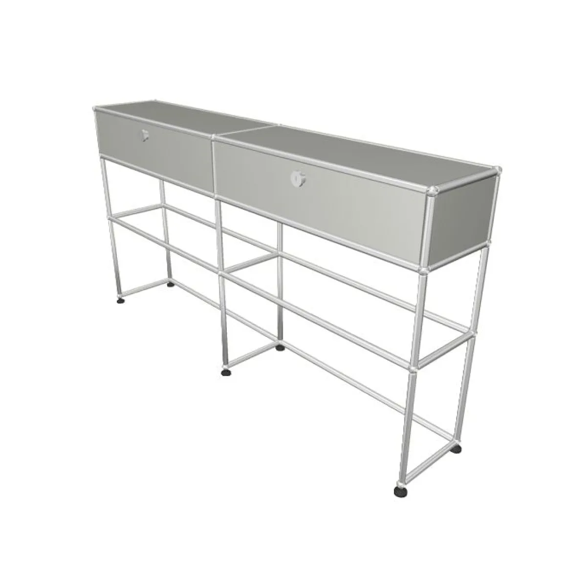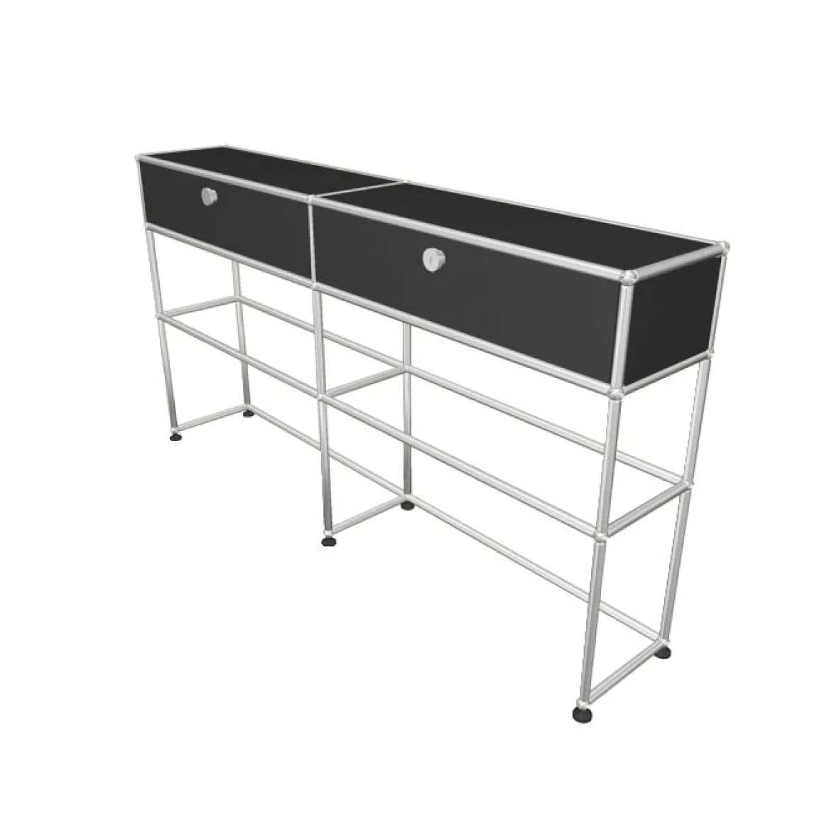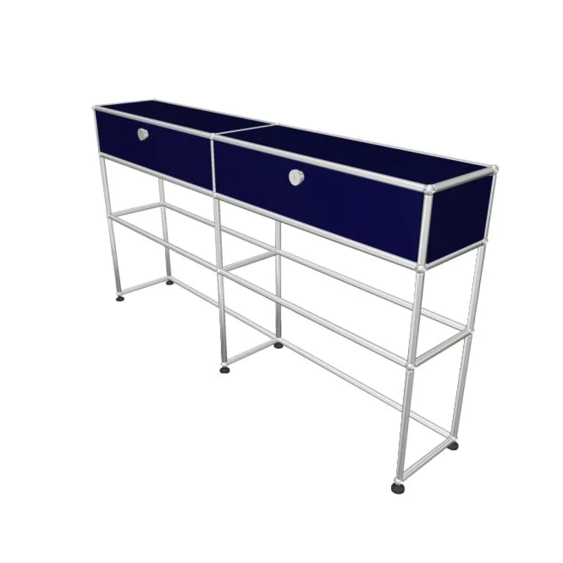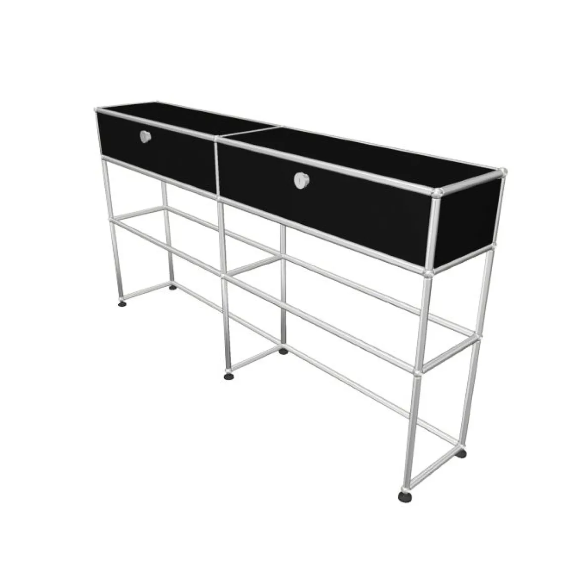 Une boule chromée constitue le centre d’articulation de l’ensemble du système d’aménagement USM Haller. Point de jonction névralgique d’un système de tubes de différentes longueurs elle permet la construction de meubles en 3 dimensions, divers et uniques dans leur forme comme dans leur utilisation. A cette structure porteuse modulaire se rajoutent des éléments de parement en tôle laquée époxy ( 14 coloris) ou en verre, des éléments d’aménagement intérieur et un ensemble de portes ou tiroirs vient terminer la composition. Chaque parement USM peut être de couleur différente.