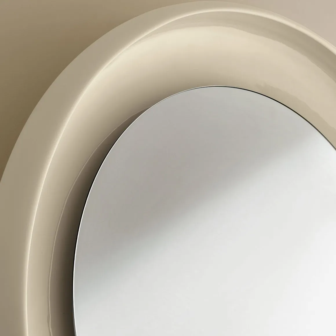 Coque de Miniforms par Alain Gilles. Coque a un style dynamique et plein de contrastes. Le miroir est protégé par une coque en céramique, où se côtoient deux finitions opposées : brillante et mate. La surface de la partie interne est émaillée et brillante tandis que le revêtement extérieur est texturé. Le miroir se transforme en un objet précieux qui met en valeur les matériaux naturels, où les reflets se multiplient et donnent un sens au living.