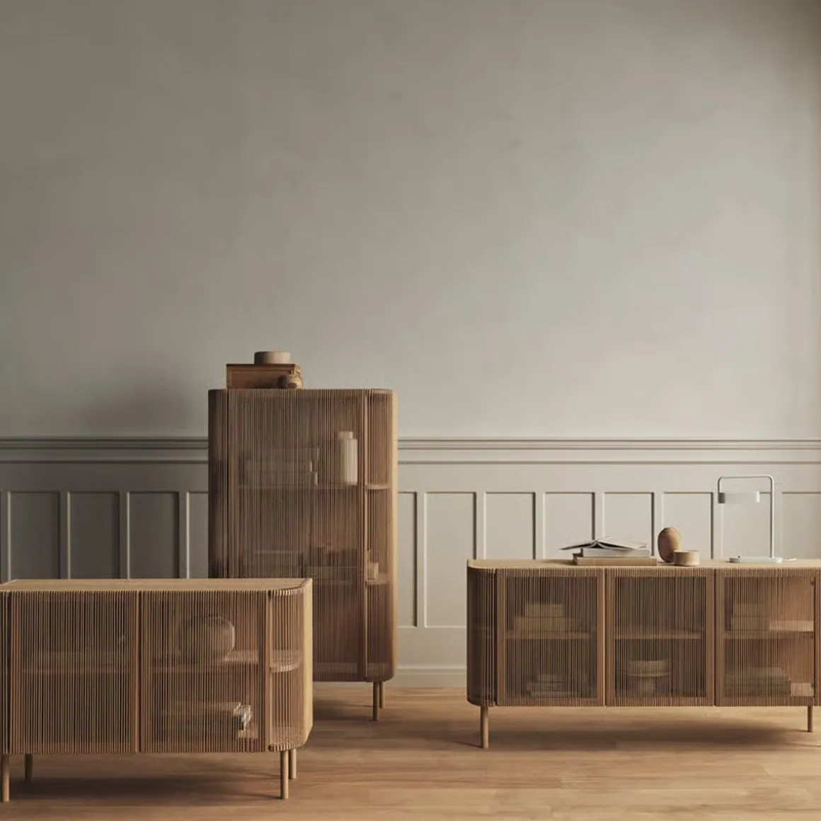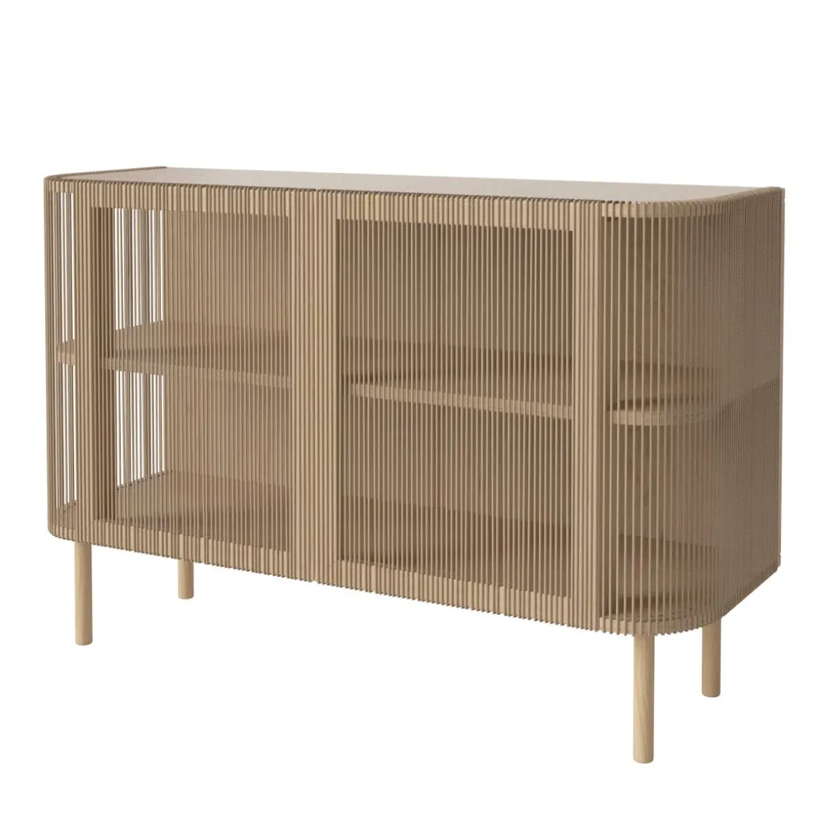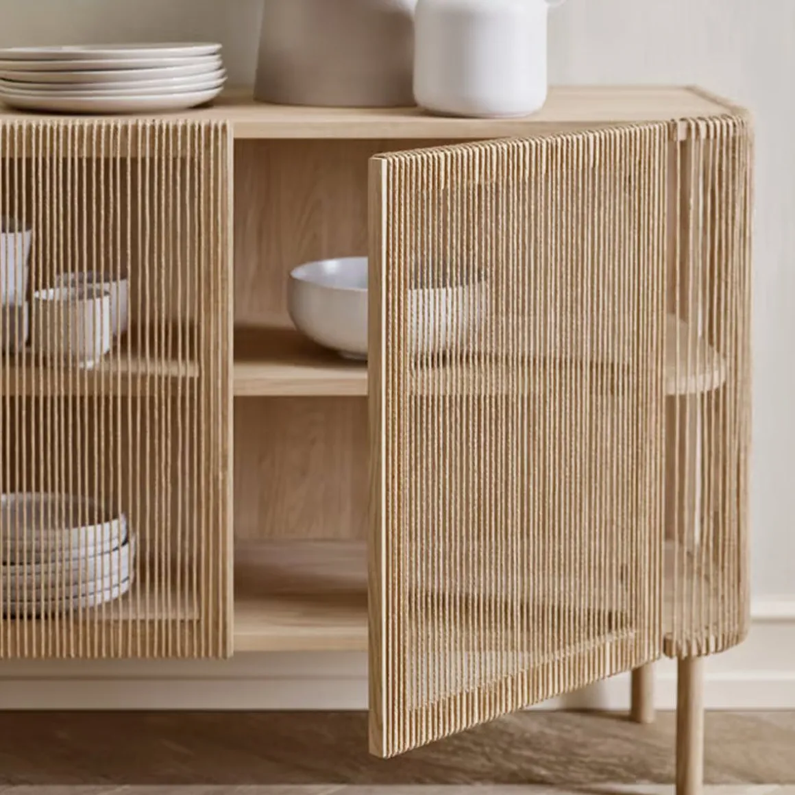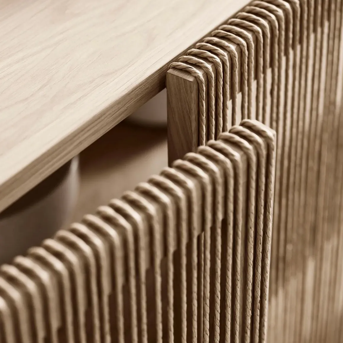 Buffet en corde de Bolia par Hertel & Klarhoefer. Cord est une série de buffets et de buffets hauts en chêne massif, à l’allure lourde et imposante, contrastant avec les cordons de papier tressés qui créent une façade aérienne et accrocheuse. Le tressage fin comme du papier est un atout indéniable. La marque danoise Cord est développée et produite dans la petite ville danoise de Randers, où les influences locales renforcent ses origines de savoir-faire artisanal de qualité.