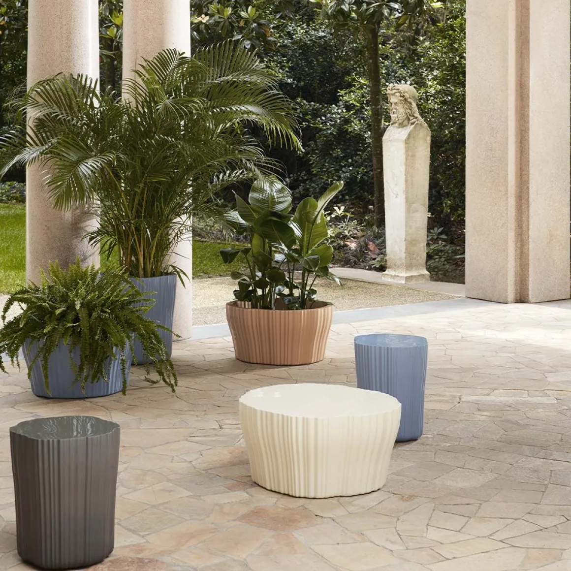 Les tables et les jardinières CORTEZA de Patricia Urquiola qui s’ajoutent à la collection sont fabriquées en matériaux recyclés. Leur motif strié n’est pas sans rappeler le monde végétal et leur donne l’aspect d’écorces naturelles. Ces éléments comprennent une table d’appoint, une table basse et deux jardinières. Ils trouvent tous leur place dans l’environnement en lui conférant une note naturelle et harmonieuse.