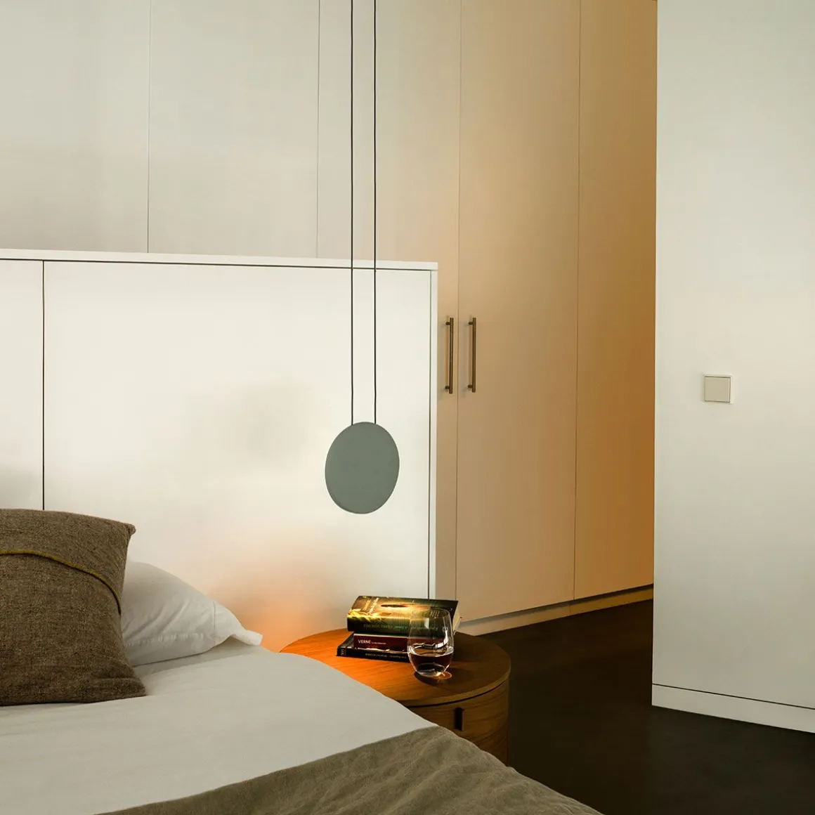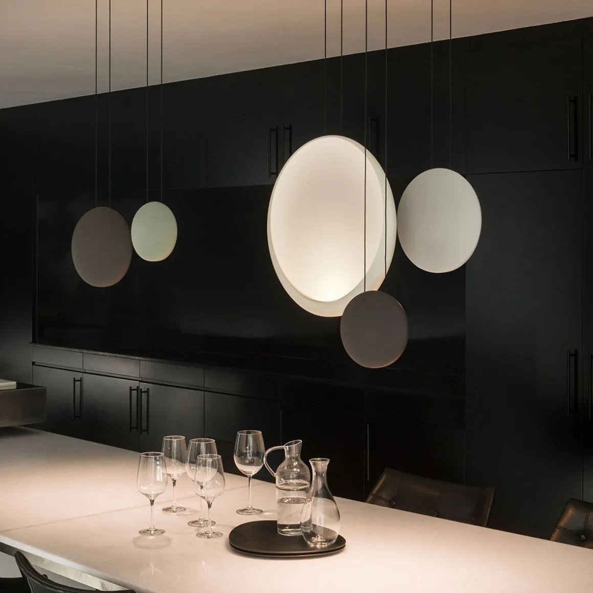 Ce disque plat suspendu dans les airs évoque un astre mystérieux flottant dans l’espace… Imaginée par le trio Lievore Altherr Molina, la collection de suspensions Cosmos se compose de disques en polycarbonate au design minimal, déclinés dans différents diamètres et dans une superbe palette de couleurs chaudes. Leur finition mate évoque une texture minérale. La puissante LED est totalement intégrée sous le disque créant ainsi une symbiose parfaite entre le design et la source d’éclairage. Les suspensions Cosmos diffusent une lumière directe et fonctionnelle, orientée vers le bas.