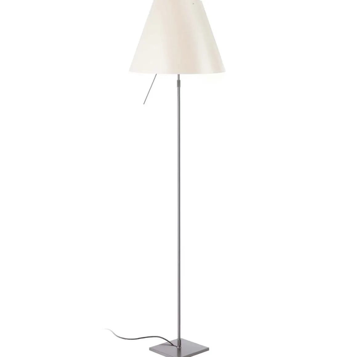 Lampadaire à la forme généreuse avec structure télescopique (réglable en hauteur). La structure est en aluminium et l’abat-jour en polycarbonate blanc. Sous une allure faussement classique, Grande Costanza impose une présence très design, alliant séduction, élégance et sobriété. Son abat-jour surdimensionné est réalisé en polycarbonate. Il diffuse une lumière douce et intense, idéale pour éclairer chaleureusement les volumes des intérieurs privé ou publics. Le contrepoids en acier chromé mat assure la stabilité tout en apportant une dimension décorative. La réglage de l’intensité se fait grâce à un variateur sensoriel en forme de petite tige, située sous l’abat-jour.