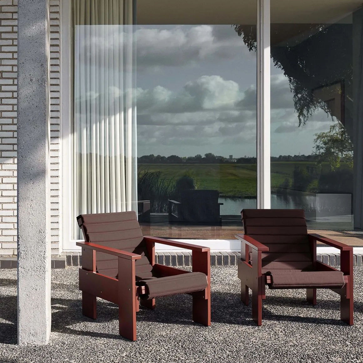 Coussin matelassé pour Fauteuil lounge Crate, de Hay par Gerrit Rietveld. Ajoutant un confort et une fonctionnalité supplémentaires à la collection Crate, le coussin Crate est spécialement conçu pour s’adapter parfaitement au siège de la chaise. Disponible en trois variantes différentes – un coussin de siège lâche pour la chaise Crate Dining Chair, ainsi que des motifs pliés et matelassés pour la chaise Crate Lounge Chair. Le modèle matelassé est doté d’une fermeture Velcro® sous le siège du coussin et de deux sangles qui se fixent autour du haut du cadre de la chaise, le siège et les coussins pliants étant tous deux dotés d’un fond antidérapant pour les maintenir solidement en place. Tous les modèles sont fabriqués en tissu enduit de Téflon® pour une finition hydrofuge, ainsi qu’une haute résistance aux UV, ce qui signifie qu’il est résistant à la décoloration avec de bonnes propriétés de solidité des couleurs. Les coussins sont disponibles en plusieurs couleurs et peuvent être utilisés toute l’année.