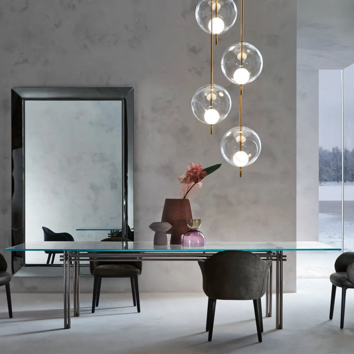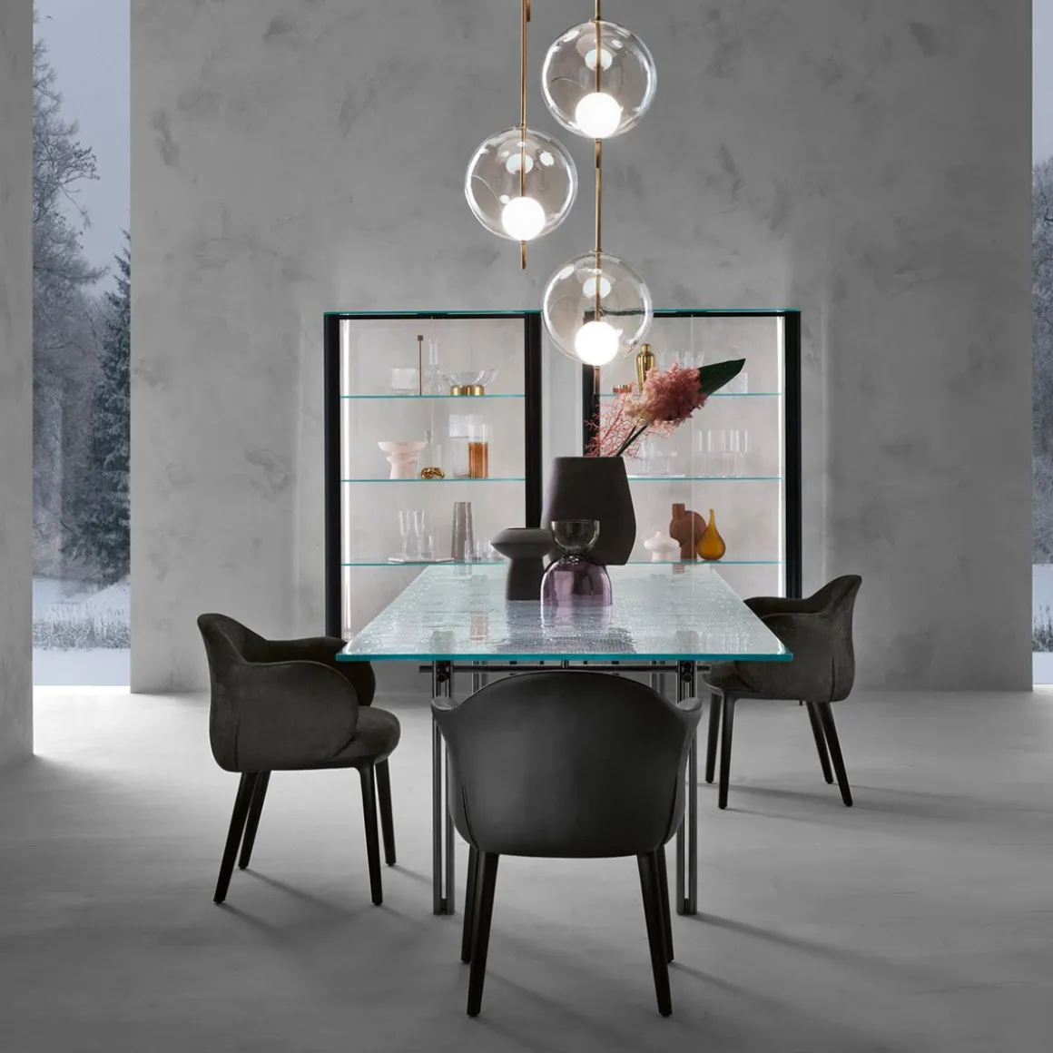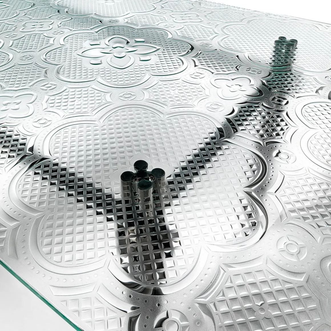 Table avec plateau en verre extra light de 15mm en fusion et trempé, disponible transparent. Base en métal, finition Titane opaque.