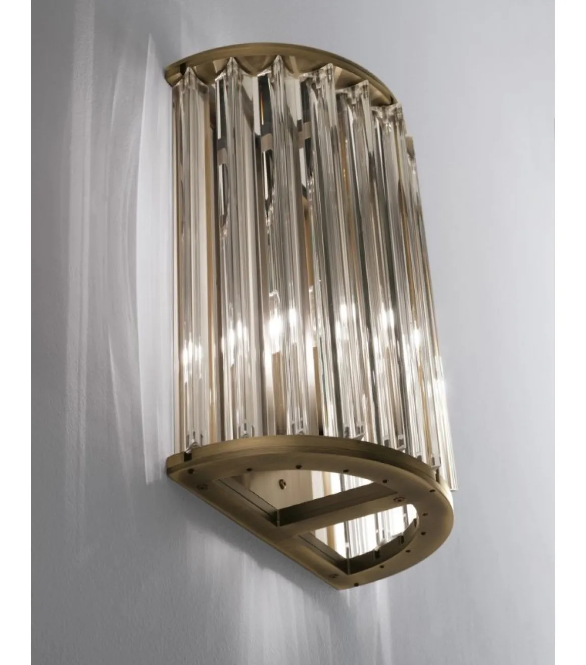 Crown conçue par Massimo Tonetto pour Venicem est un applique murale à lumière diffuse. Structure en bronze et trièdres en verre de Murano soufflé en cristal