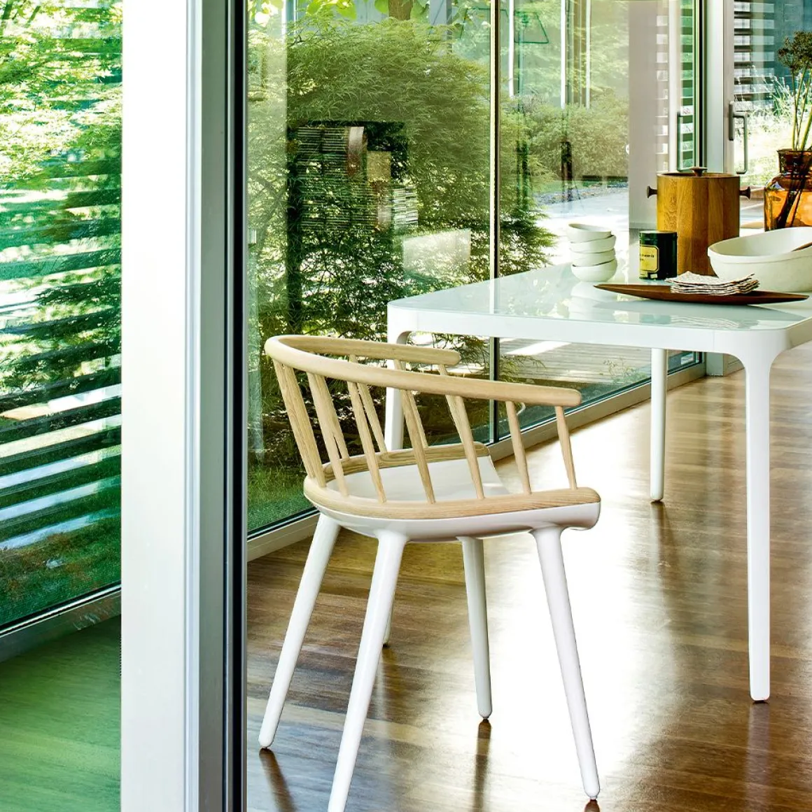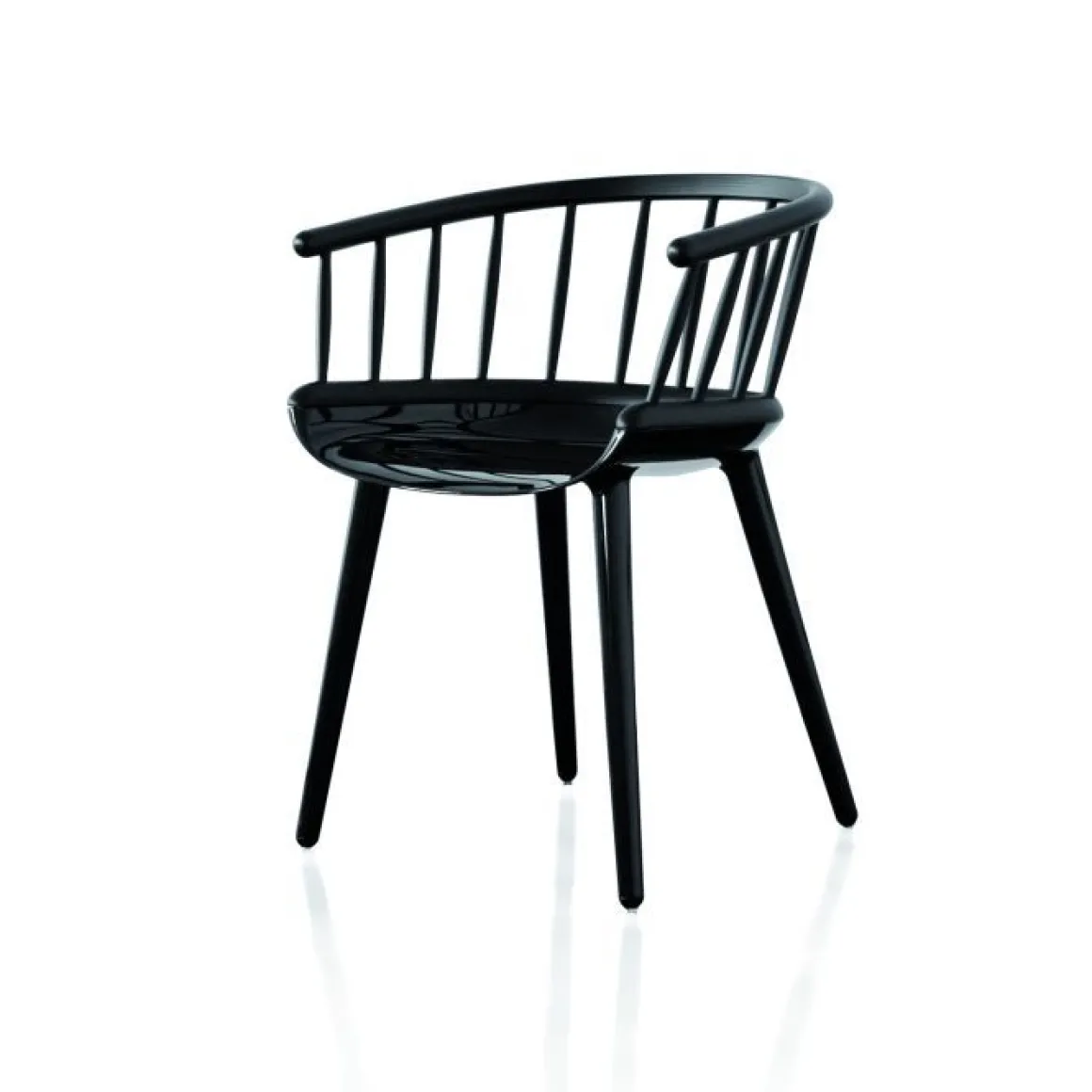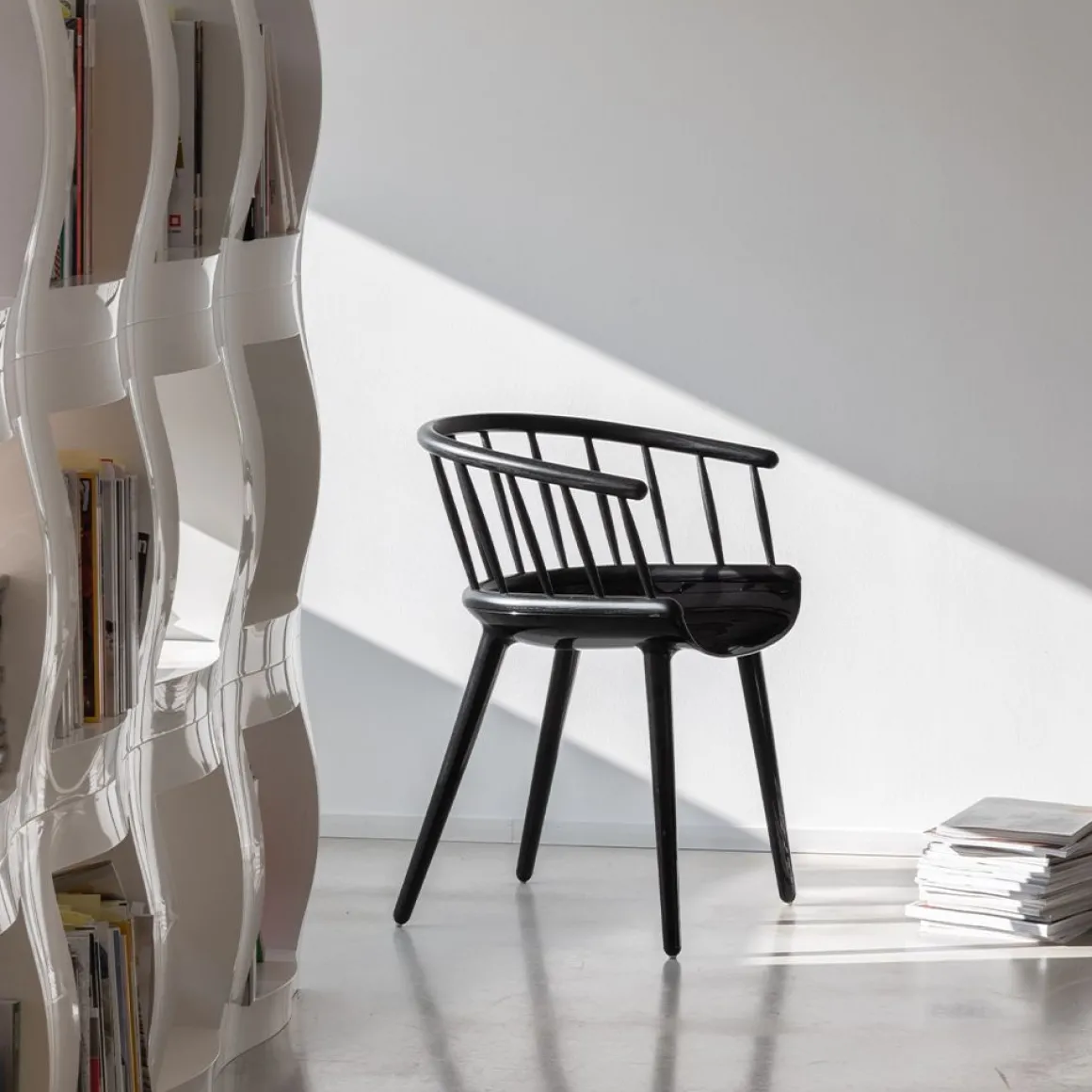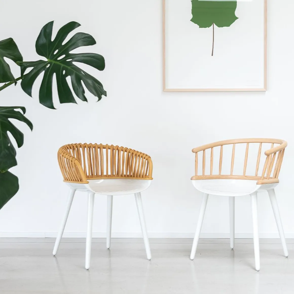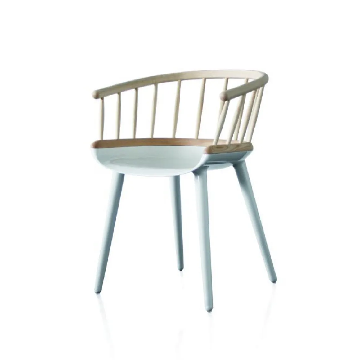 Matériaux : assise et pieds en polycarbonate blanc ou noir, dossier en frêne massif, naturel ou teinté noir