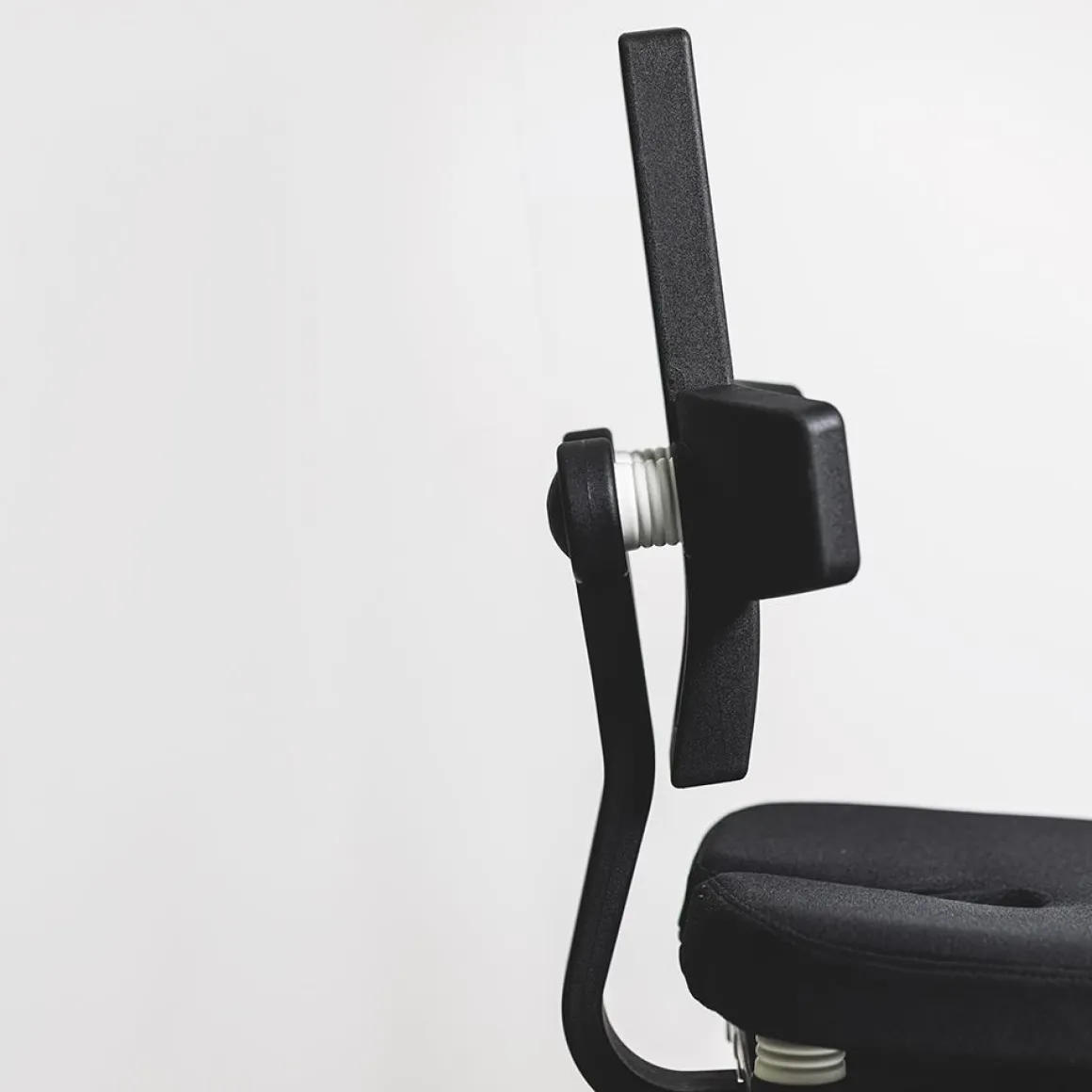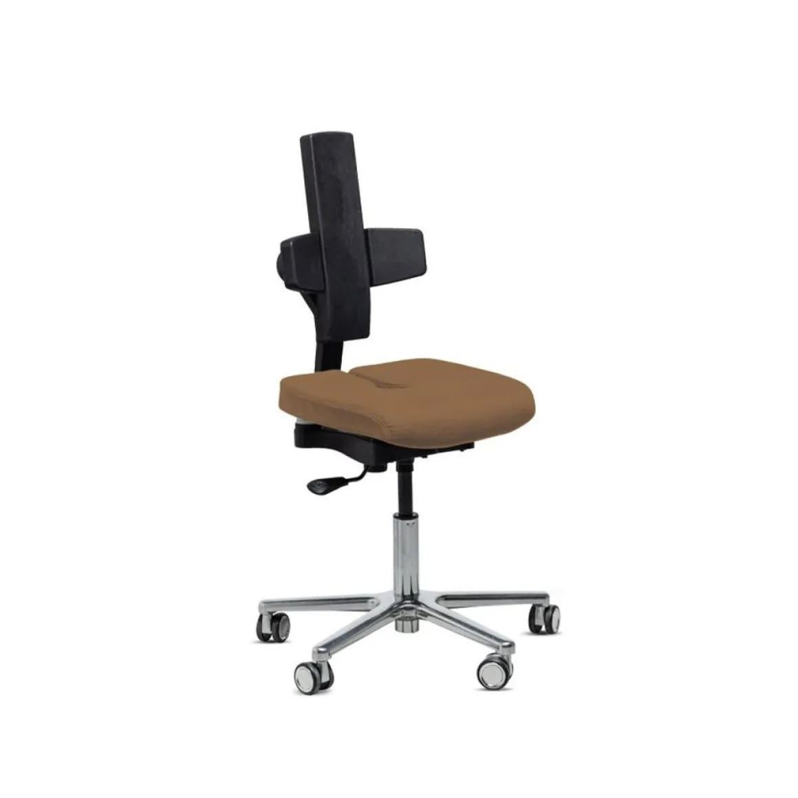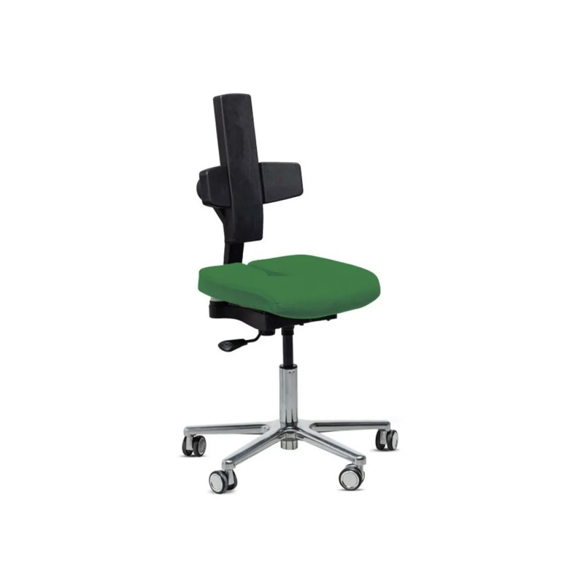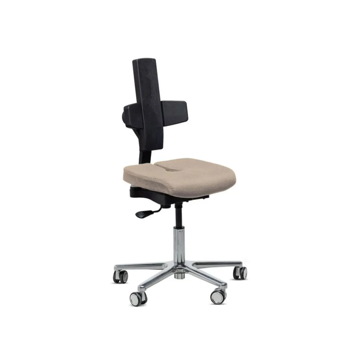 Matériaux : assise garnie revêtue en tissu, dossier polyuréthane plein, piètement aluminium, amortisseur d’assise, roulettes chromées.