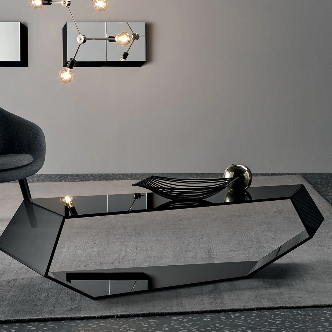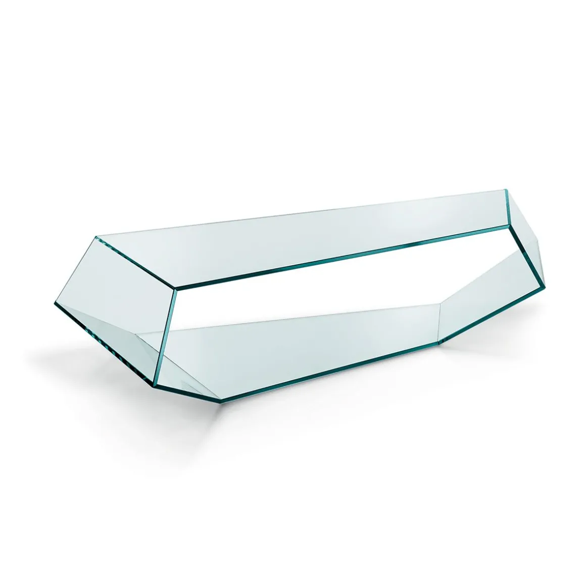 Les angles particuliers de cette table basse produisent un agréable effet de continuité de la surface en verre. Peut être placé directement sur le sol ou soulevé sur pieds (inclus).