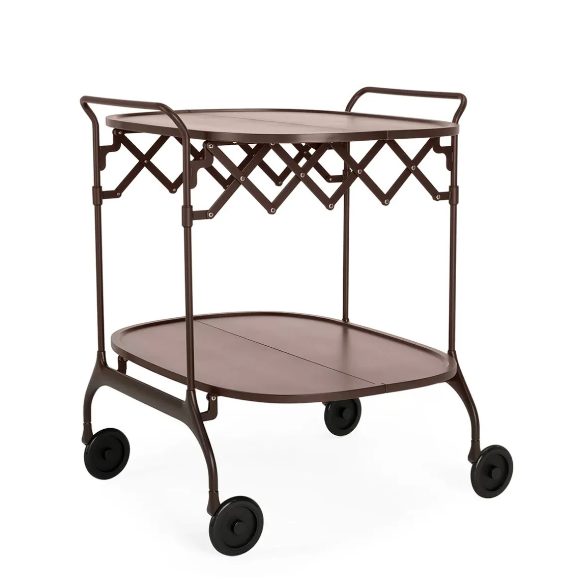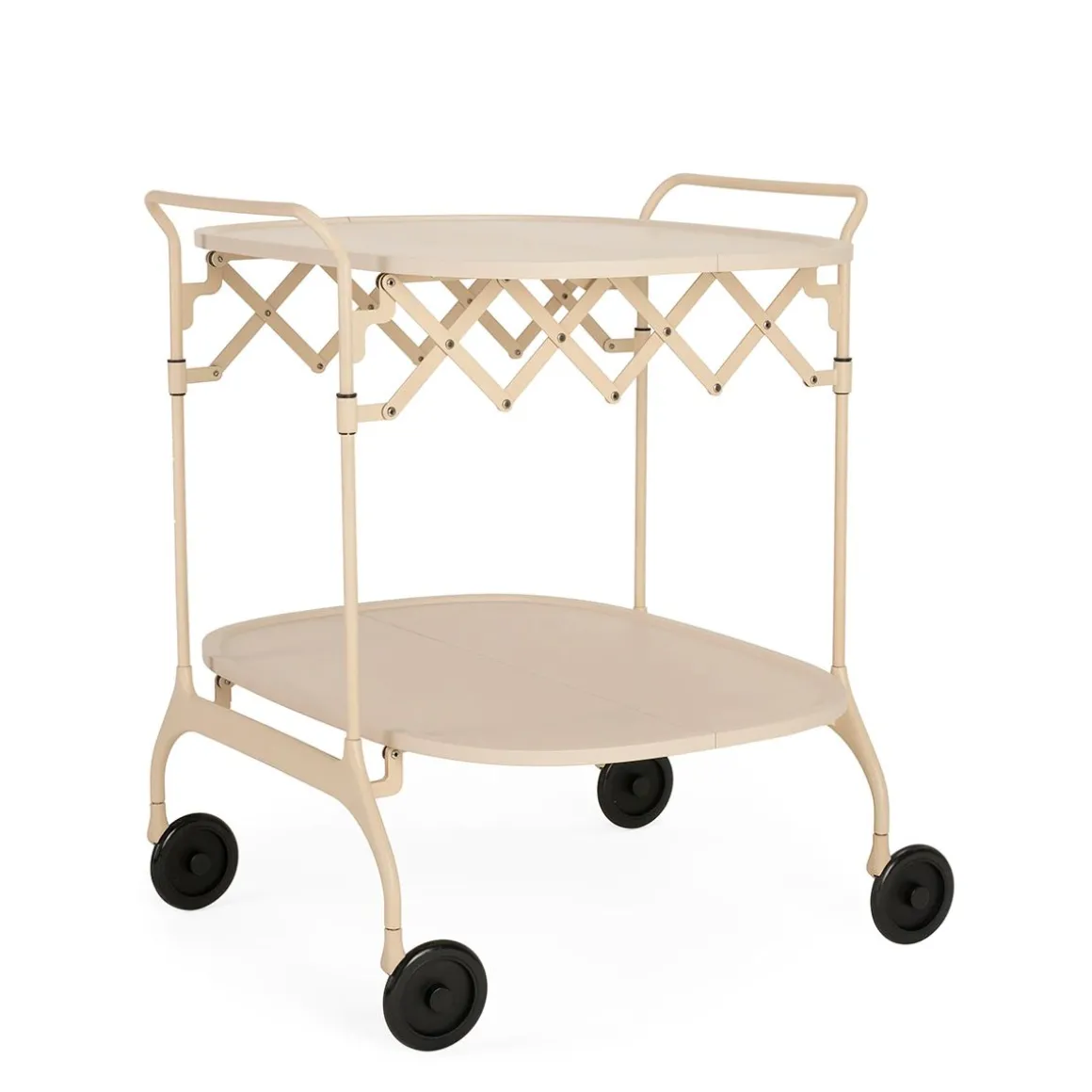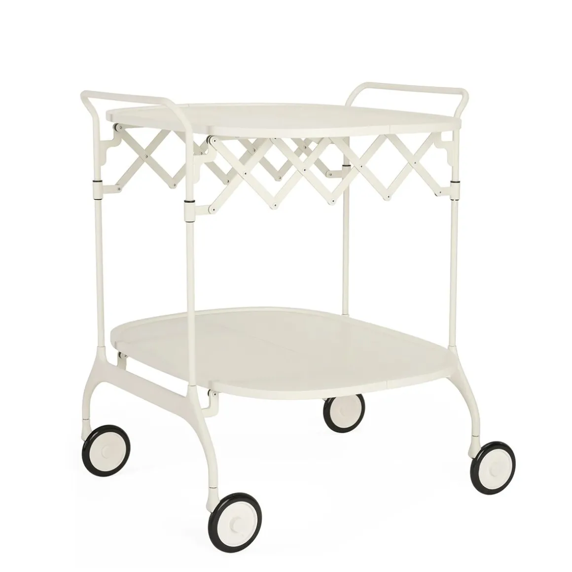 Gastone est un chariot pliant élégant et pratique, avec un plateau en plastique peint et une structure en acier peint. Les roues constituent un élément formel caractéristique et assurent une mobilité fonctionnelle. Une fois fermé, il a une profondeur de 23 cm et peut être facilement rangé.