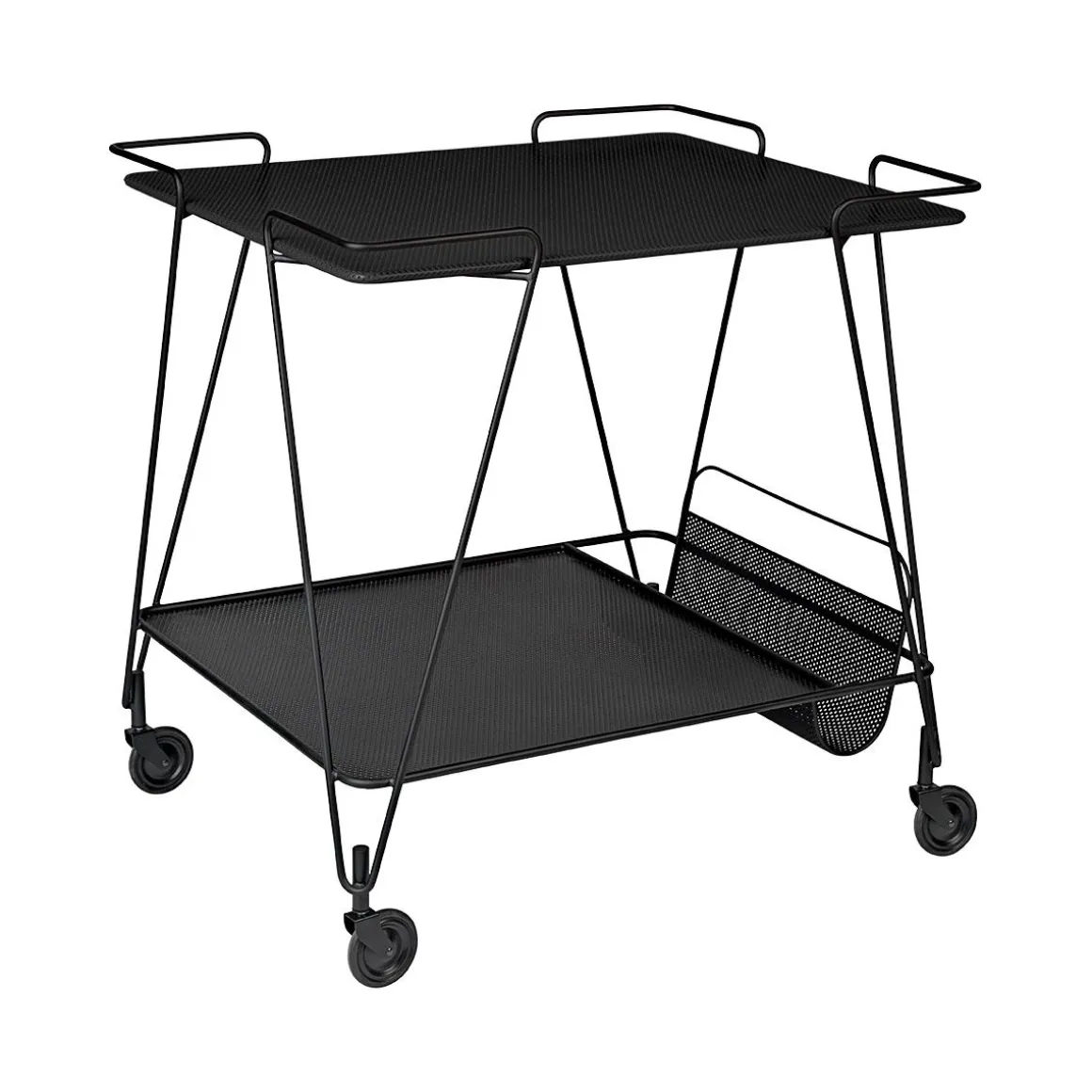 Desserte Matégot de Gubi par Mathieu Matégot. Le maître et fondateur de la technique innovante et révolutionnaire Rigitulle, où le métal perforé est combiné avec des tubes métalliques, Mathieu Matégot, a conçu son chariot à thé entre 1953 et 1954. Le spacieux chariot Matégot est orné de deux plateaux, la tige disponible dans les différentes couleurs et le bas en noir et comprend un porte-journaux qui prouve, avec son design en métal plié, la force de la technique d’être flexible comme le tulle et solide comme le métal.