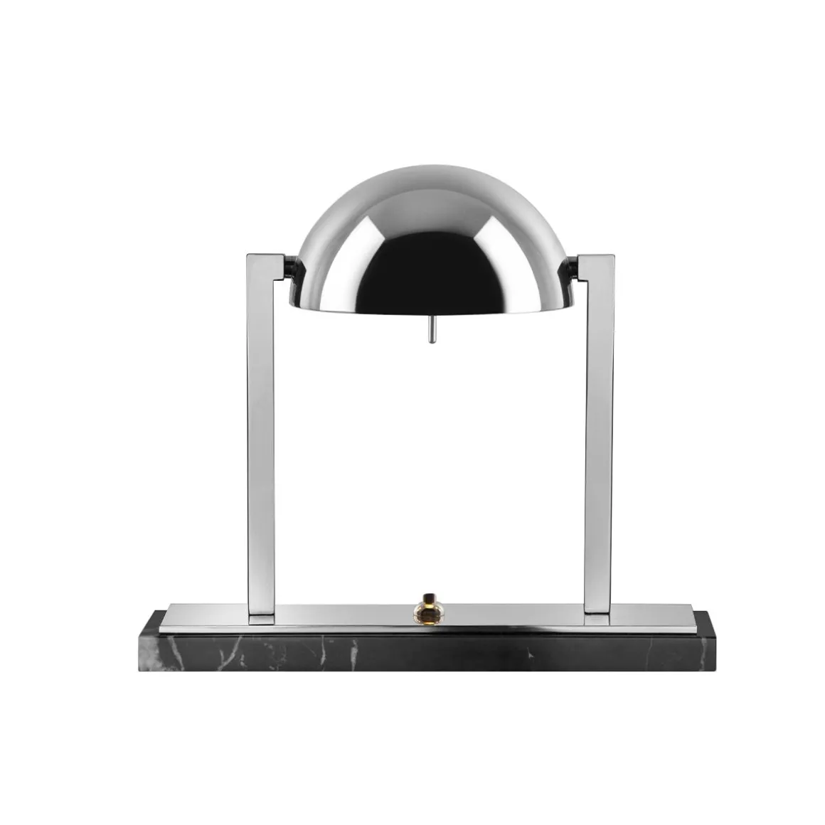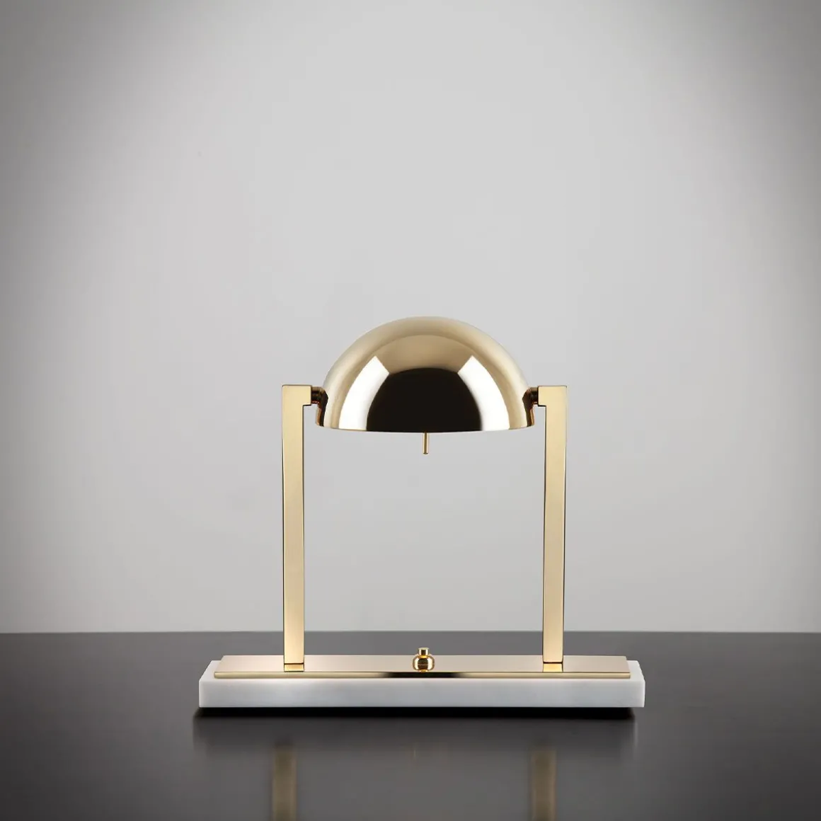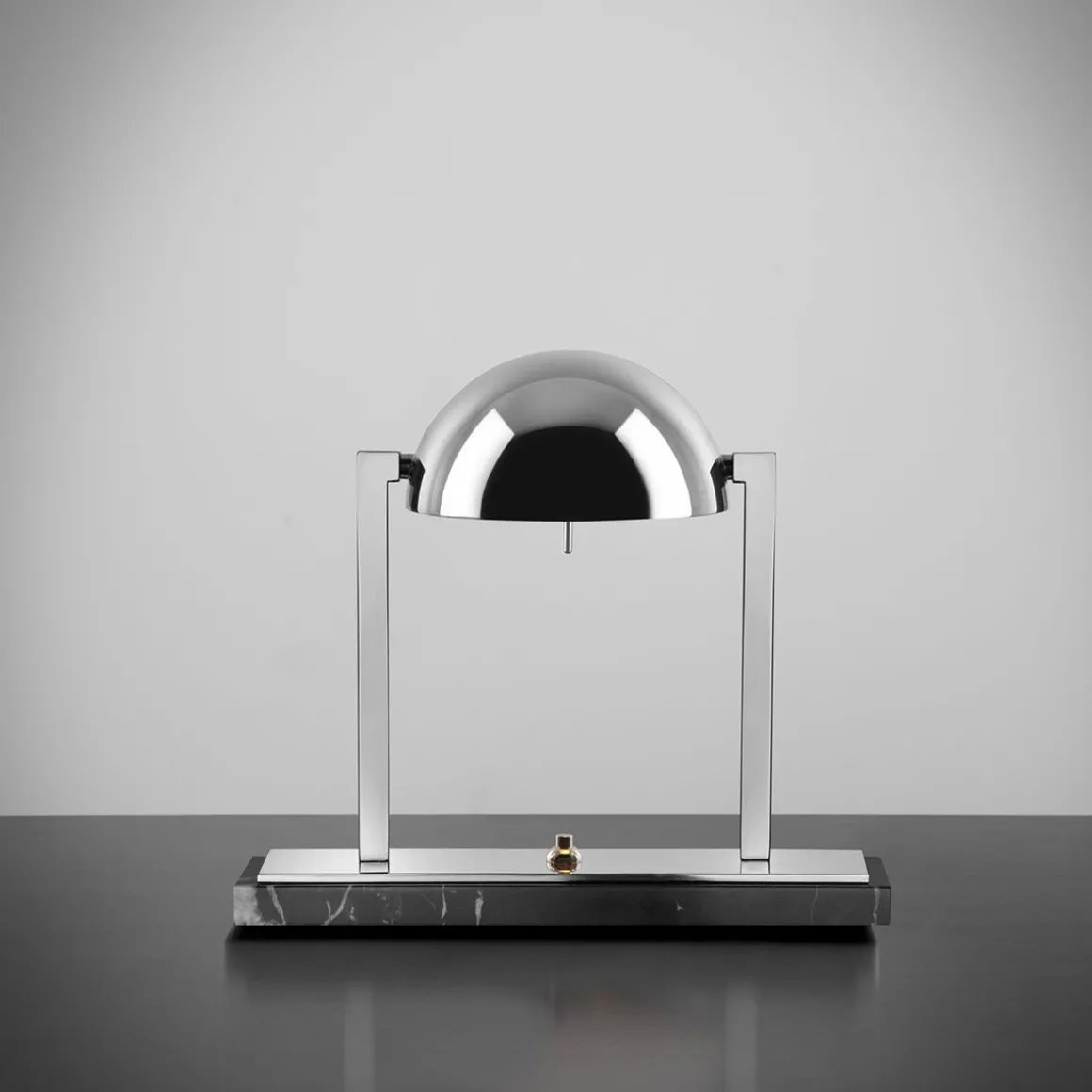 Lampe à poser au design unique, Diane a été imaginée par Jacques Adnet dans les années 1930. Sa géométrie moderniste parfaite se combine harmonieusement avec le raffinement des matériaux, évoquant les images d’un lever de soleil rougeoyant s’élevant lentement à l’horizon. Lampe de table composée d’une calotte hémisphérique métallique orientable avec deux bras latéraux en laiton. Elle repose sur une double base rectangulaire en laiton et soit en marbre noir Marquina, soit en marbre blanc de Carrare. Disponible en finitions Palladium ou Or fin.