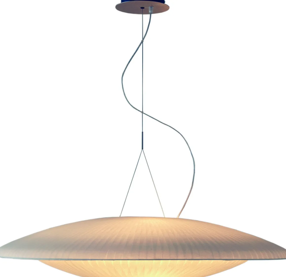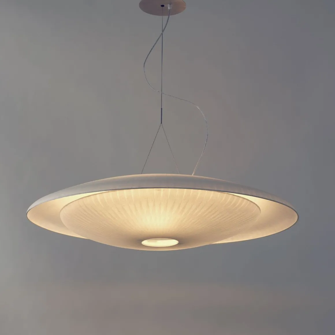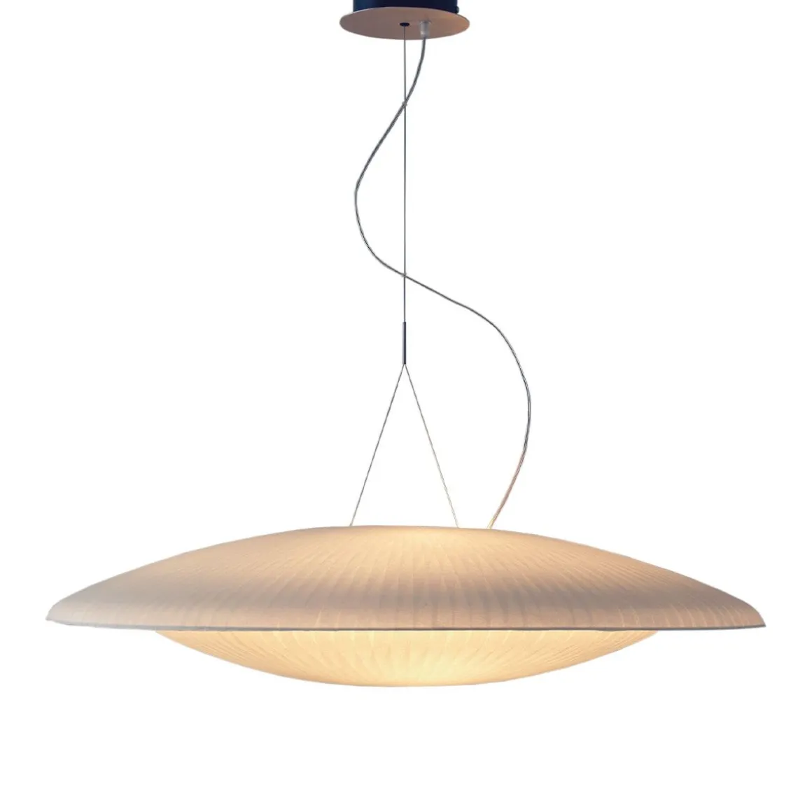 Élégante et classique, la Diva est une lumière douce et raffinée. Une structure légère en acier supporte une grande coupole de papier. Une autre coupole plus petite et inversée projette la lumière sur la partie supérieure.