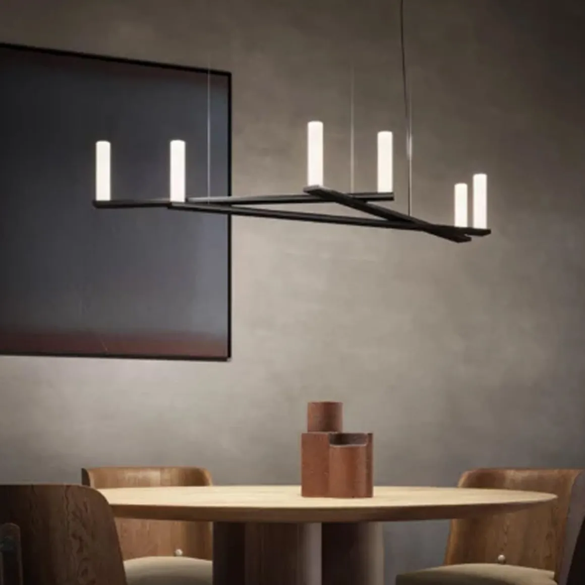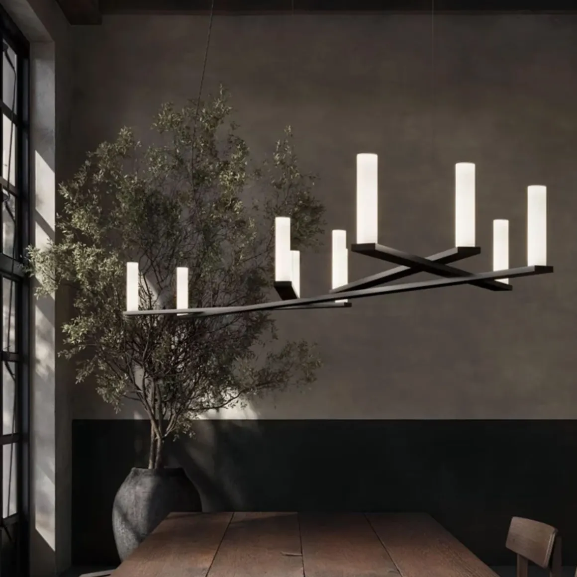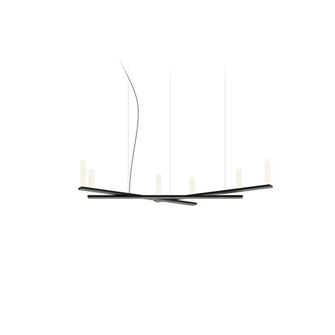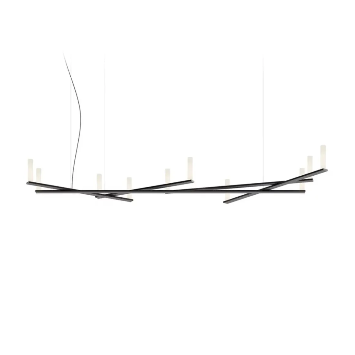 Dix Bougies présente une structure technique composée d’une longue extrusion horizontale en aluminium et de quatre autres parties qui s’entrecroisent de manière asymétrique et apparemment aléatoire. Le courant circule à l’intérieur des bras et est acheminé jusqu’aux extrémités, où les sources lumineuses LED sont sublimées par un diffuseur en papier sophistiqué à base de cellulose et de fibres synthétiques.