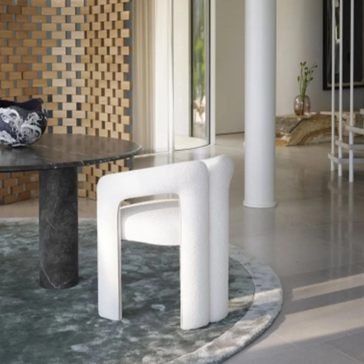 Le fauteuil est très évocateur et fait fortement référence au design des années 70. Dudet est une petite architecture définie par trois éléments rembourrés individuels : un coussin d’assise et deux tubulaires qui dessinent avec fluidité les jambes, les accoudoirs et le dossier dans une ligne continue. L’aspect doux et confortable du fauteuil Dudet frappe immédiatement mais, sous ses courbes accueillantes, il a une âme consciente car il se démonte facilement. Un système innovant qui, dans un souci de circularité, permet de séparer son noyau métallique du rembourrage en mousse de polyuréthane réalisé avec un pourcentage de polyols issus de sources biologiques. Cela facilite à la fois l’élimination séparée et le recyclage des matériaux nobles, à commencer par le noyau en acier.