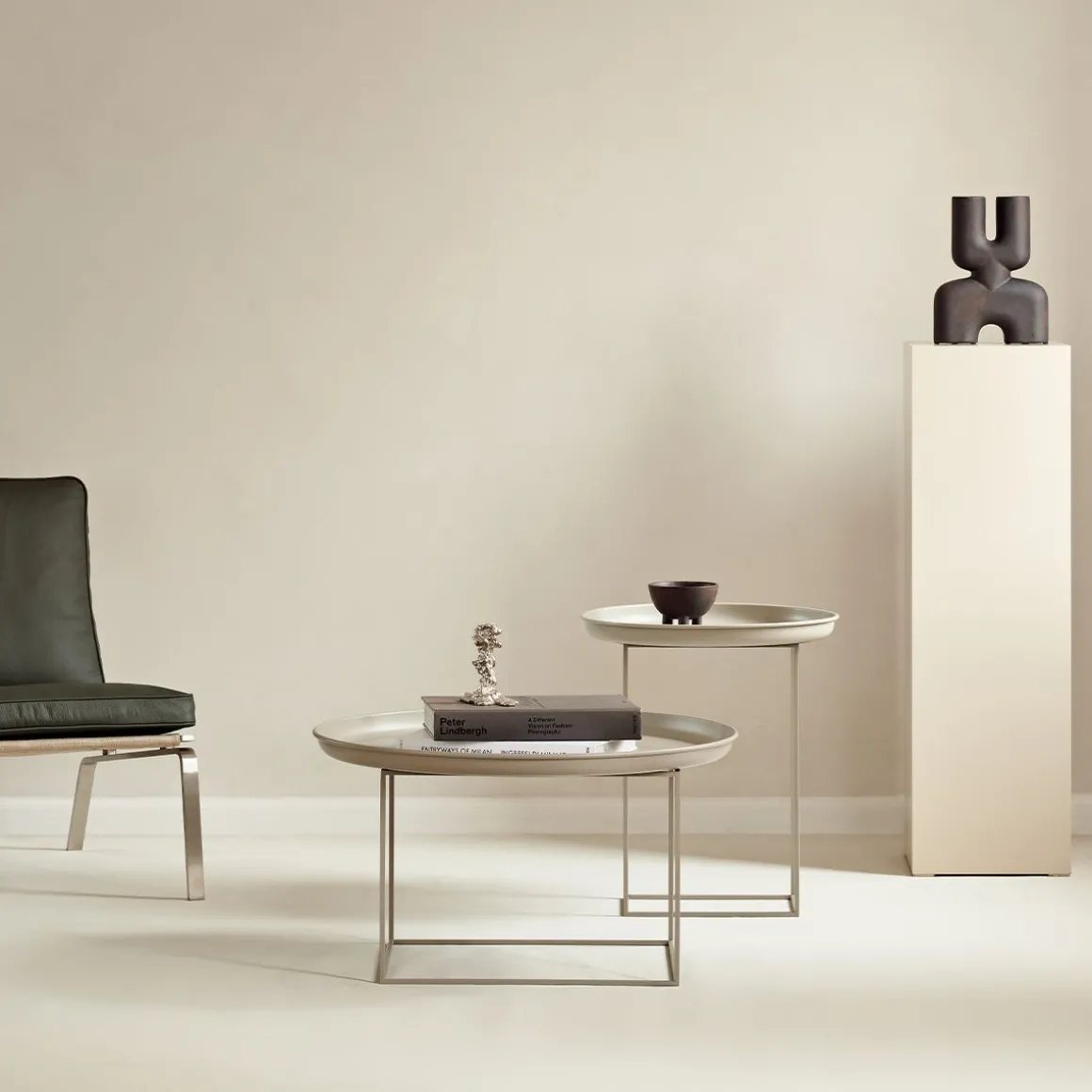 Une série de tables d’appoint et de tables basses multifonctionnelles avec un plateau en métal filé placé librement sur un cadre en métal. Fabriquée en acier thermolaqué, la table Duke est un meuble multifonctionnel disponible en trois tailles différentes. Le dessus du plateau peut facilement être soulevé et la base peut être tournée à différentes hauteurs. La combinaison des trois tailles crée un paysage qui complète n’importe quel décor.